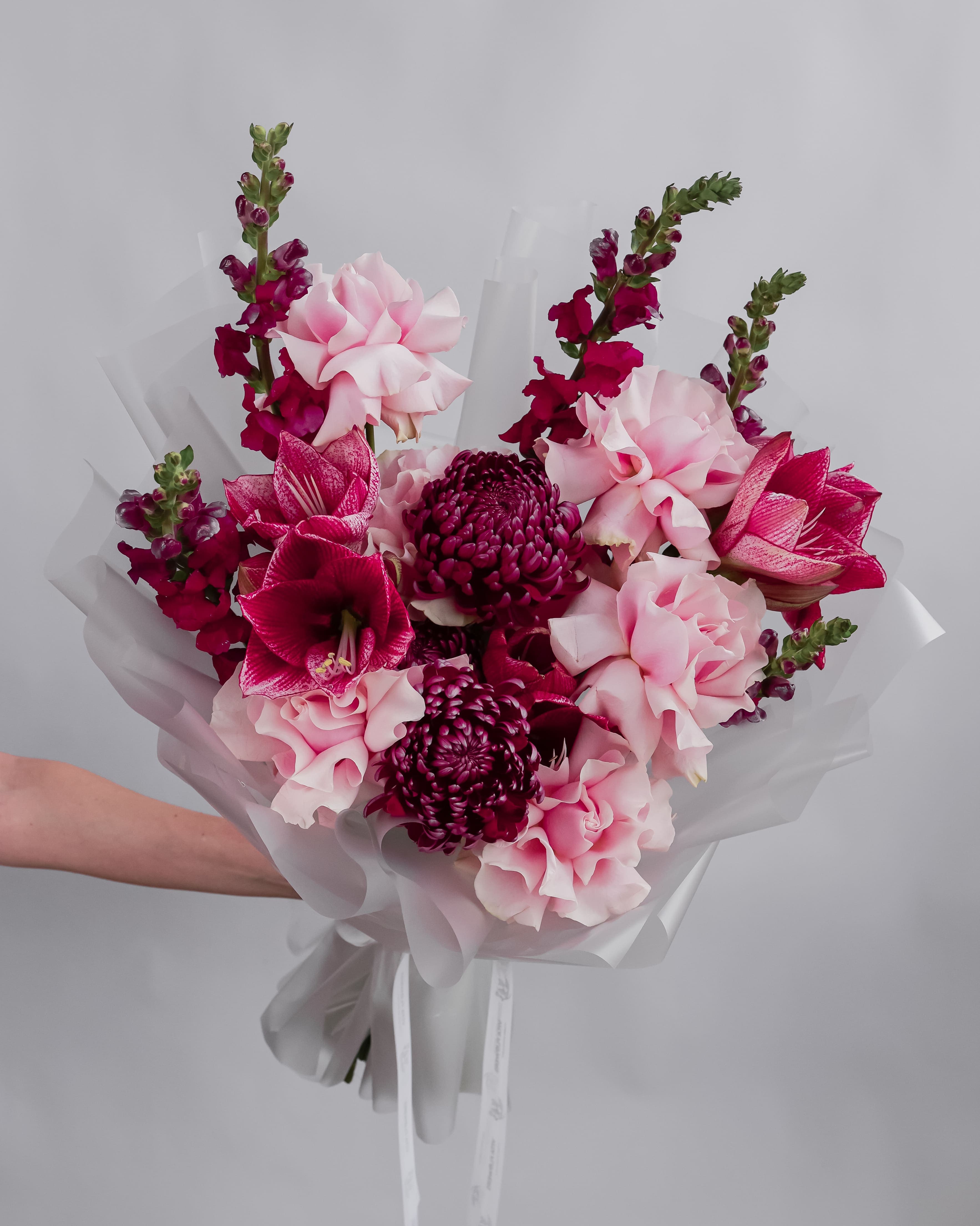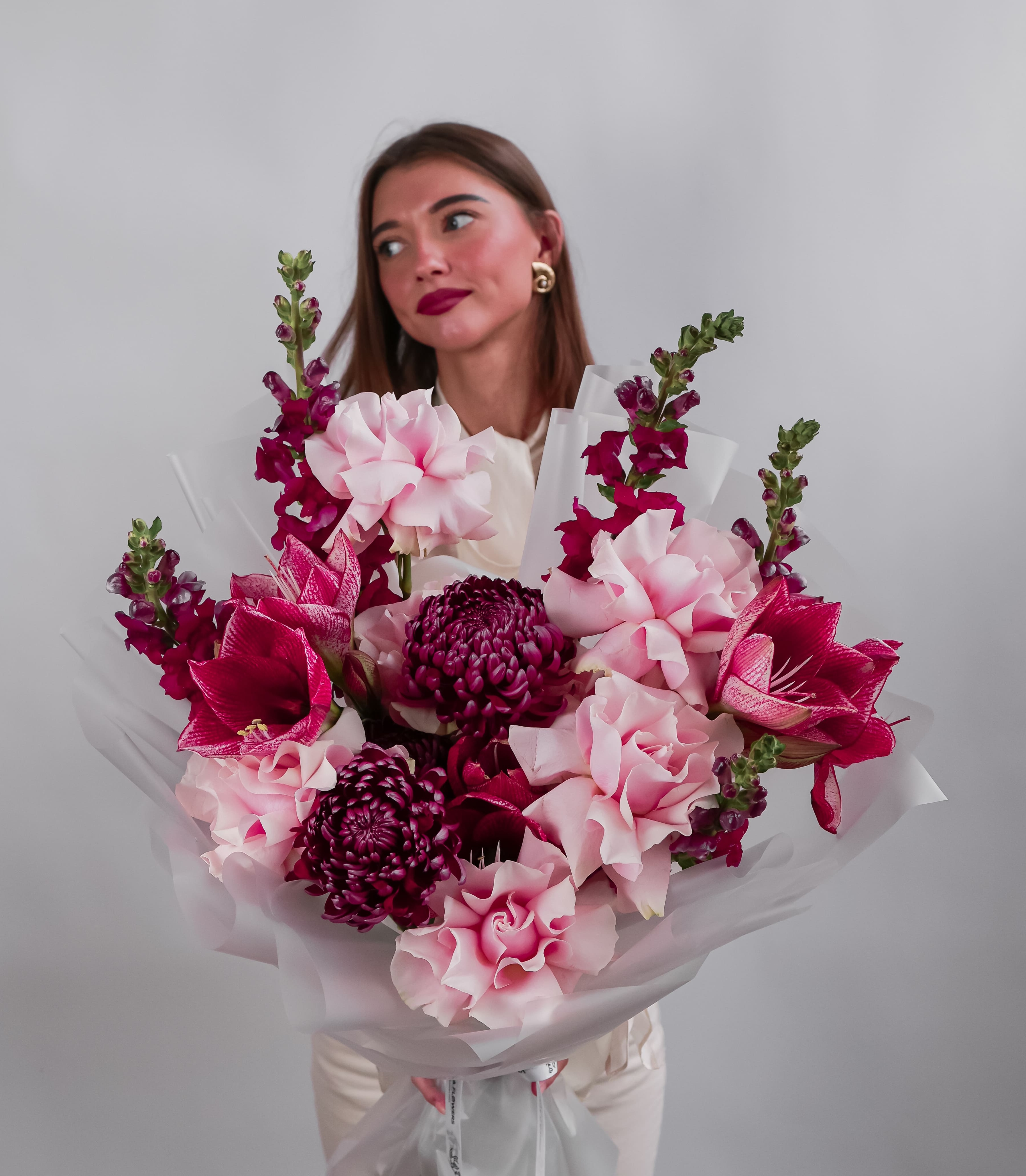 Композиция объединяет роскошный амариллис, эквадорские розы, антирринум и одноголовую хризантему. Букет получается динамичным, ярким и рельефным.