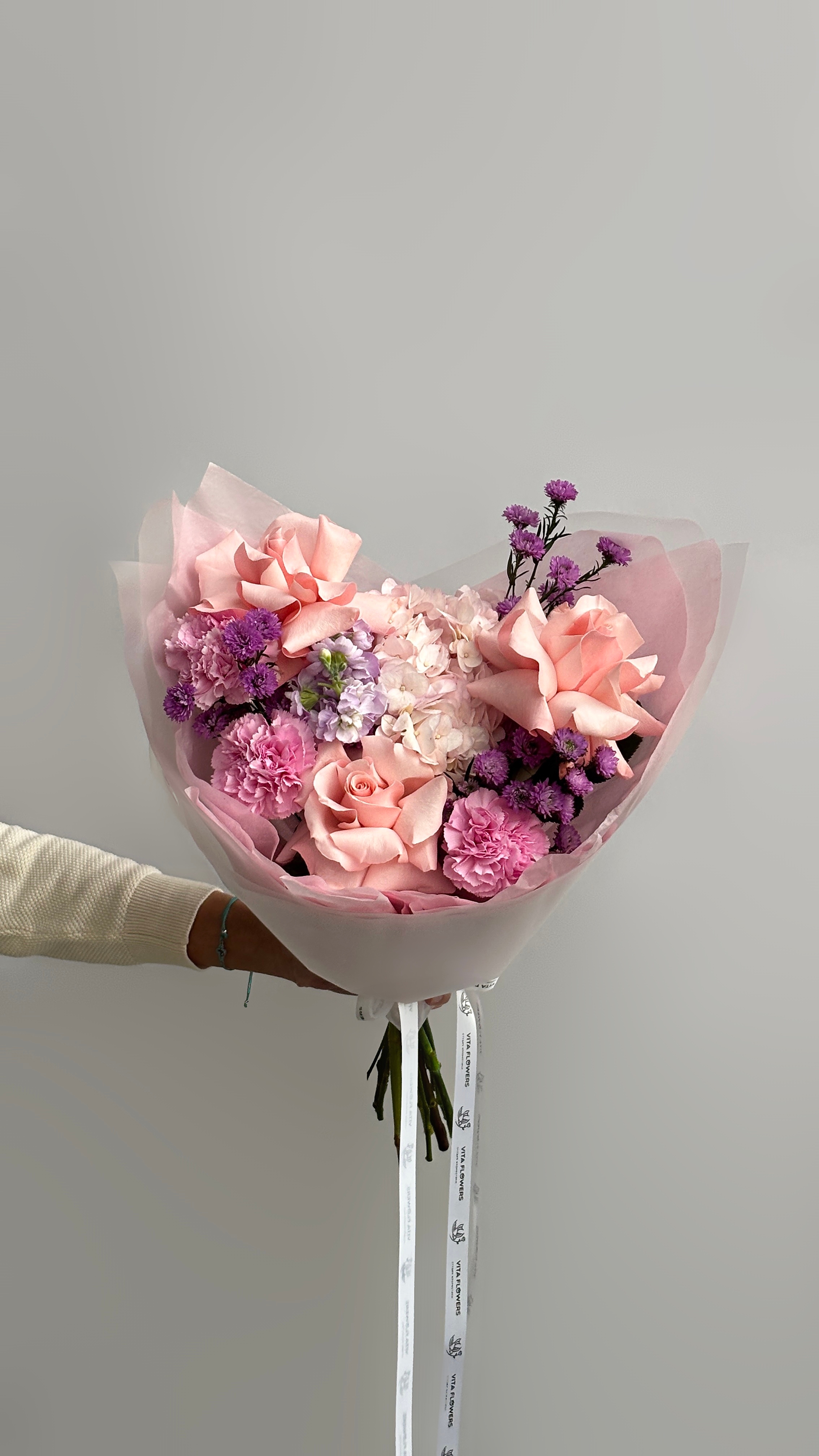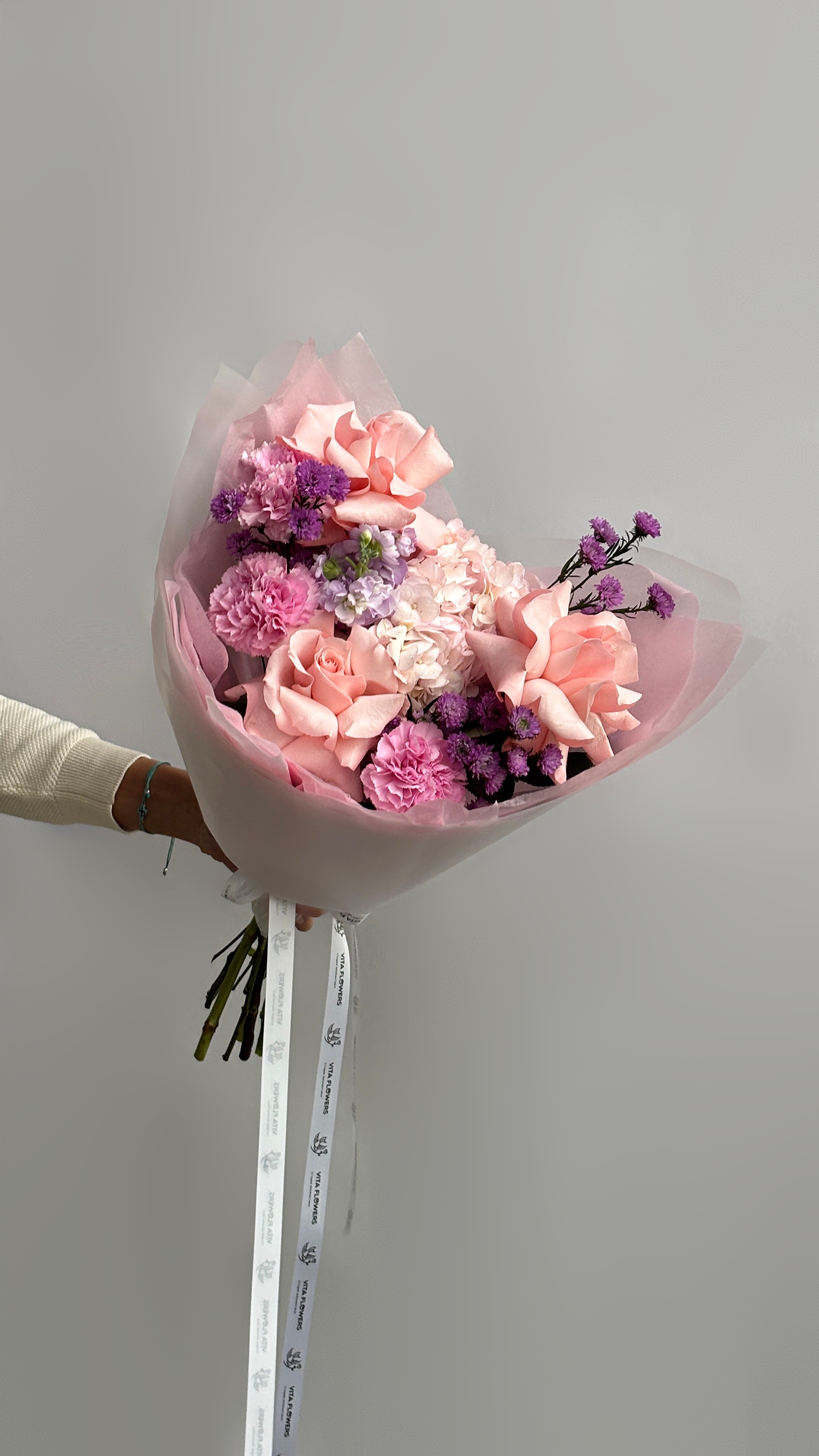 Гортензия, эквадорская роза, астра, маттиола и диантусы создают фактурный и нежный букет. Объёмная гортензия делает его визуально богатым.