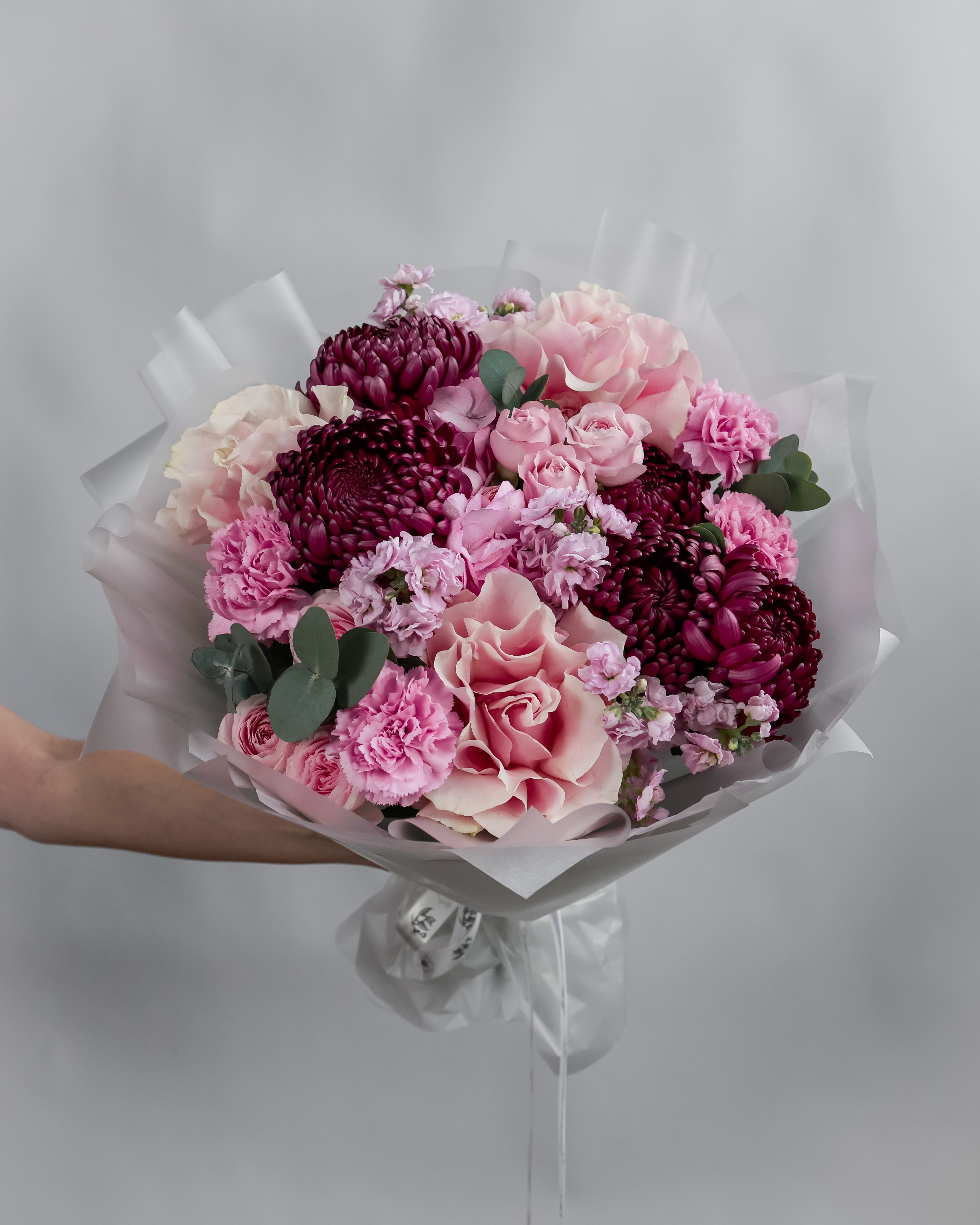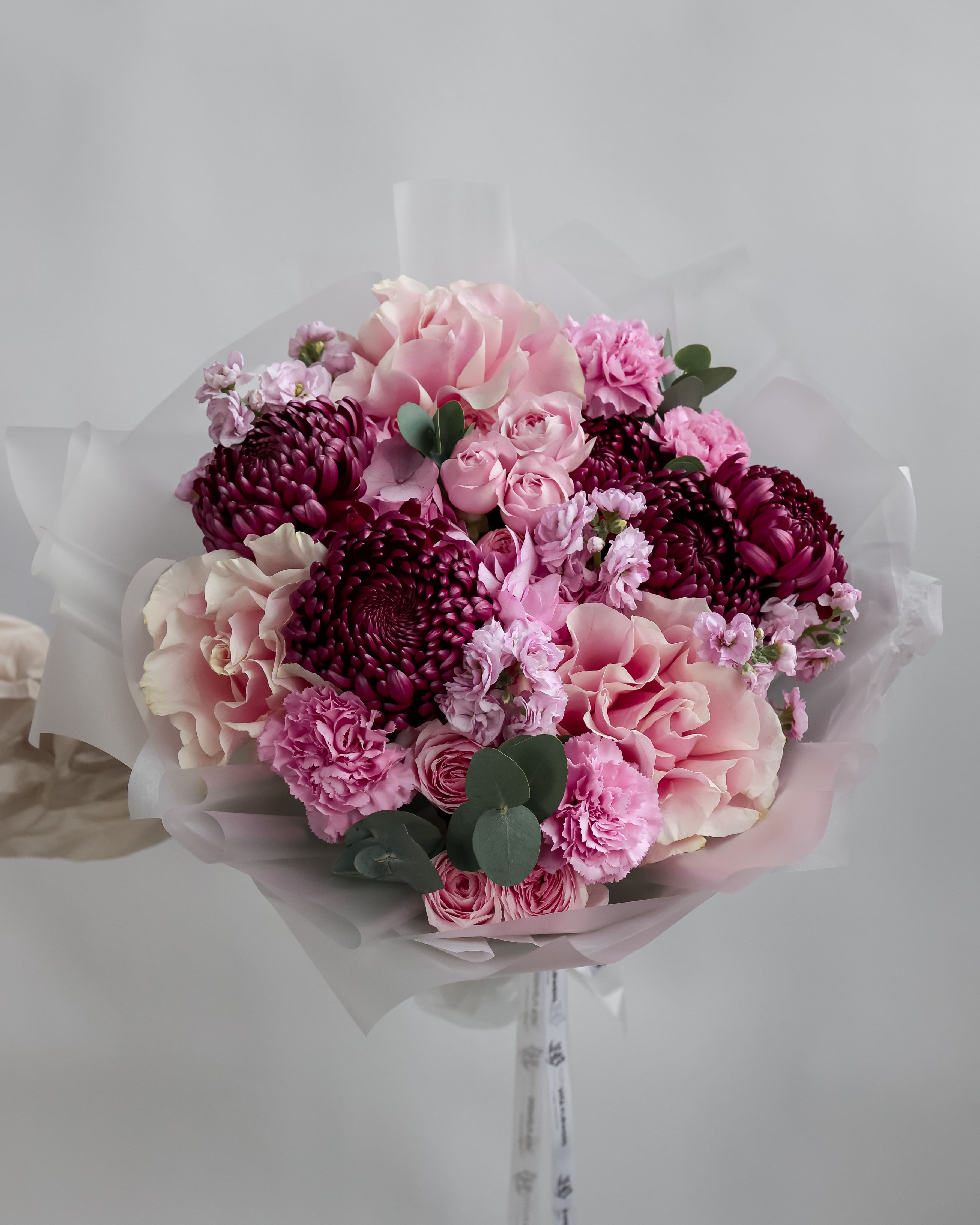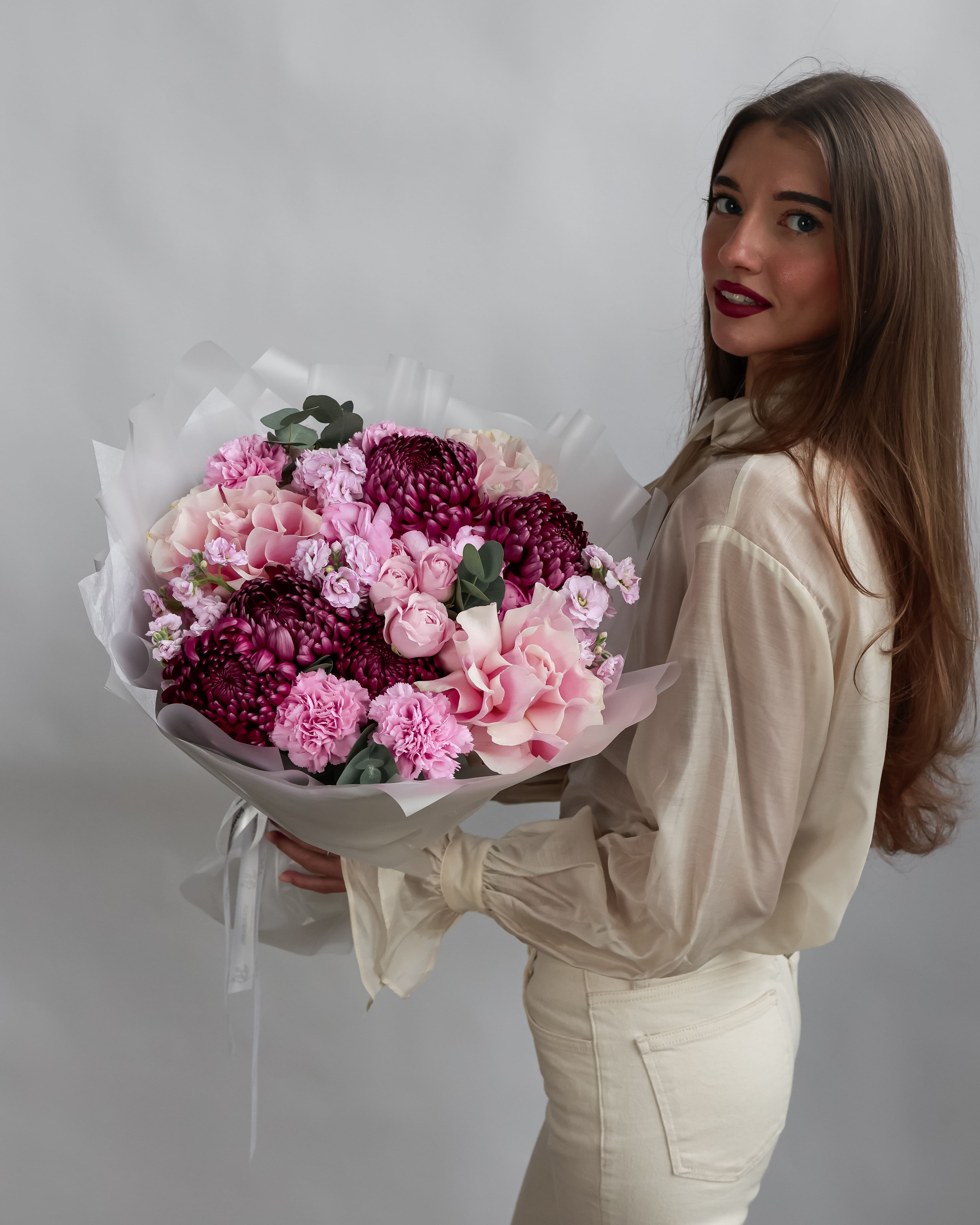Композиция включает гортензию, эквадорские и кустовые розы, одноголовую хризантему, маттиолу, диантусы и высокий эвкалипт. Разнообразие фактур делает букет премиальным и насыщенным.