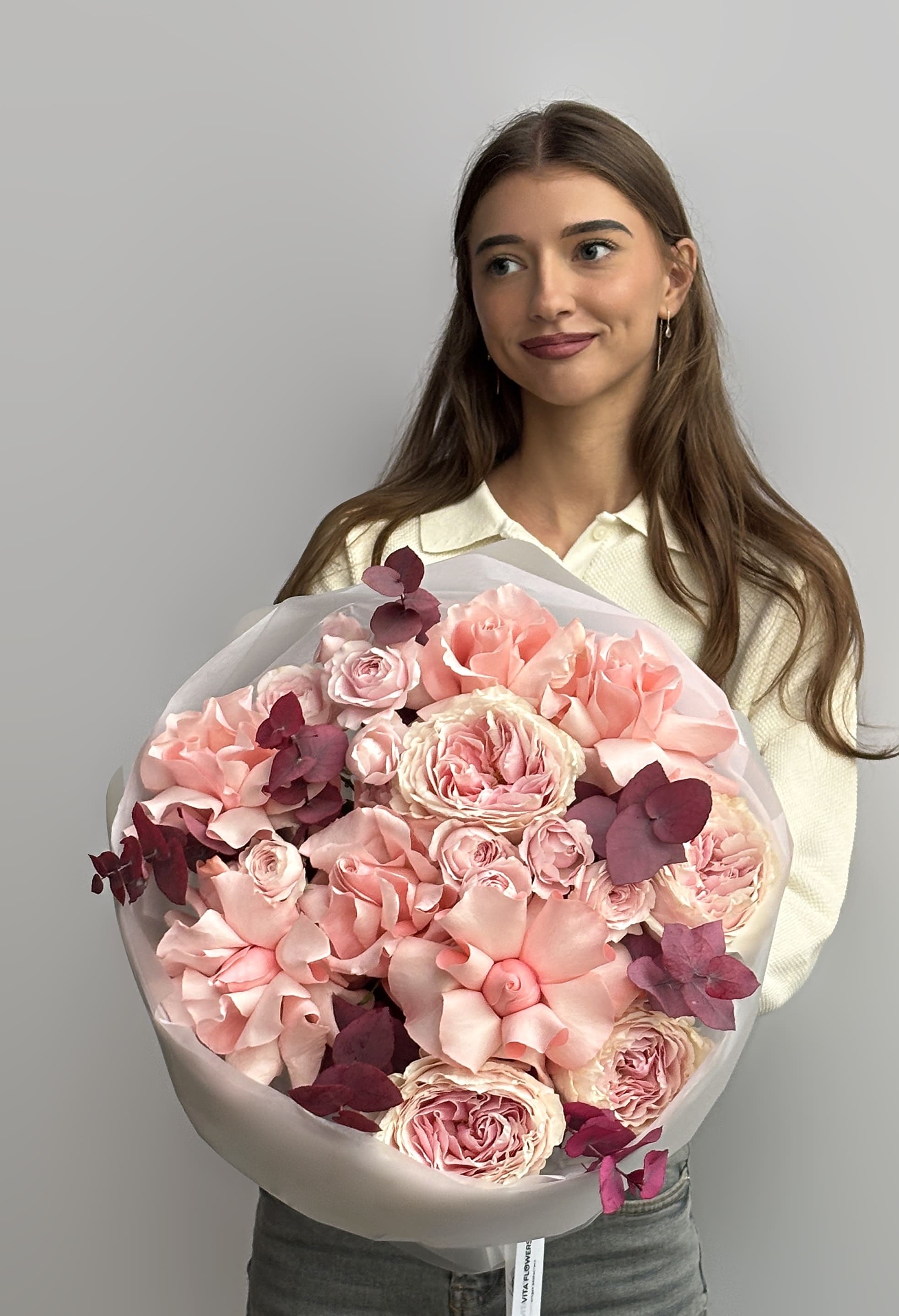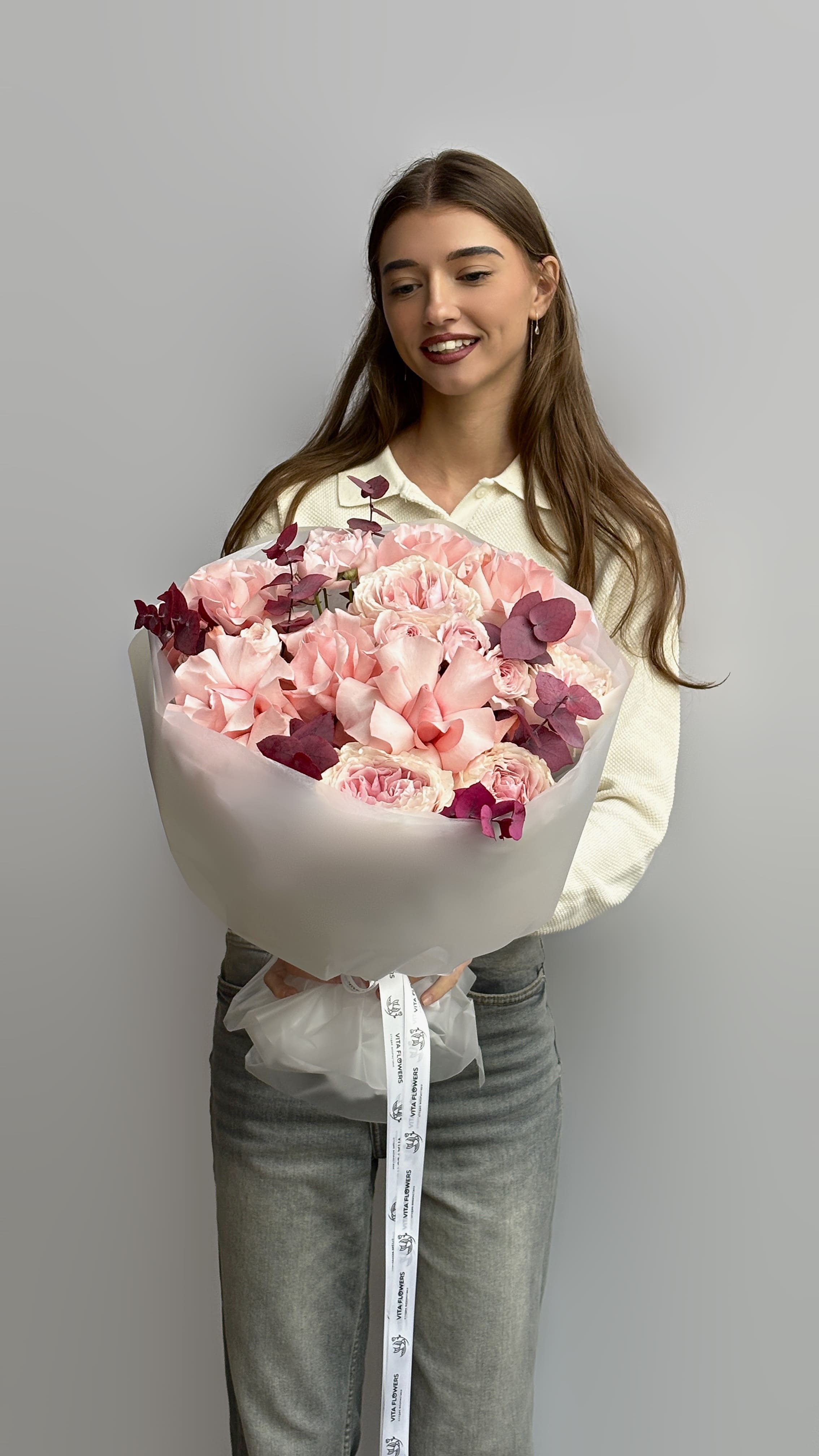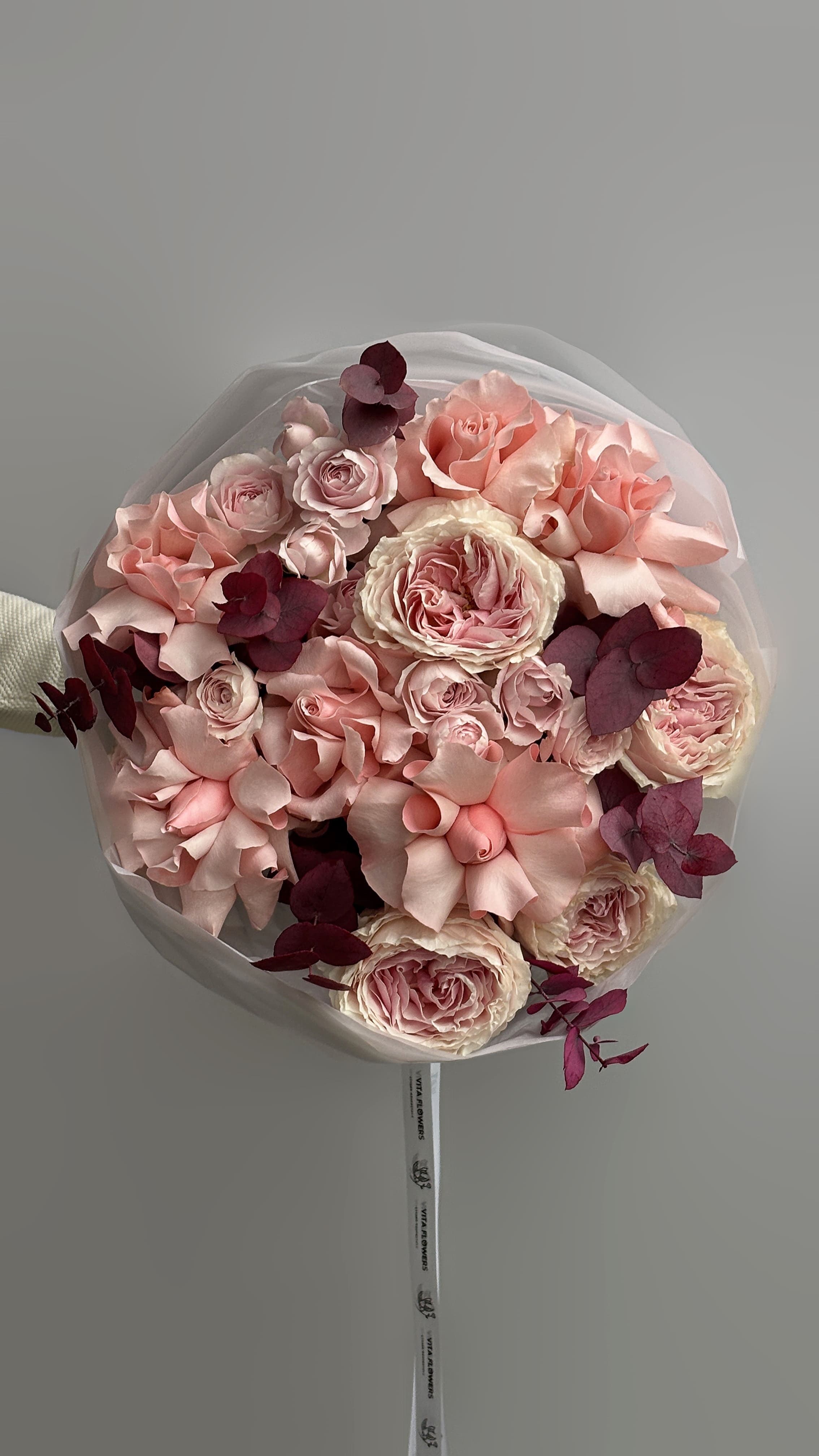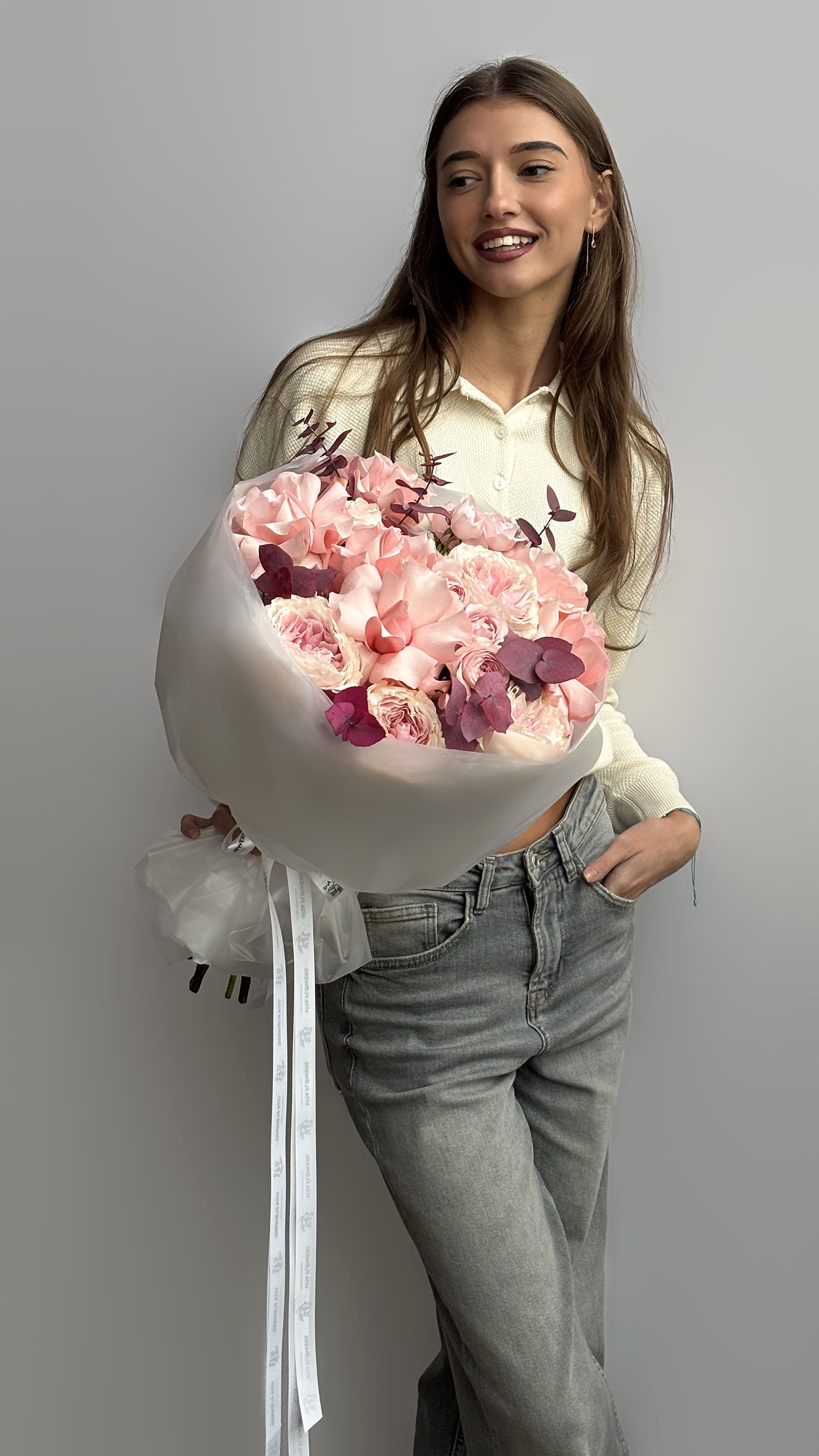 Пионовидная роза, эквадорская роза, кустовые розы и стабилизированный эвкалипт создают утончённую и современную композицию. Фактура и форма бутонов делают букет объёмным и благородным.