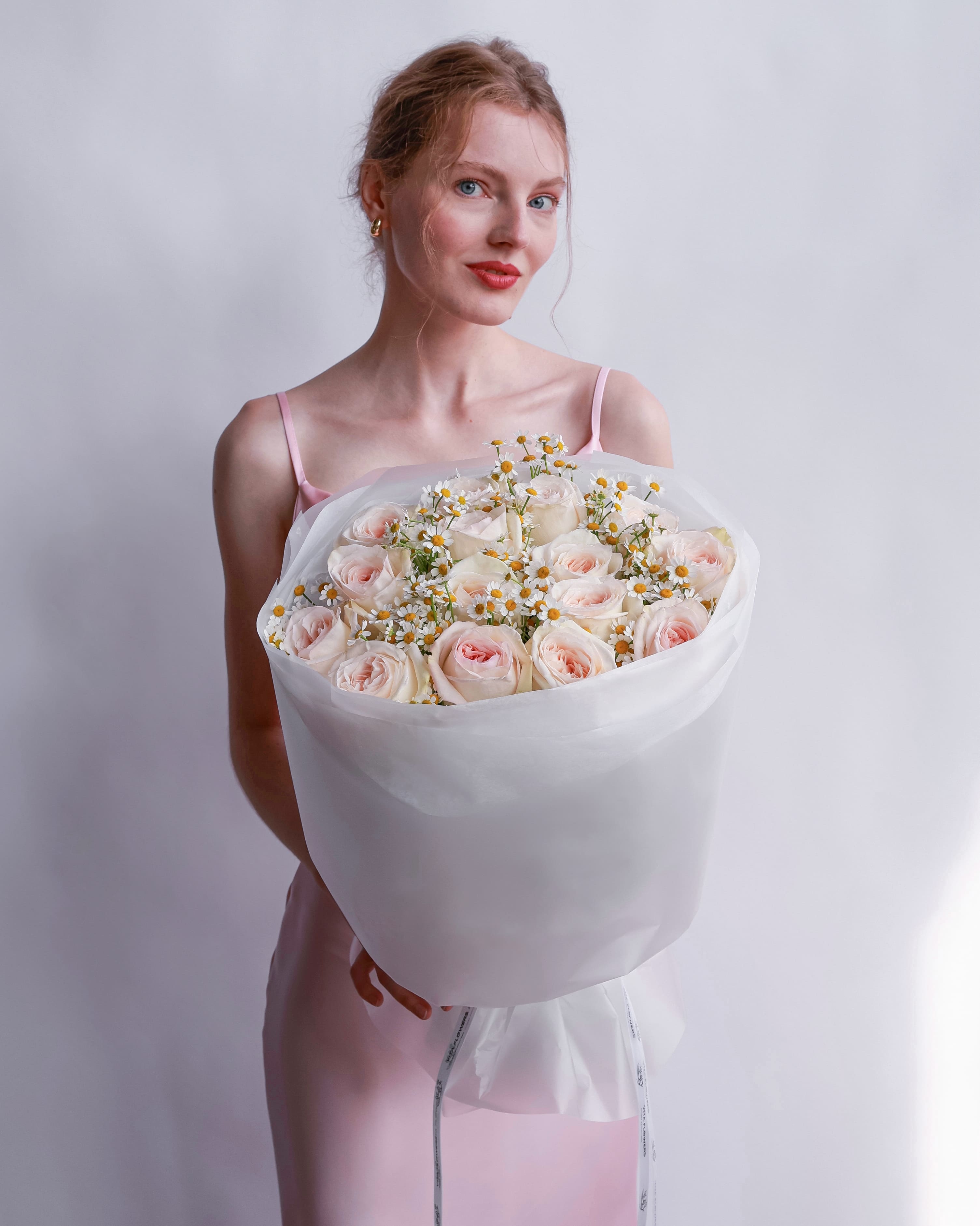 Подходит для любого повода — от лёгкого флирта до искреннего признания. Легкость ромашки и роскошь роз делают композицию универсальной.