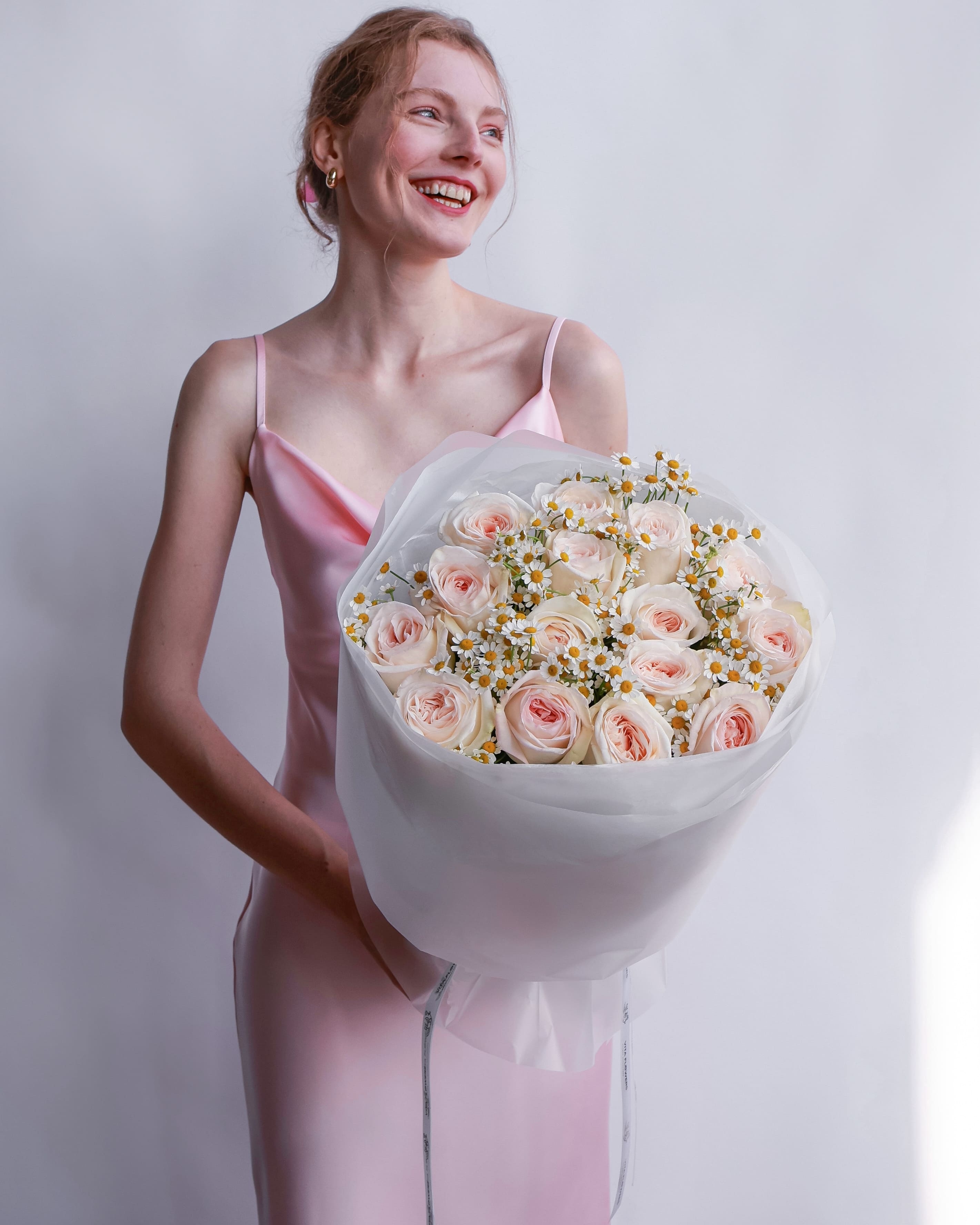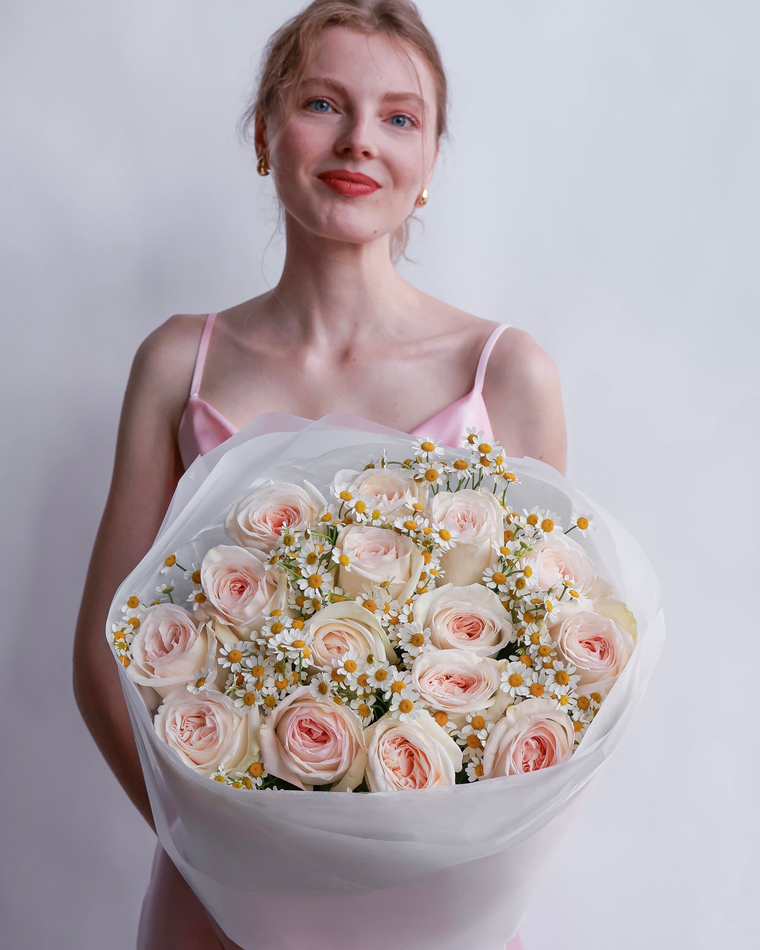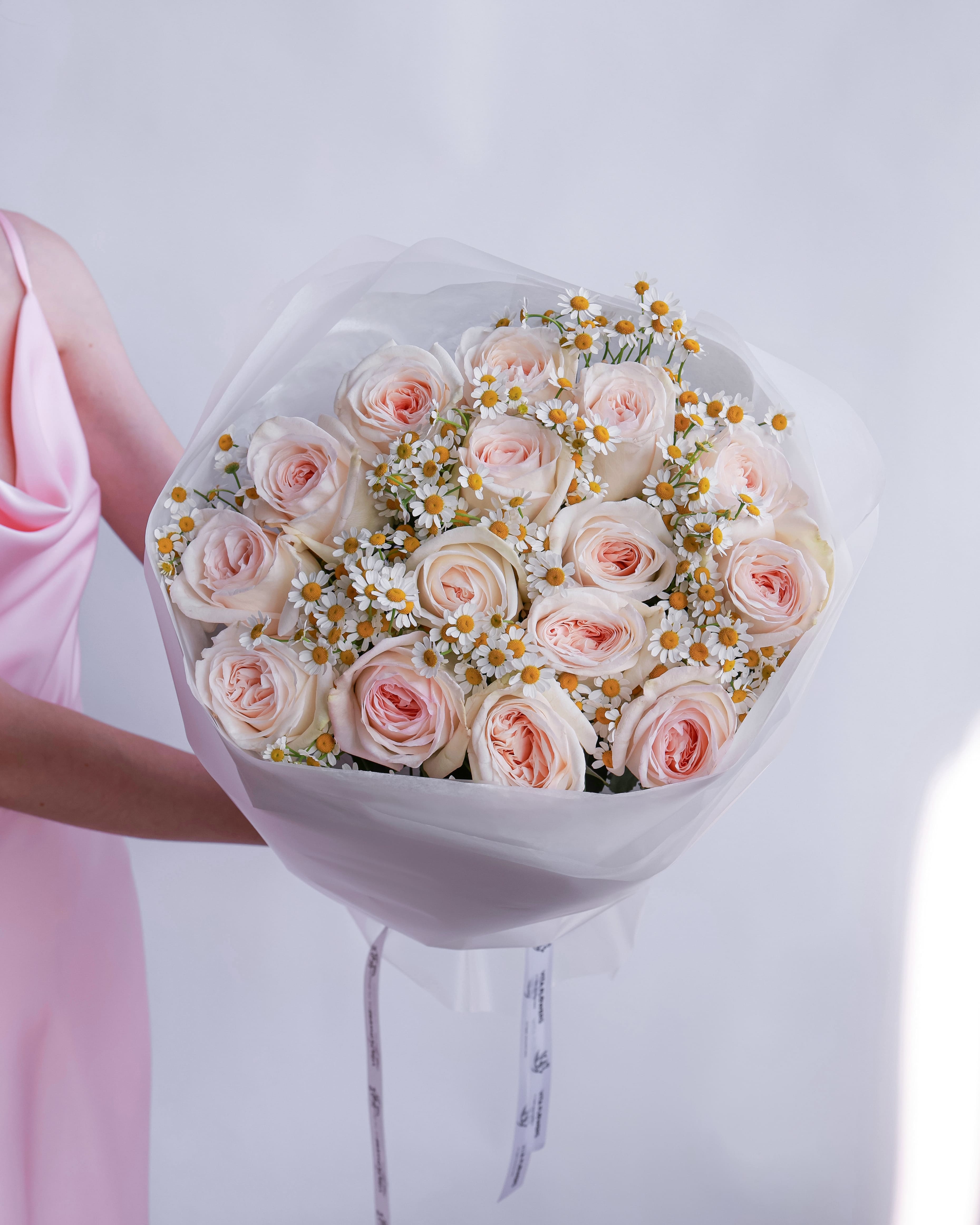 Очаровательное сочетание утончённой пионовидной розы и солнечной ромашки создаёт атмосферу тепла и радости. Этот букет будто собран на летнем поле, но при этом выглядит изысканно и современно.