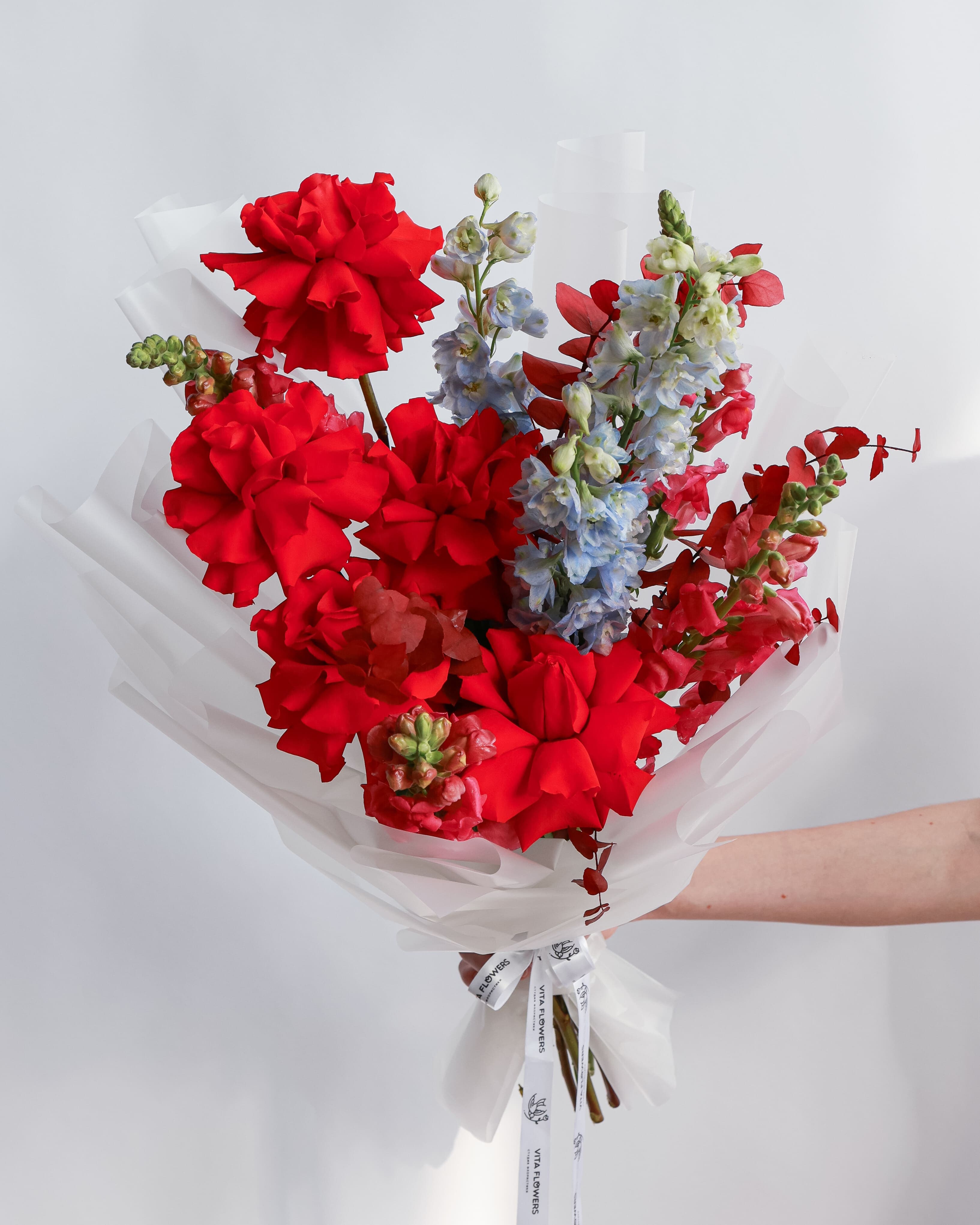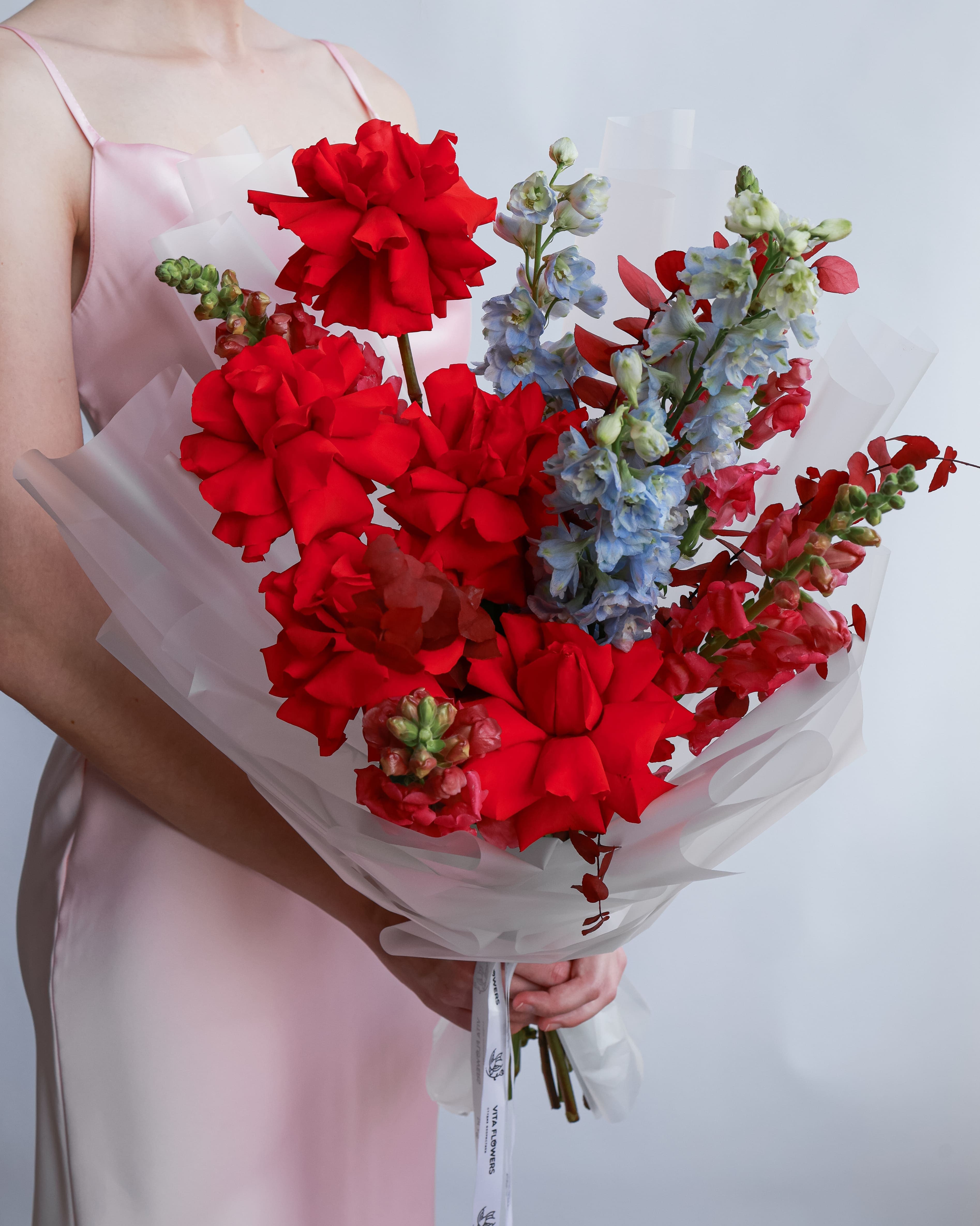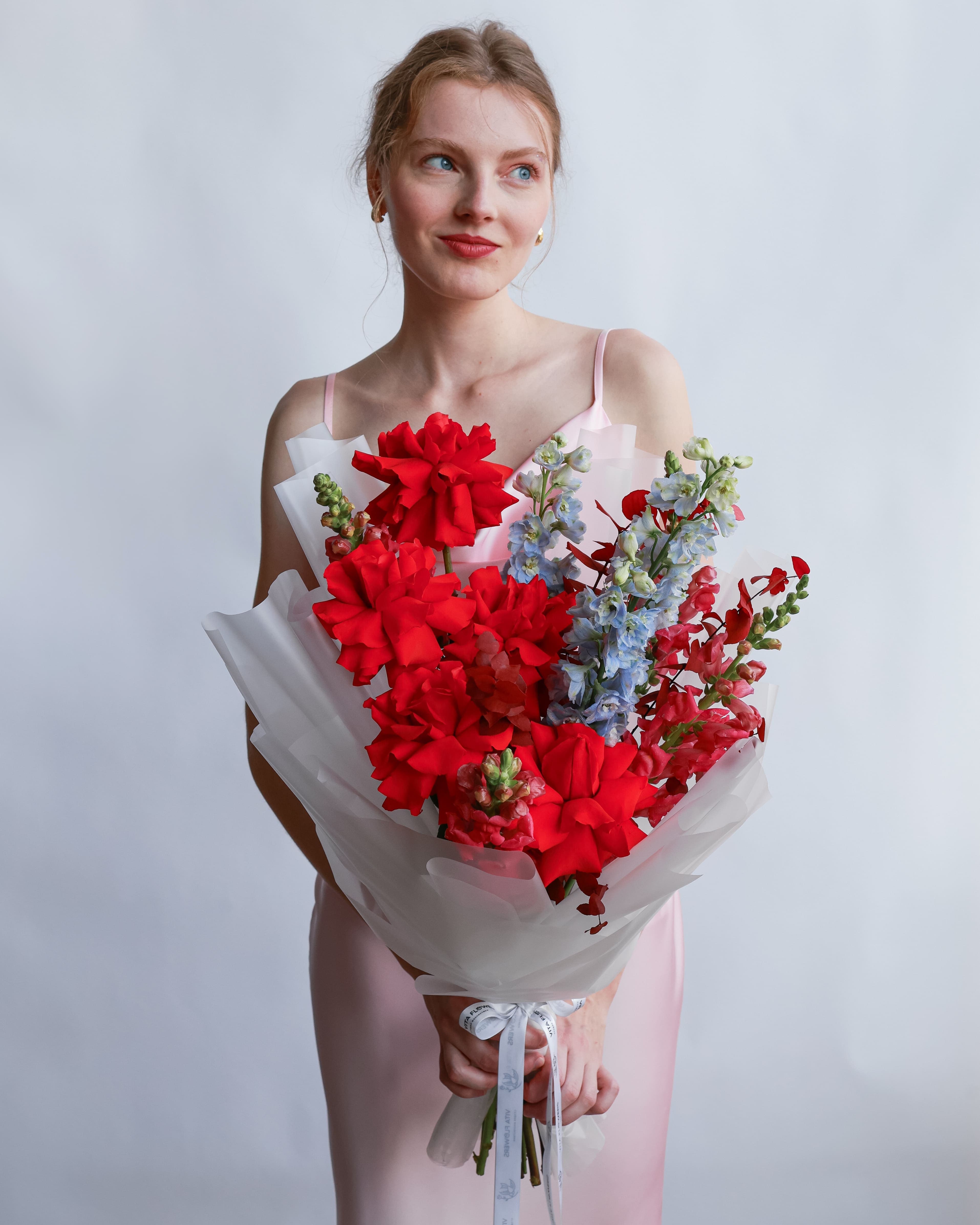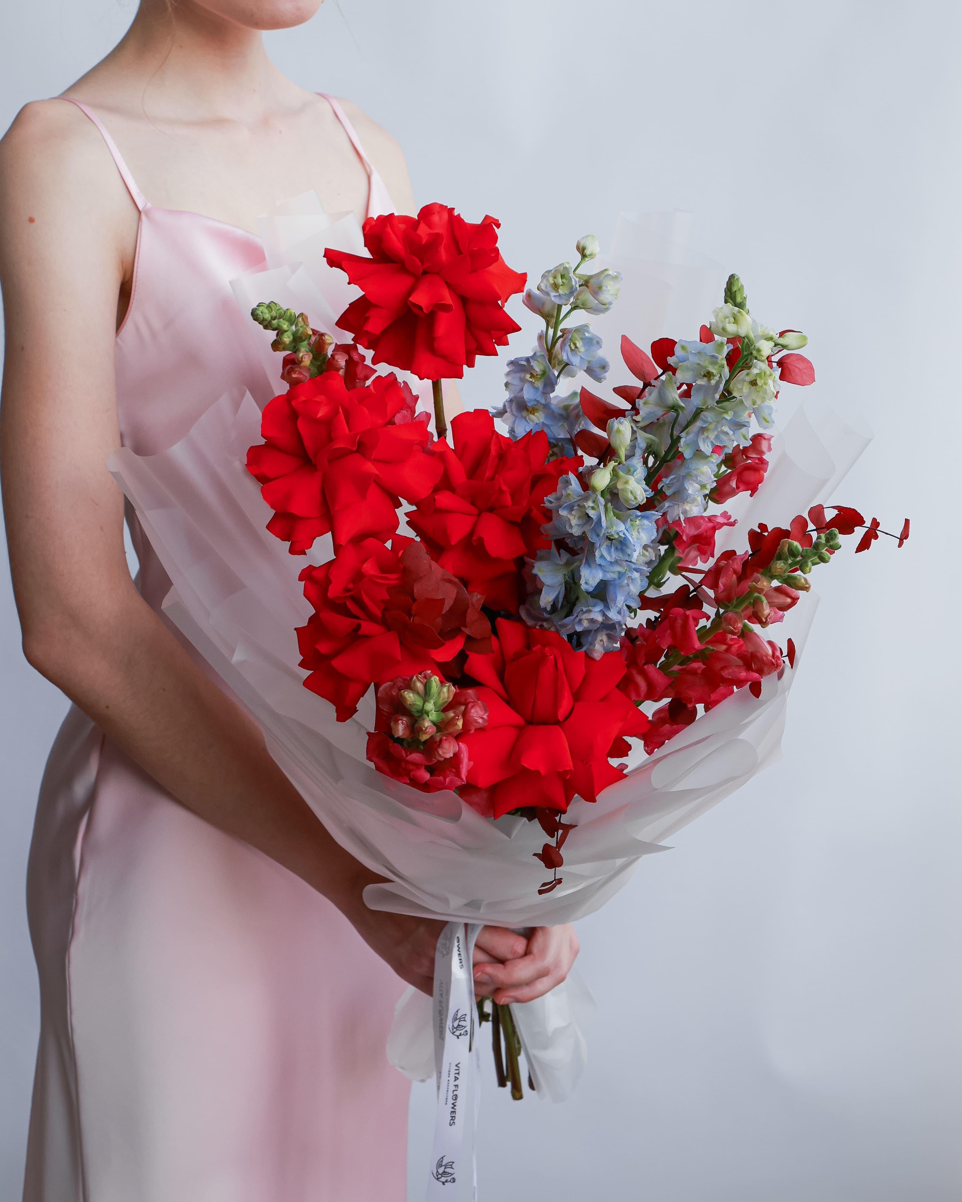 Элегантный букет с эквадорской розой и дельфиниумом создан для тех, кто ценит сдержанную роскошь и природную гармонию. Нежные оттенки и вертикальные линии антирринума придают композиции лёгкость, а эвкалипт добавляет аромат свежести.