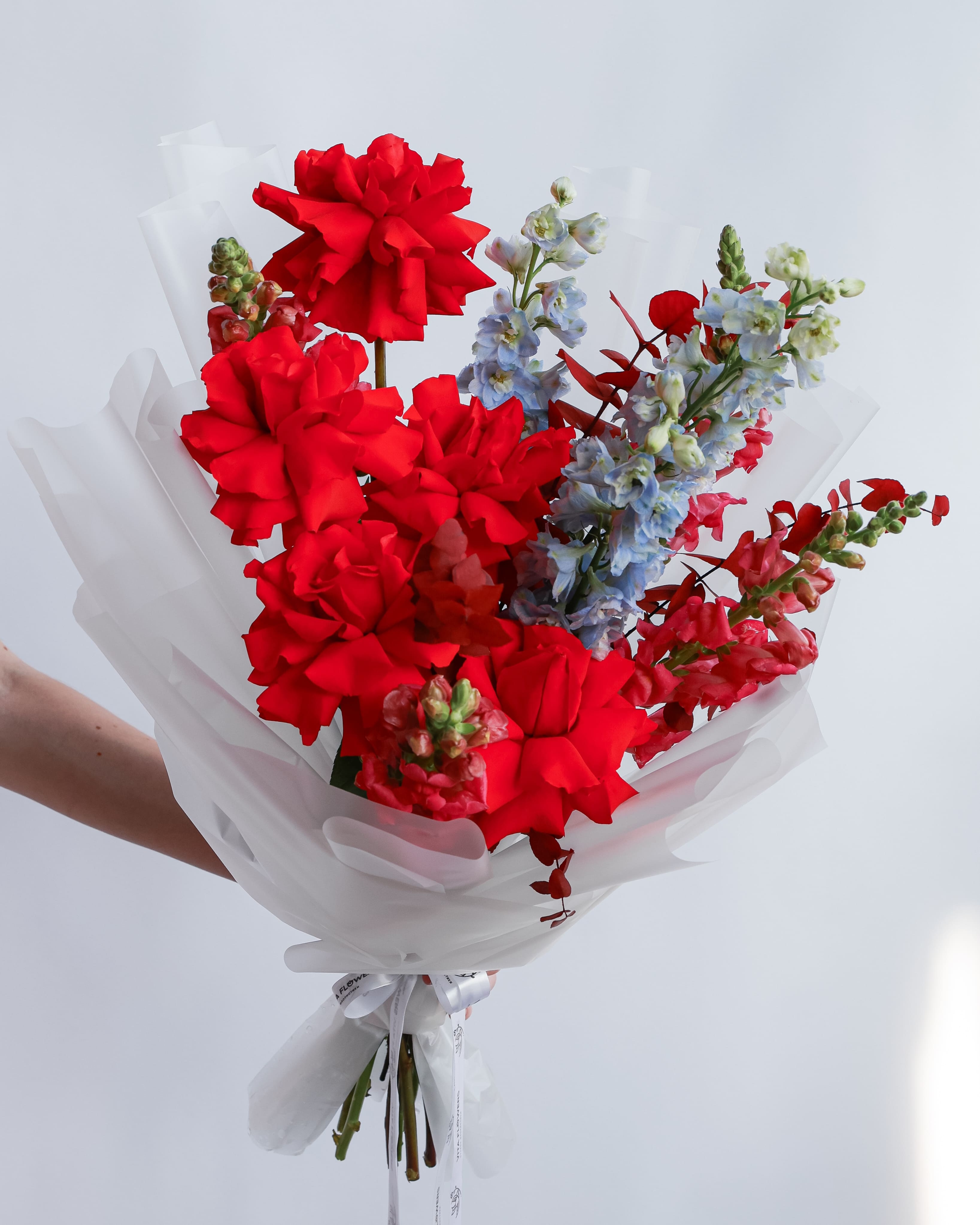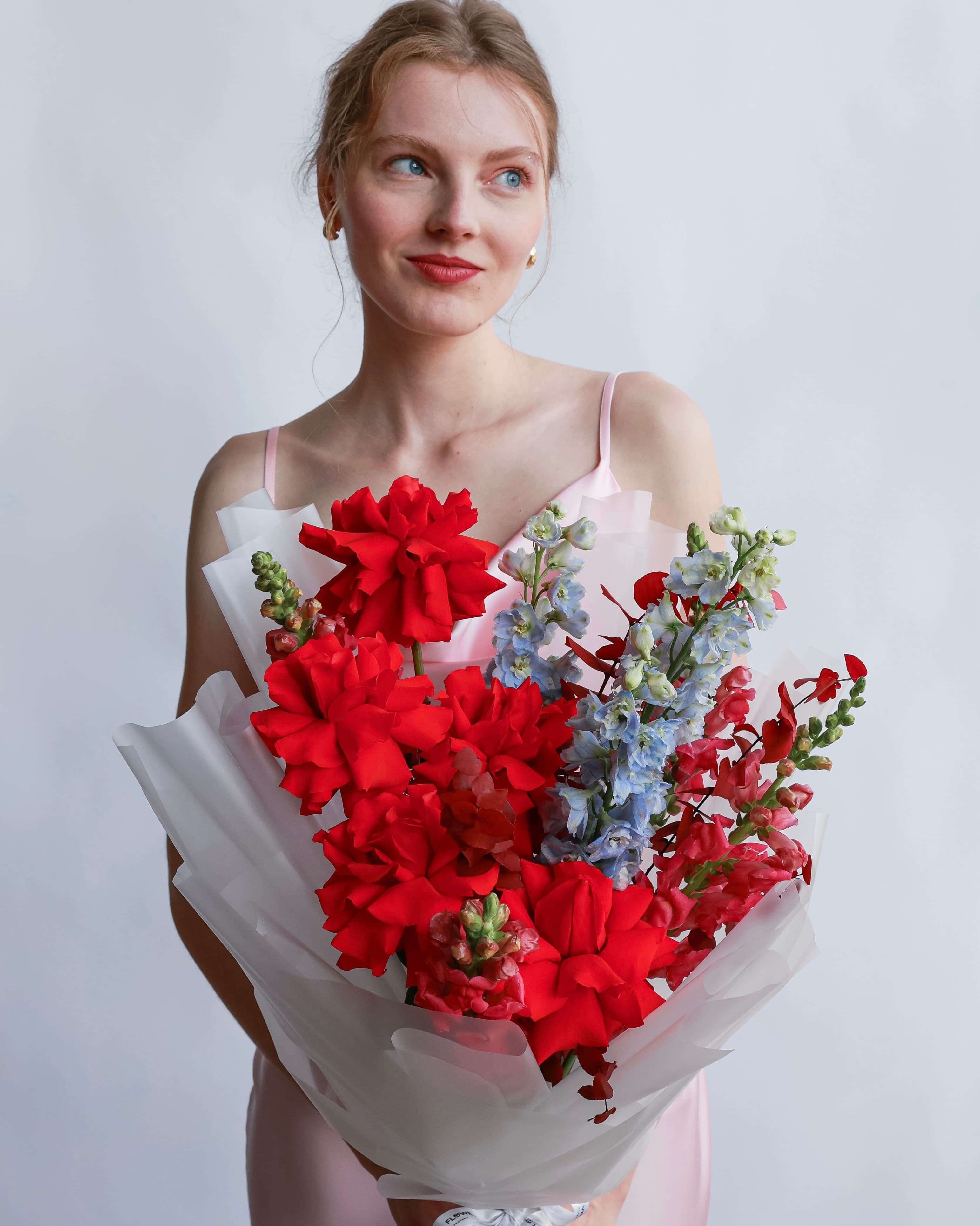Элегантный букет с эквадорской розой и дельфиниумом создан для тех, кто ценит сдержанную роскошь и природную гармонию. Нежные оттенки и вертикальные линии антирринума придают композиции лёгкость, а эвкалипт добавляет аромат свежести.