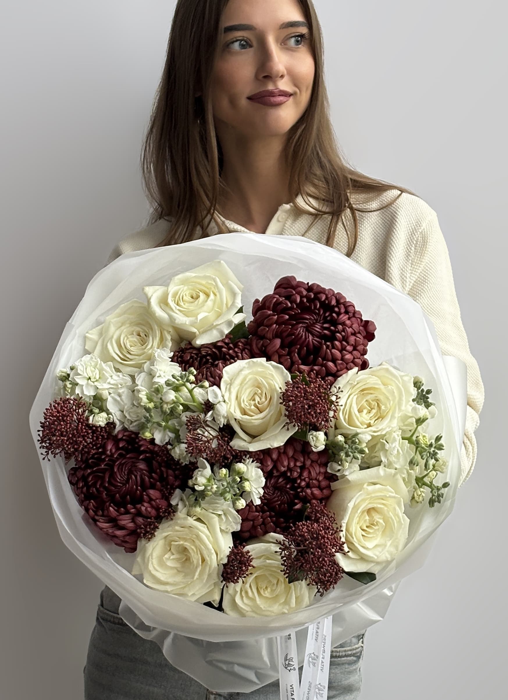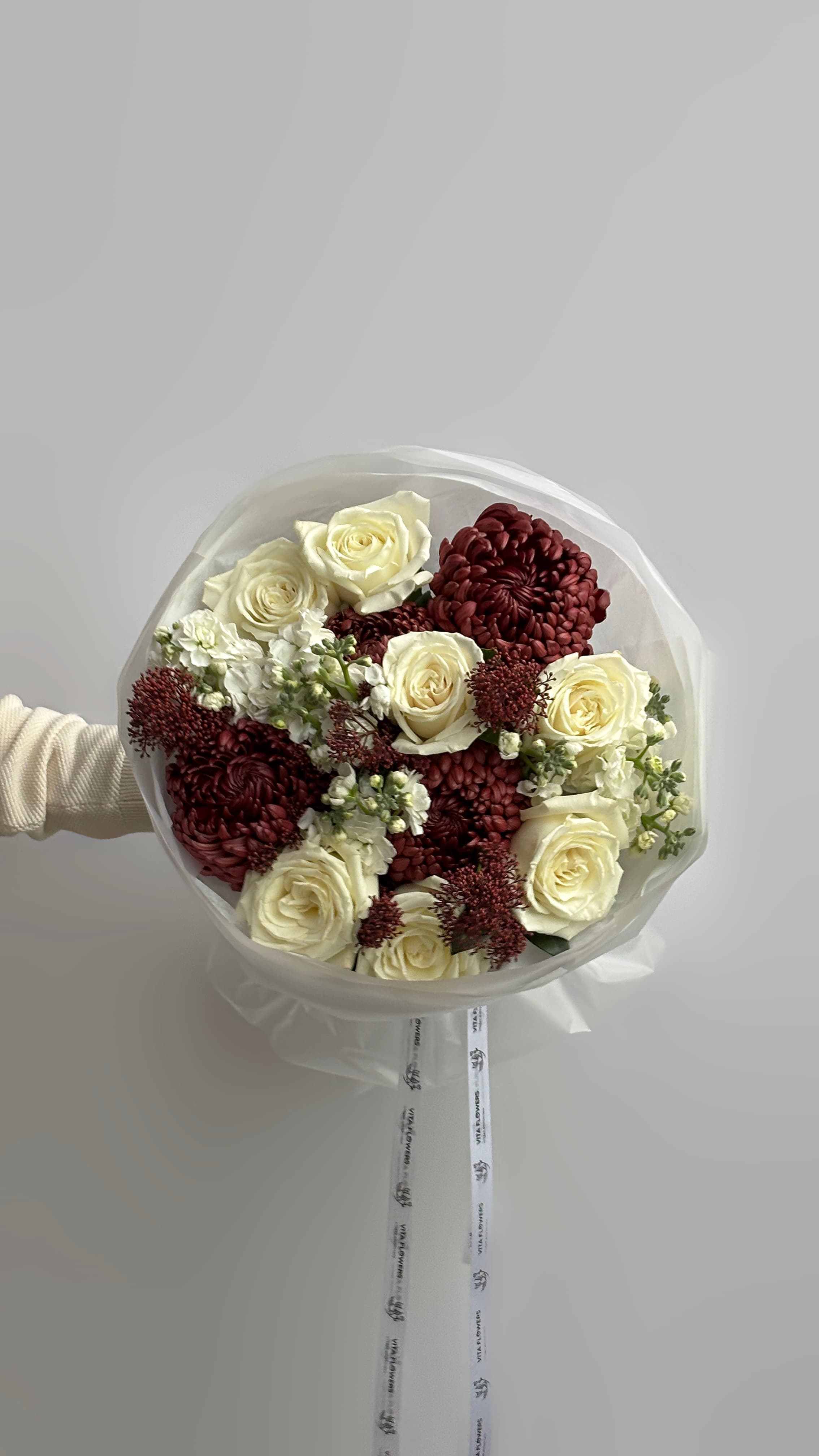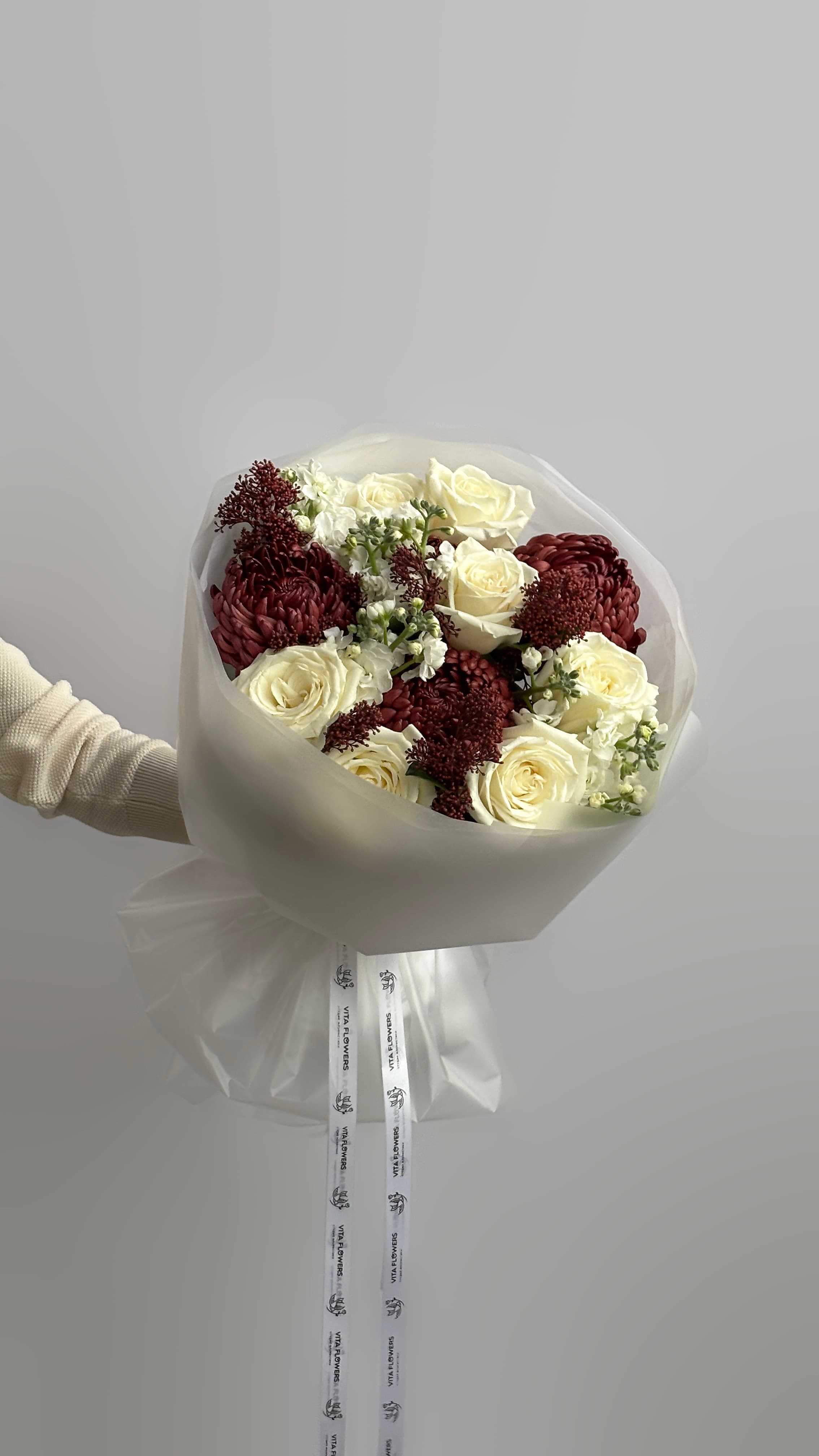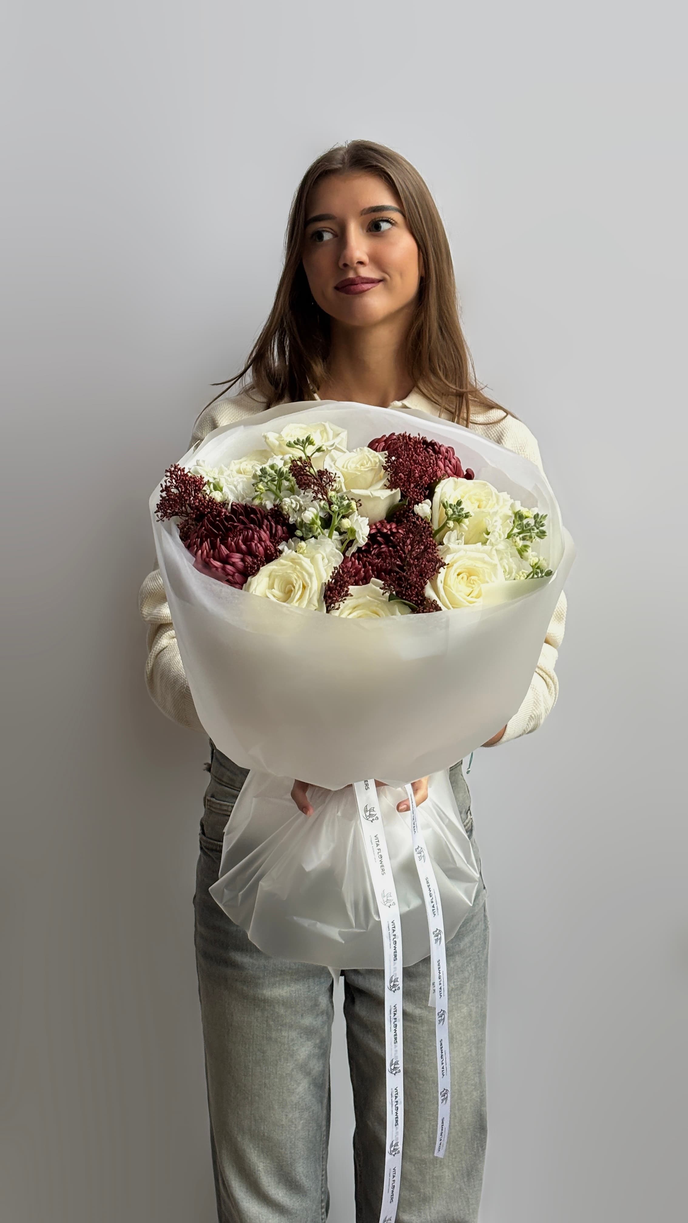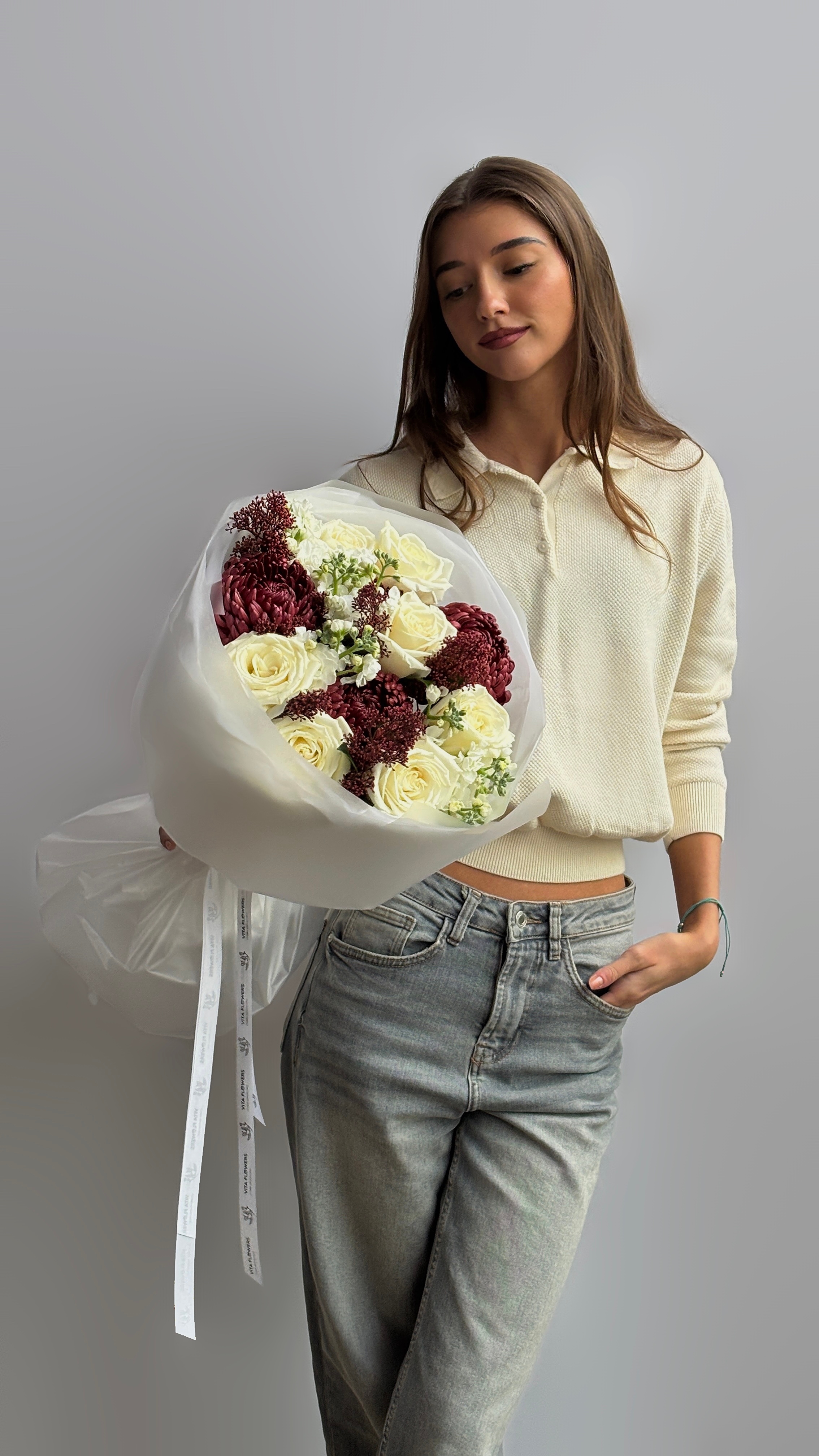 Этот букет объединяет эквадорские розы, маттиолу, хризантему и пучок скимии. Комбинация цветов создаёт лёгкий, природный и гармоничный образ.