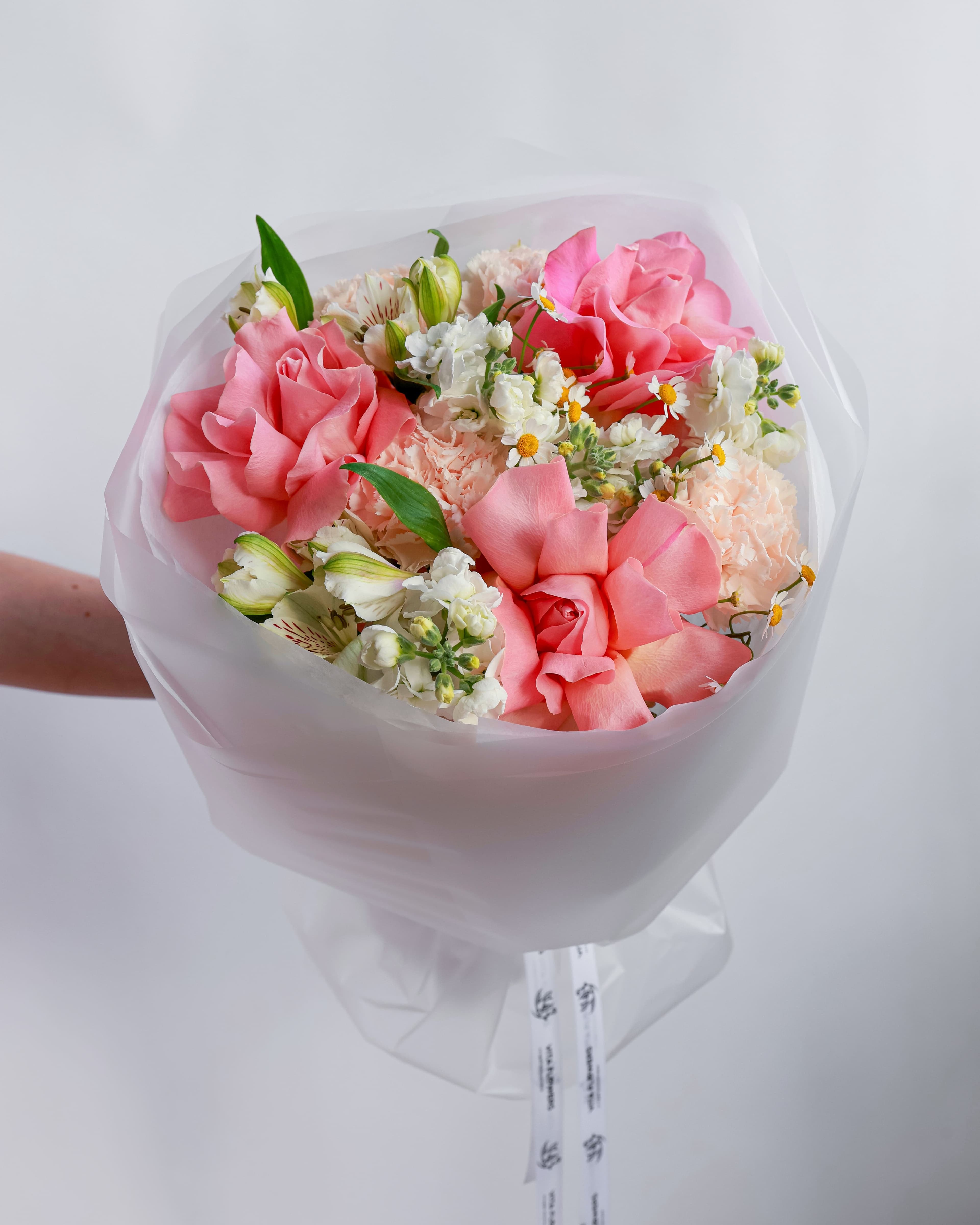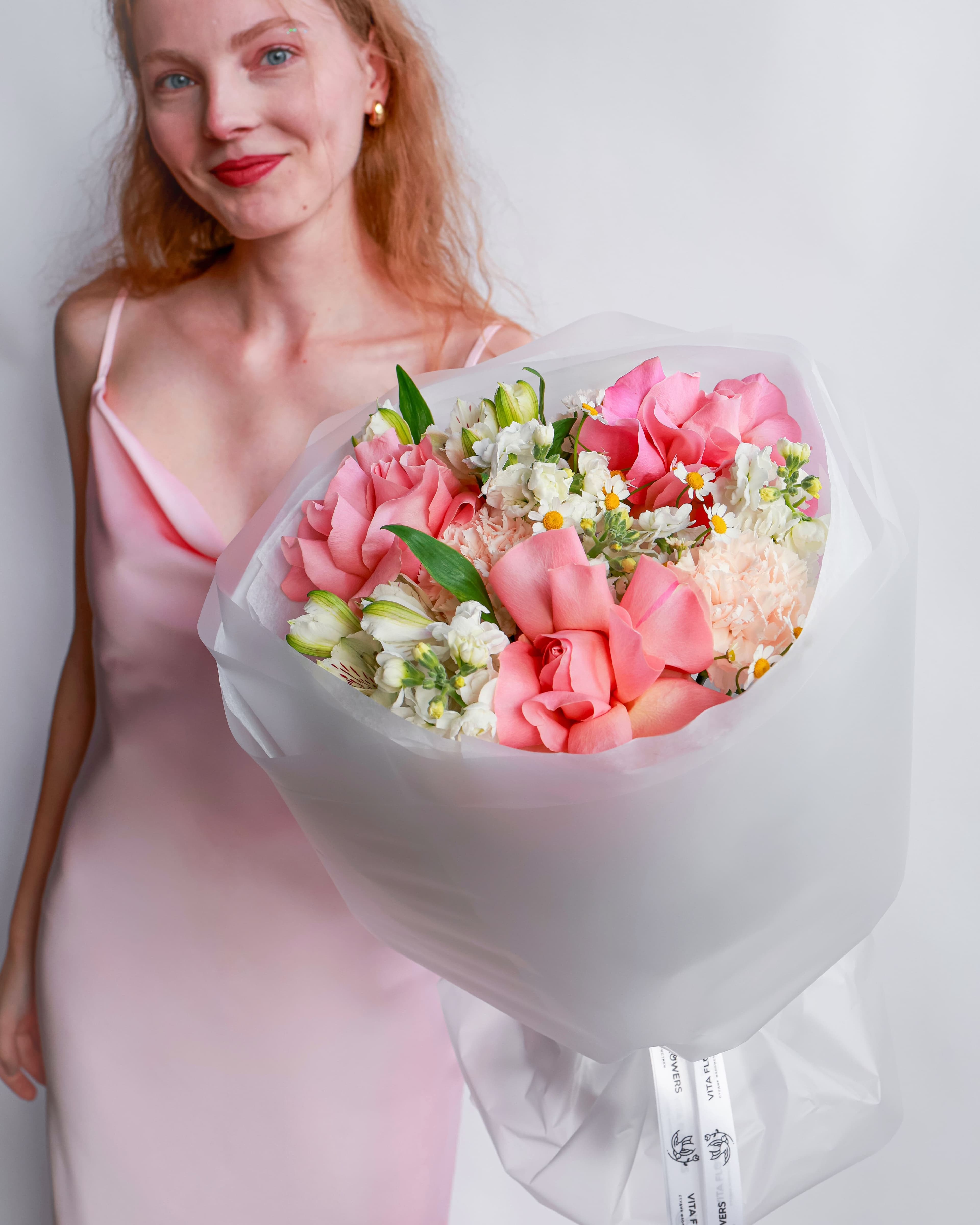 Солнечный букет с ромашкой и альстромерией наполнен лёгкостью и теплом. Бело-розовая палитра создаёт ощущение свежести и беззаботности, а аромат маттиолы добавляет нежную ноту весеннего утра.