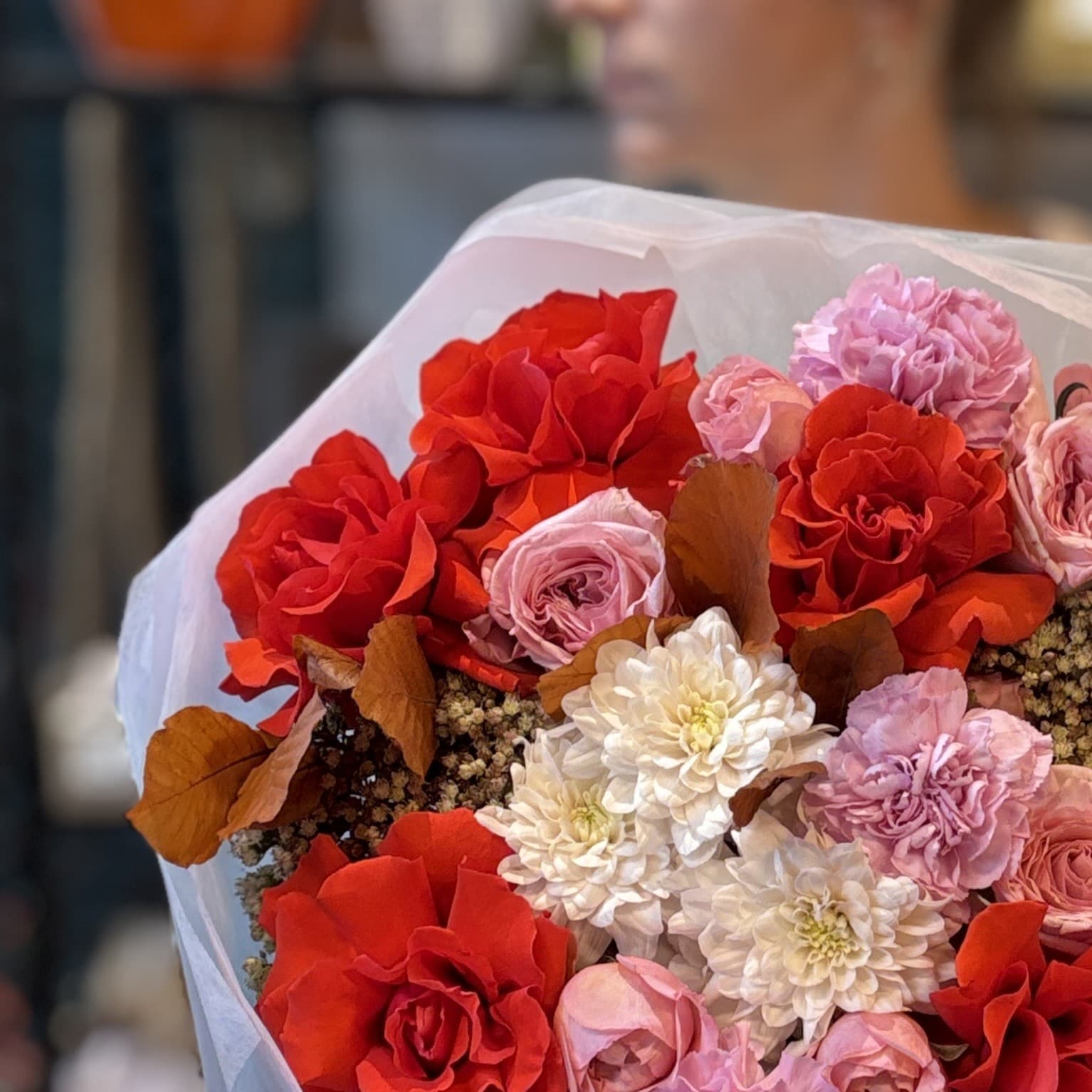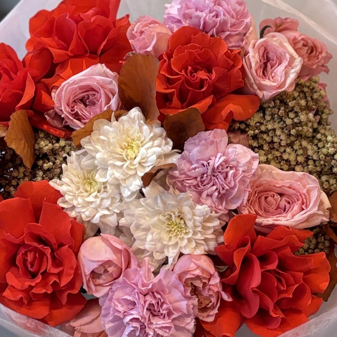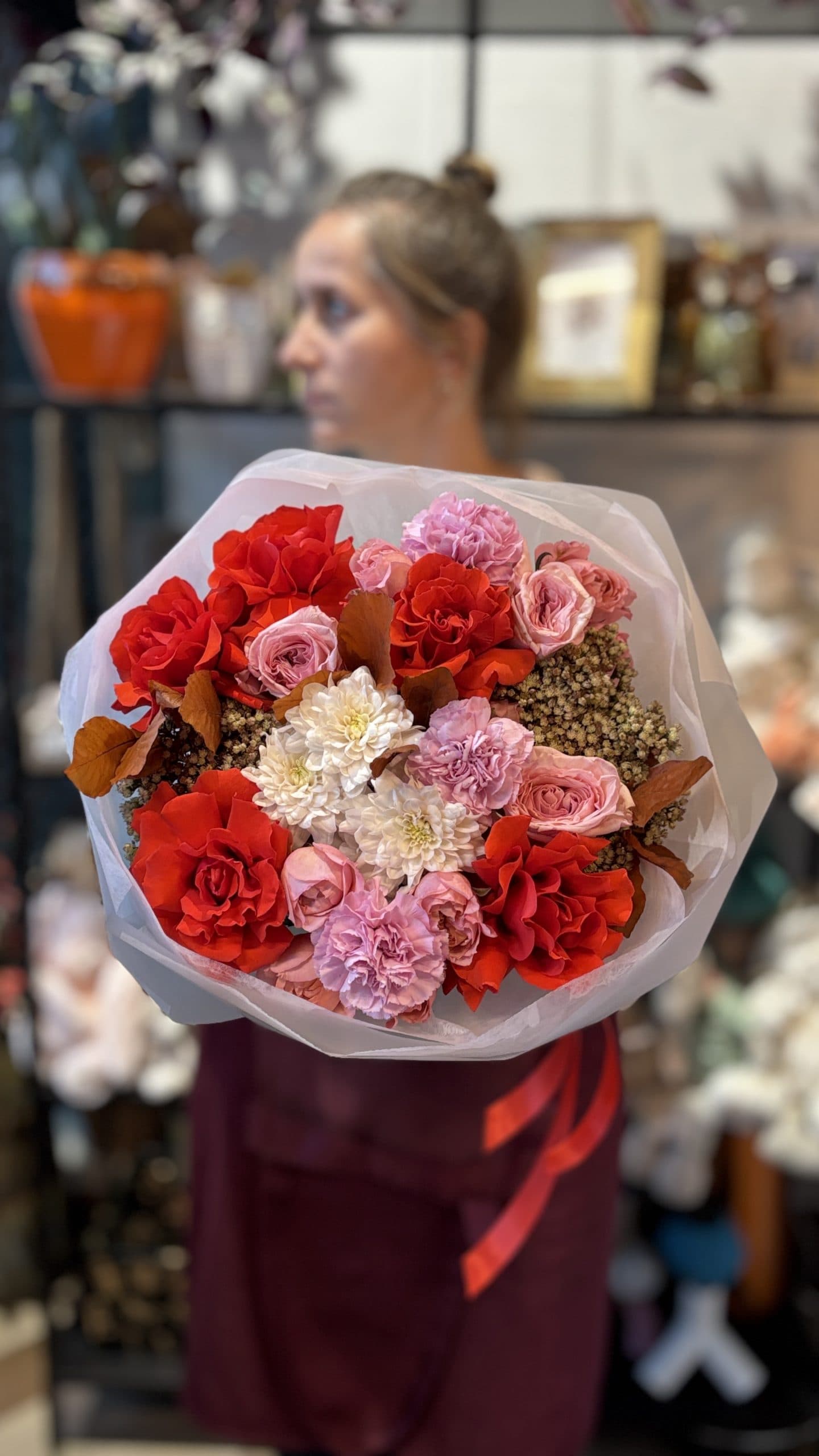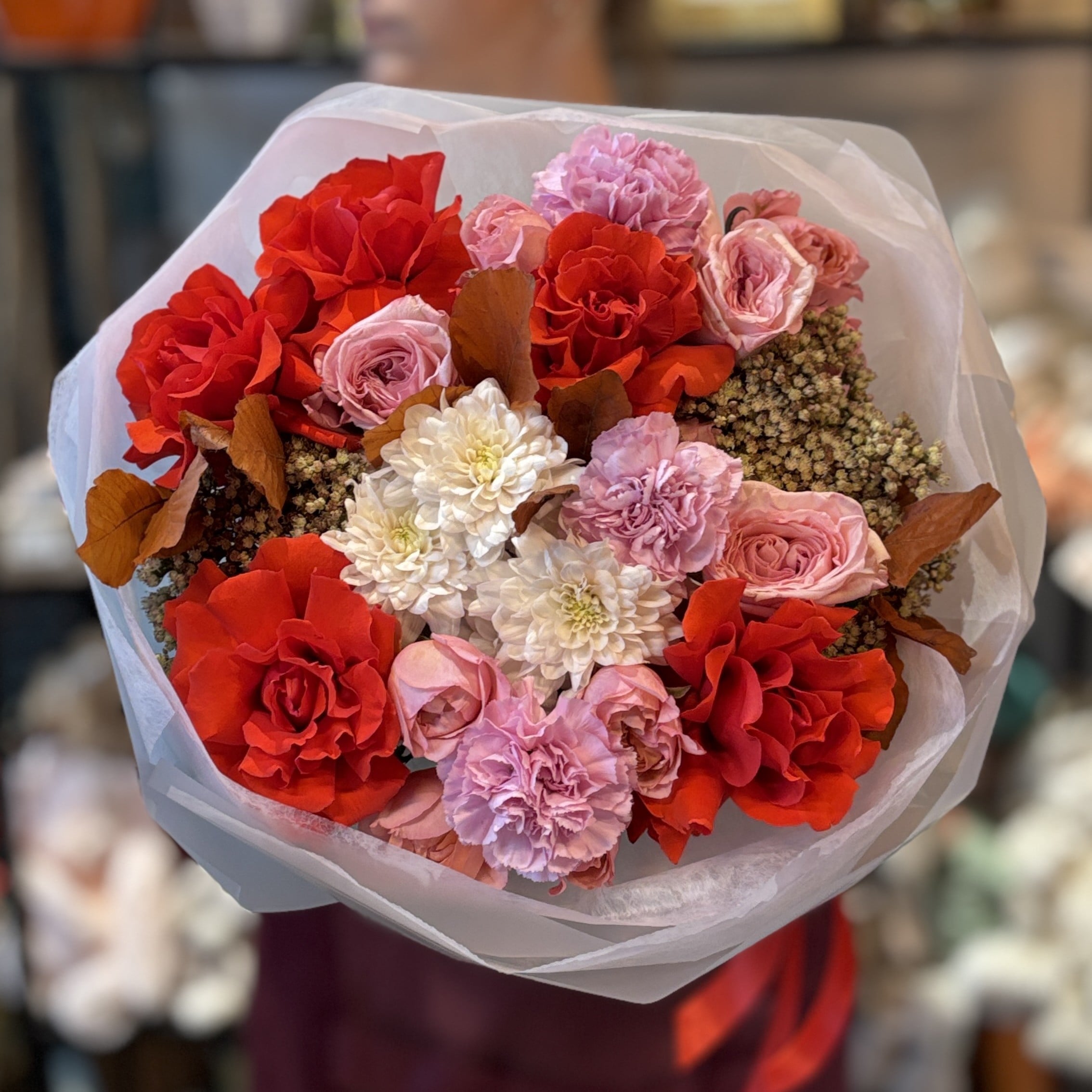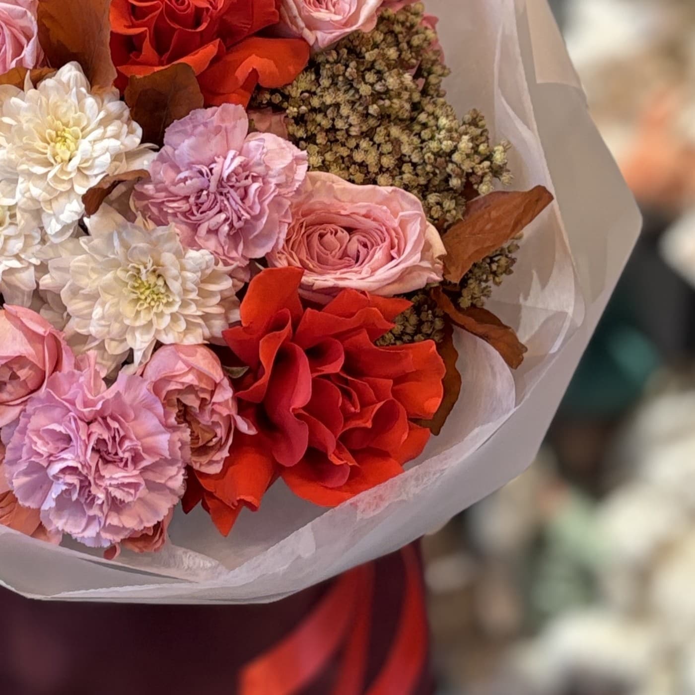 Стильный букет с Гвоздиками, Сантини, пионовидными и кустовыми Розами великолепно сочетает яркость и нежность. Этот цветочный ансамбль подчеркивает изысканность и естественную красоту, превращая любой момент в особое событие, даря радость и позитивные эмоции.