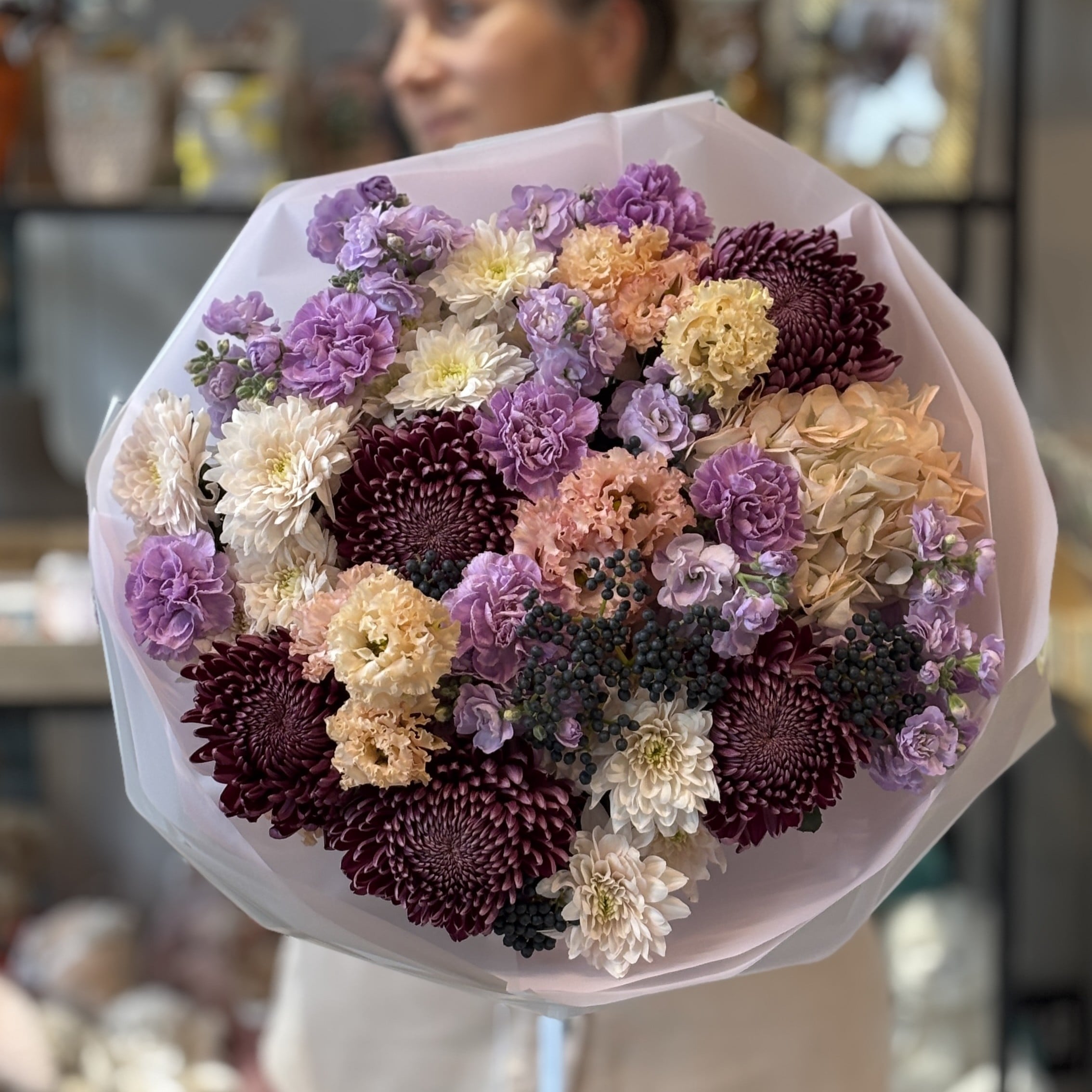 Яркий букет с ягодами Вибурнума, Гвоздикой, Гортензией, Лизиантусом, кустовой Маттиолой, Сантини и Хризантемой поражает богатством текстур и оттенков. Этот живописный цветочный ансамбль станет прекрасным подарком, добавляя искренние эмоции и радость в любой праздник или событие.