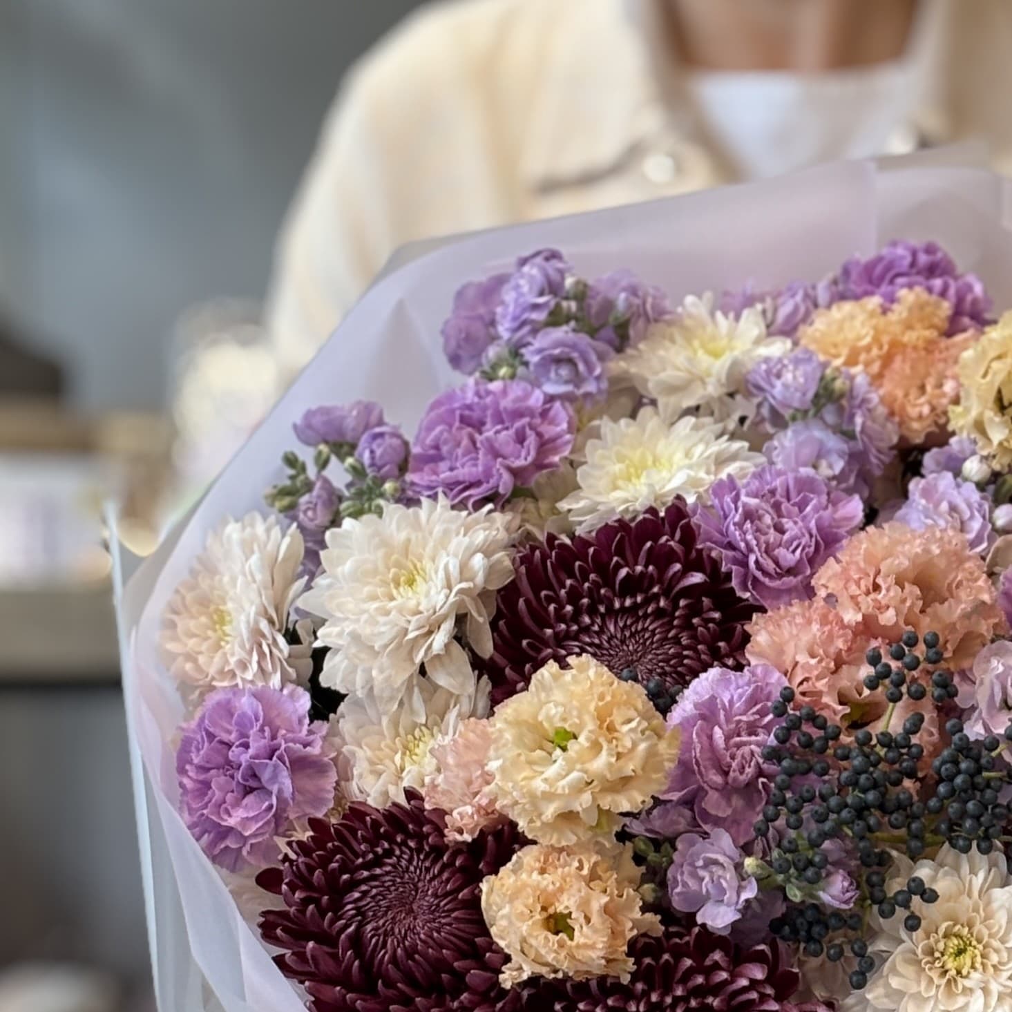 Букет с Хризантемами, Маттиолой и ягодами Вибурнума
