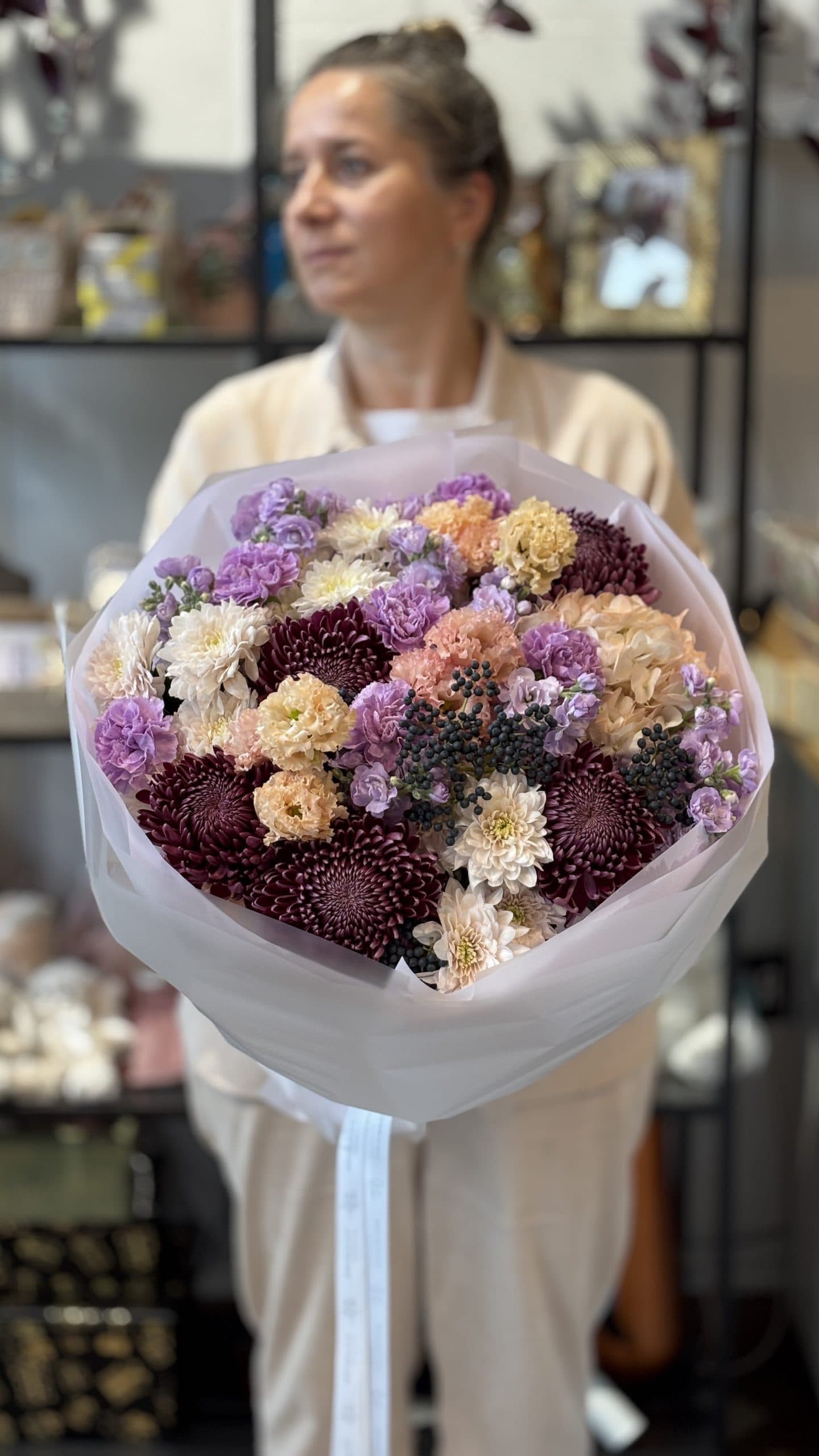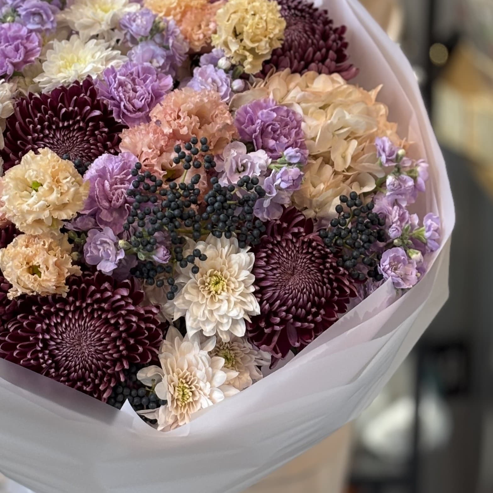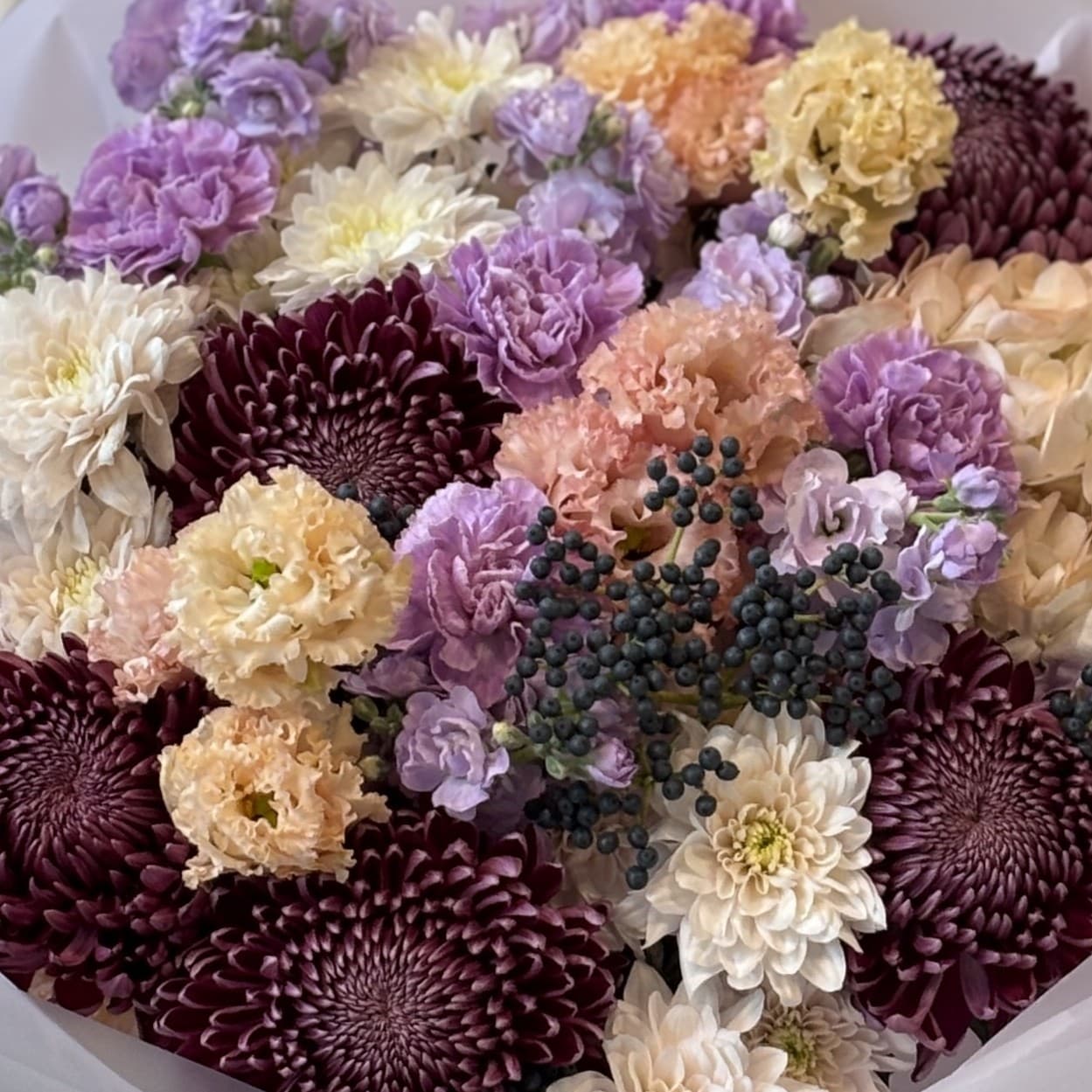 Состав: Вибурнум (ягода), Гвоздика, Гортензия, Лизиантус, Маттиола кустовая, Сантини, Хризантема.