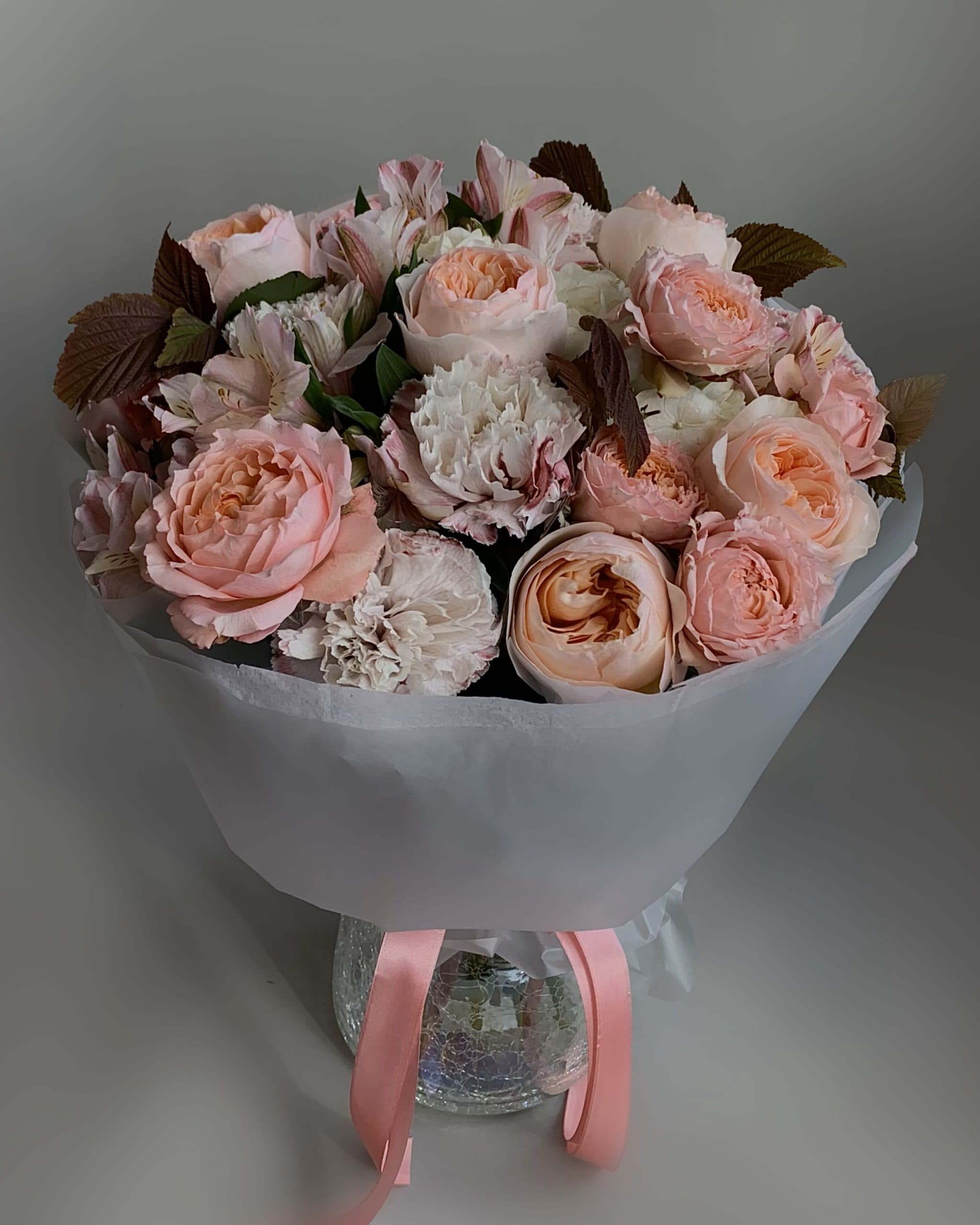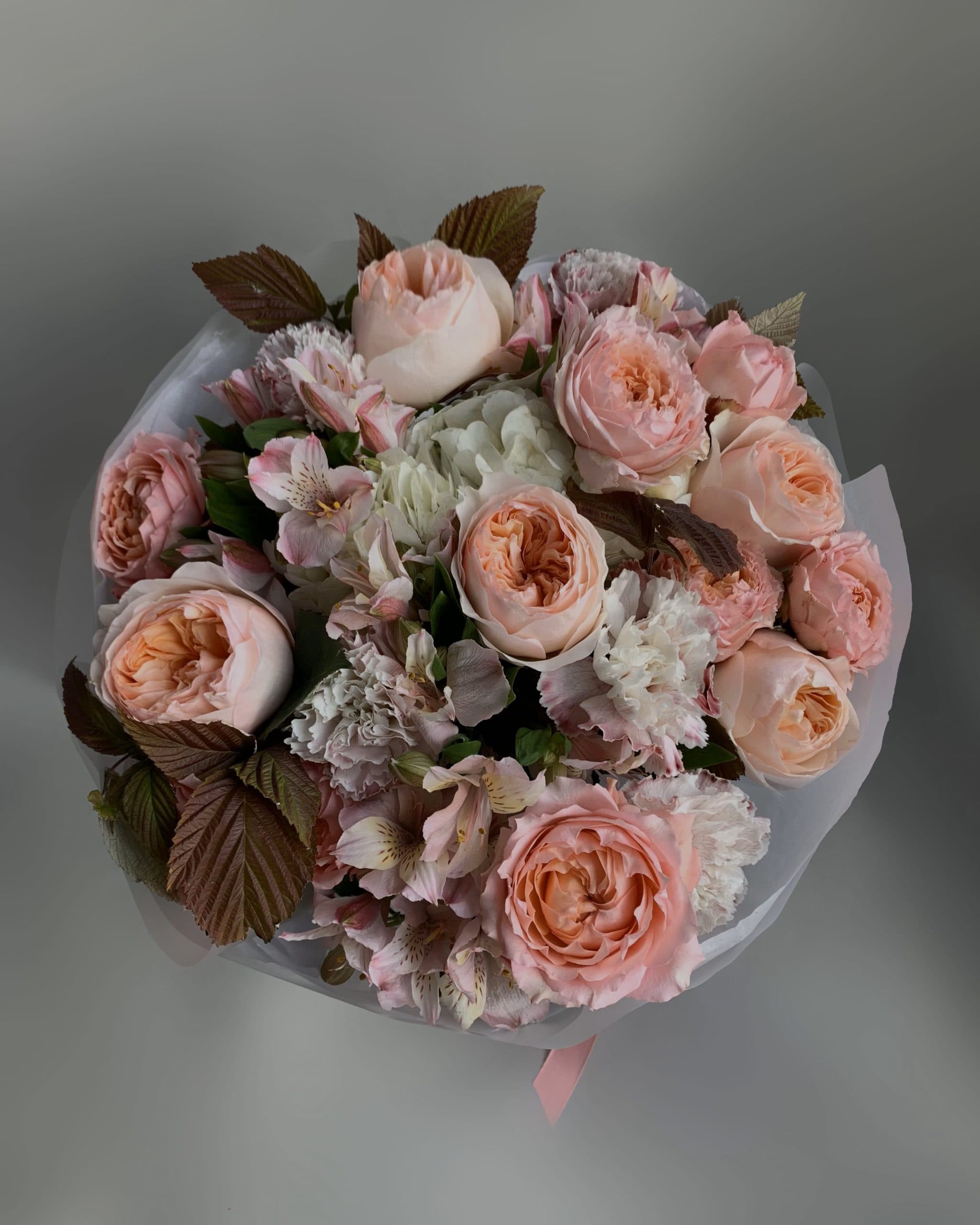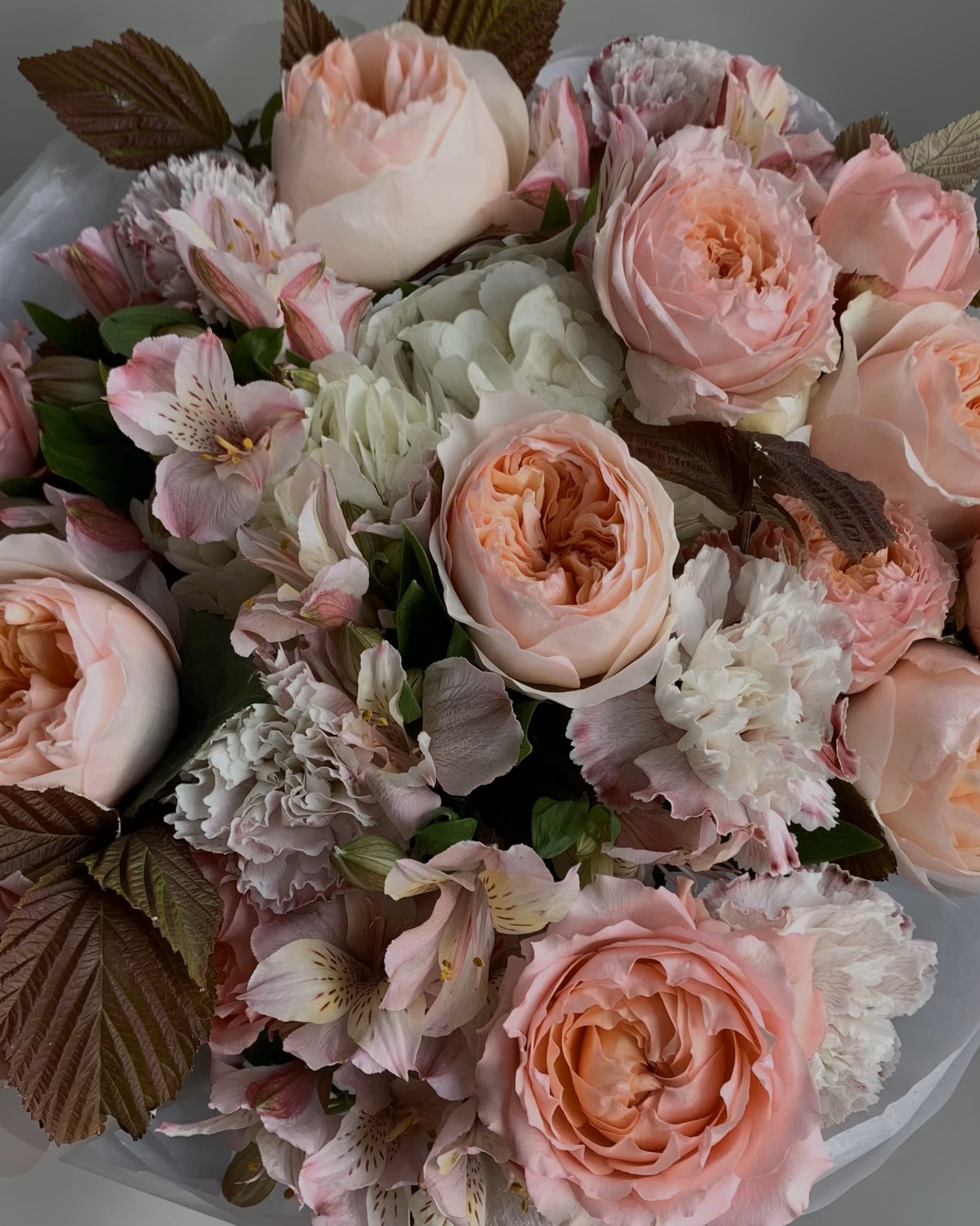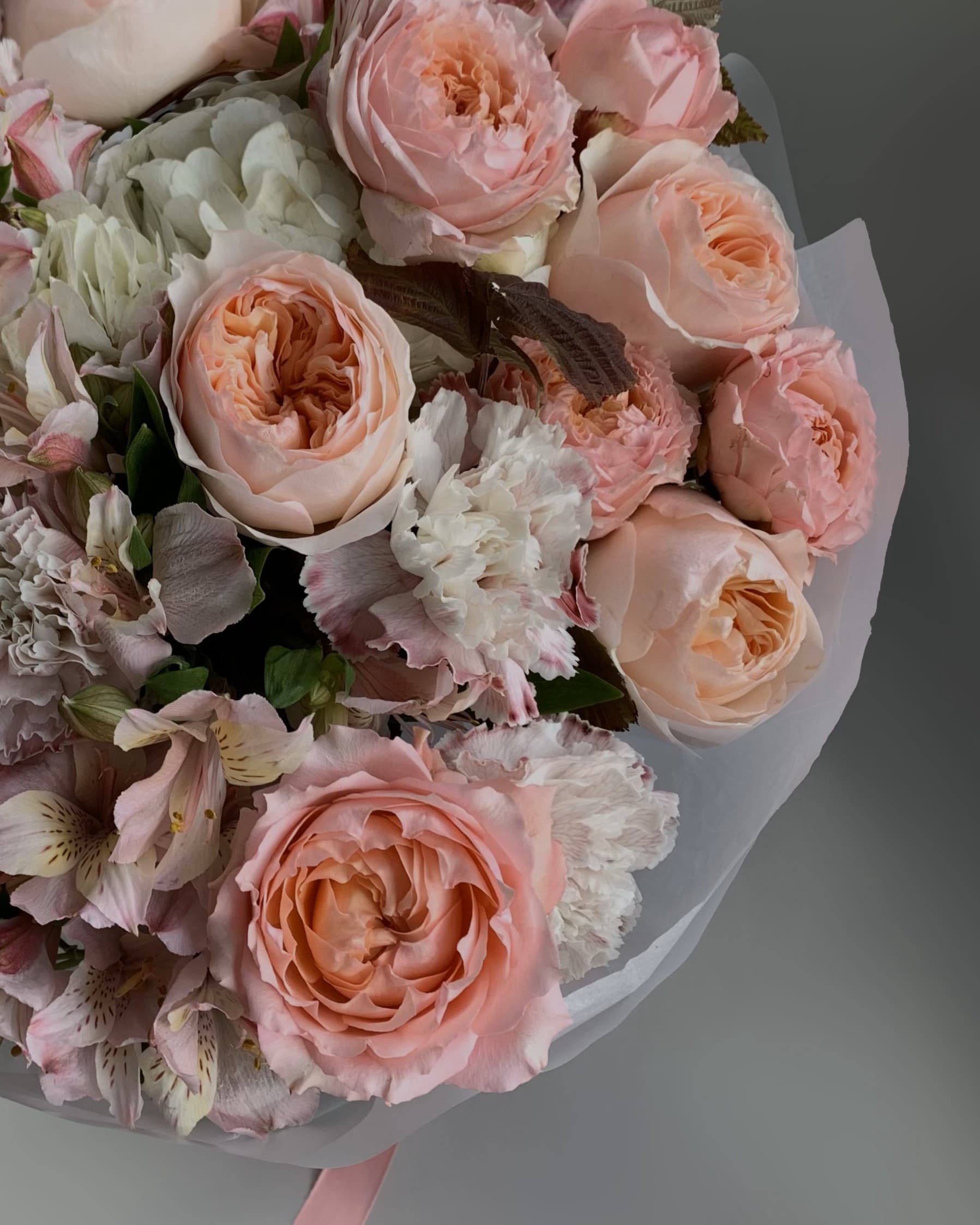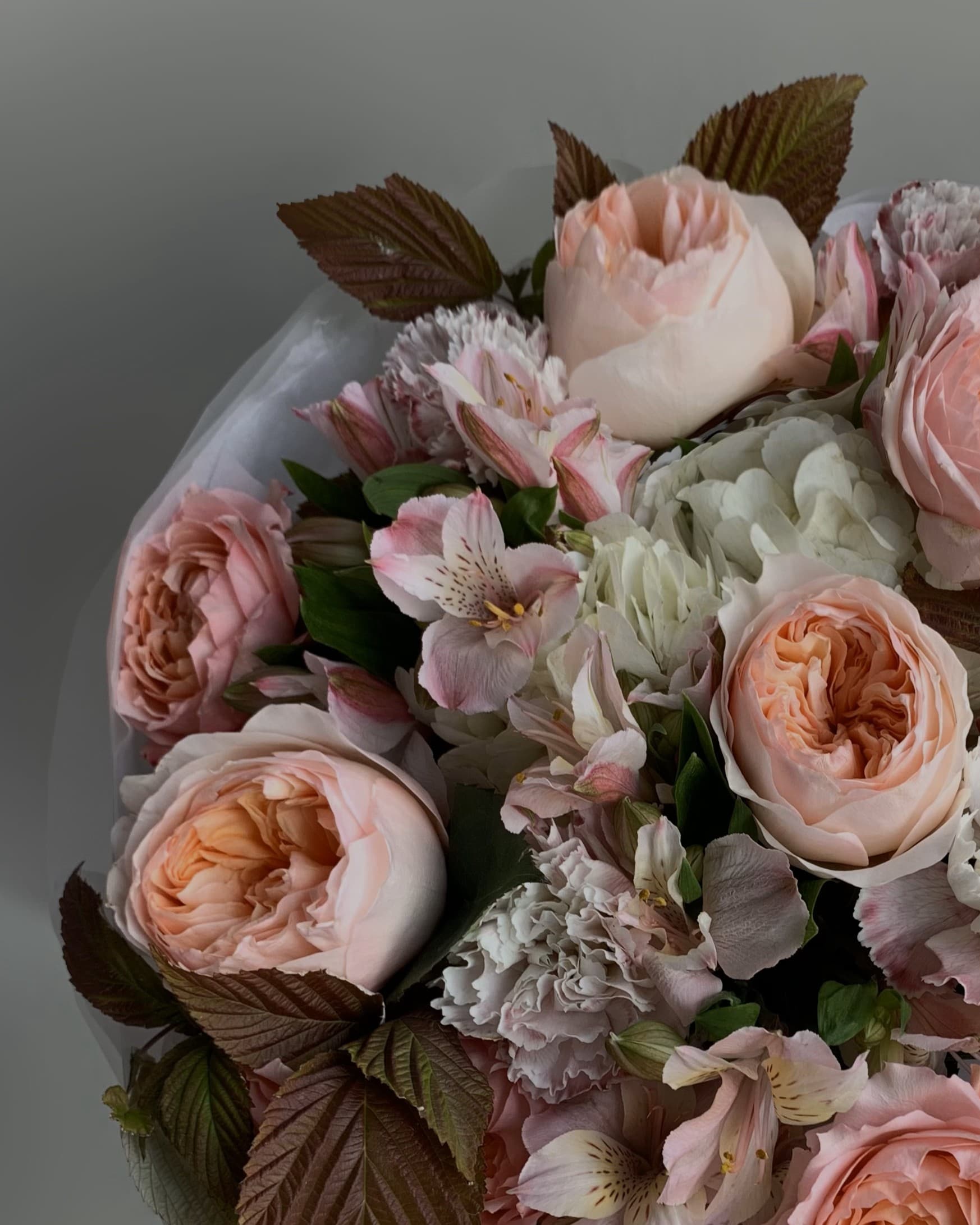 Состав: Альстромерия, Гортензия, Гвоздика, Малина (листья), Роза кустовая, Роза пионовидная.