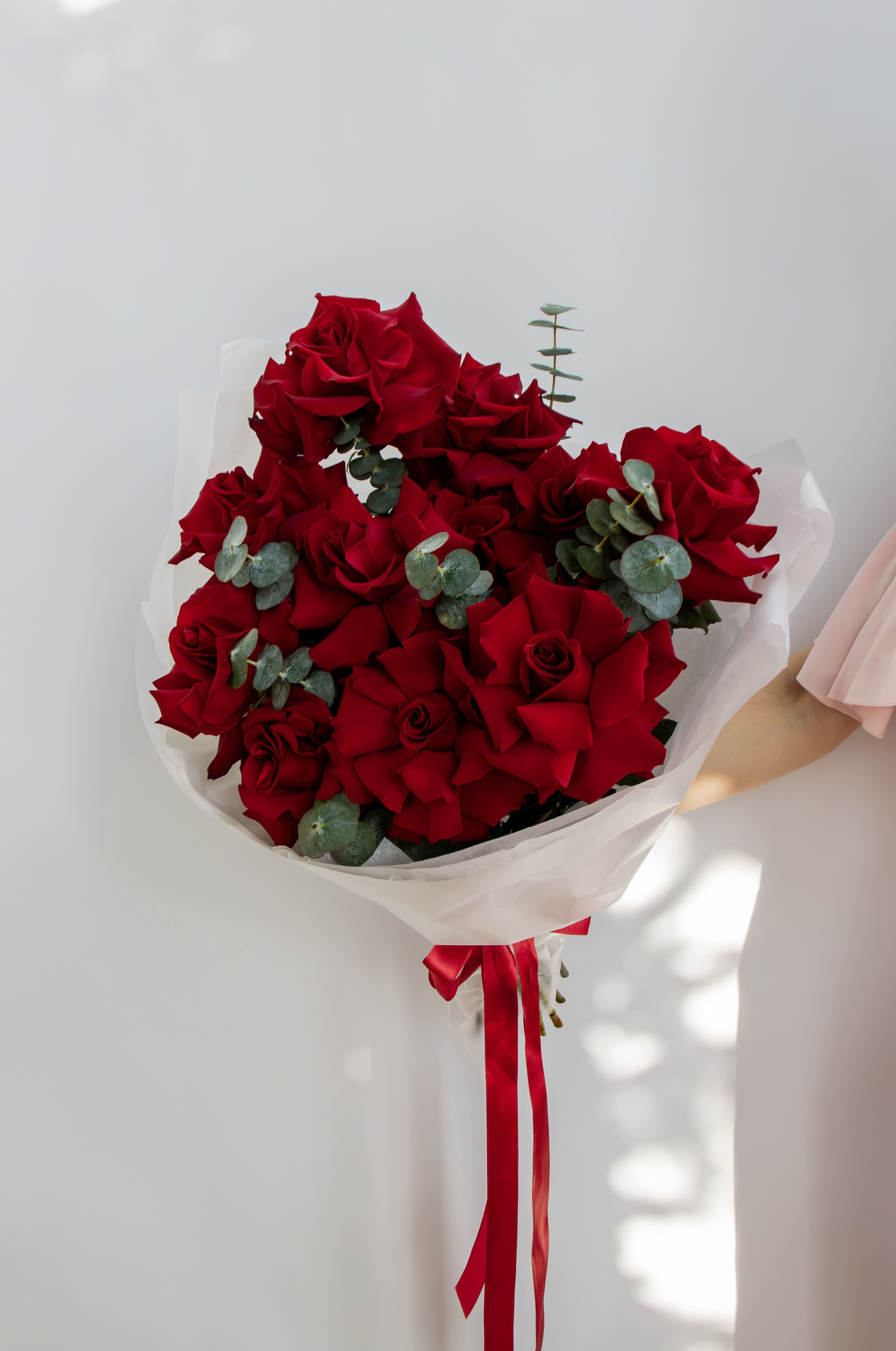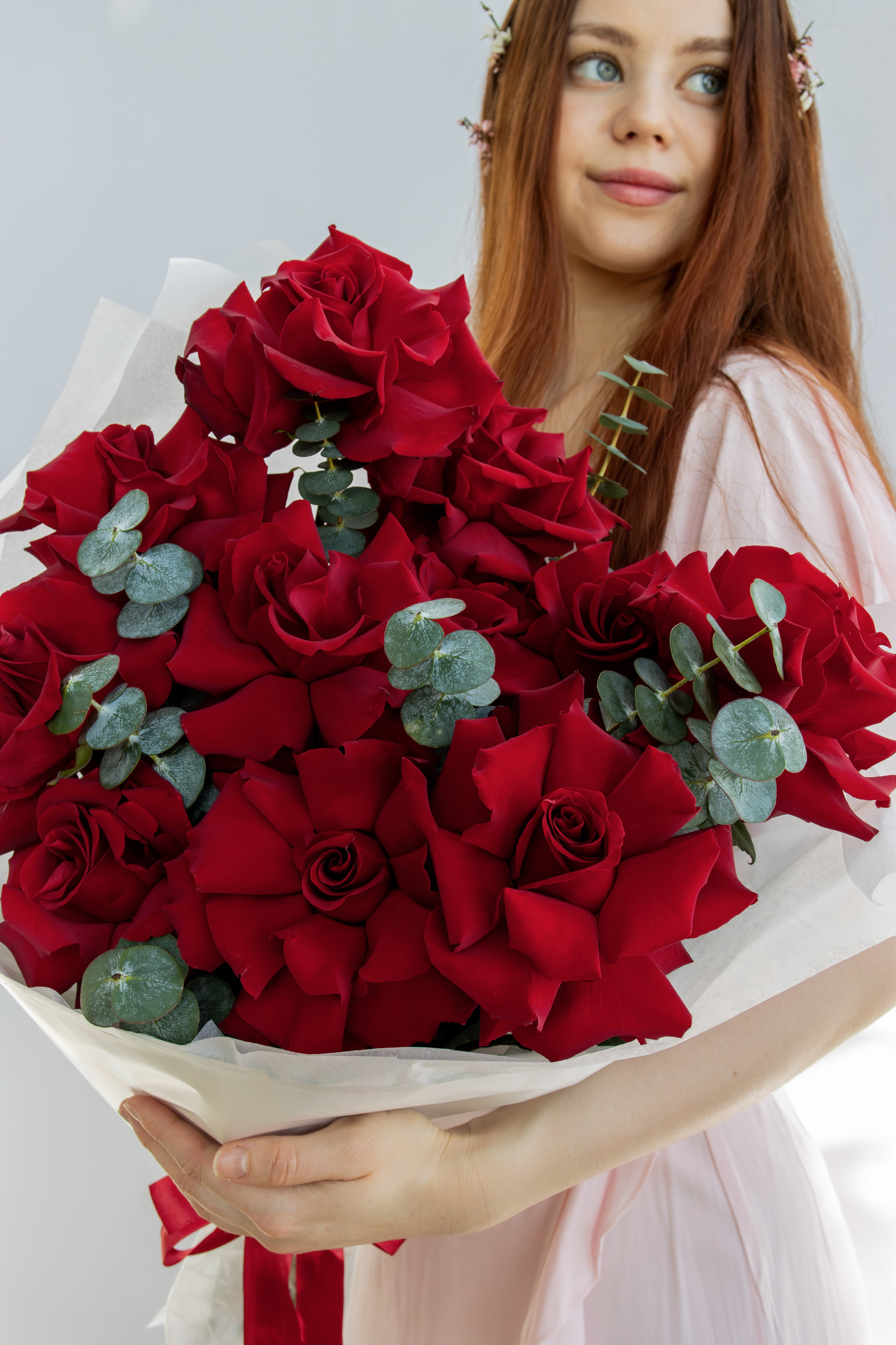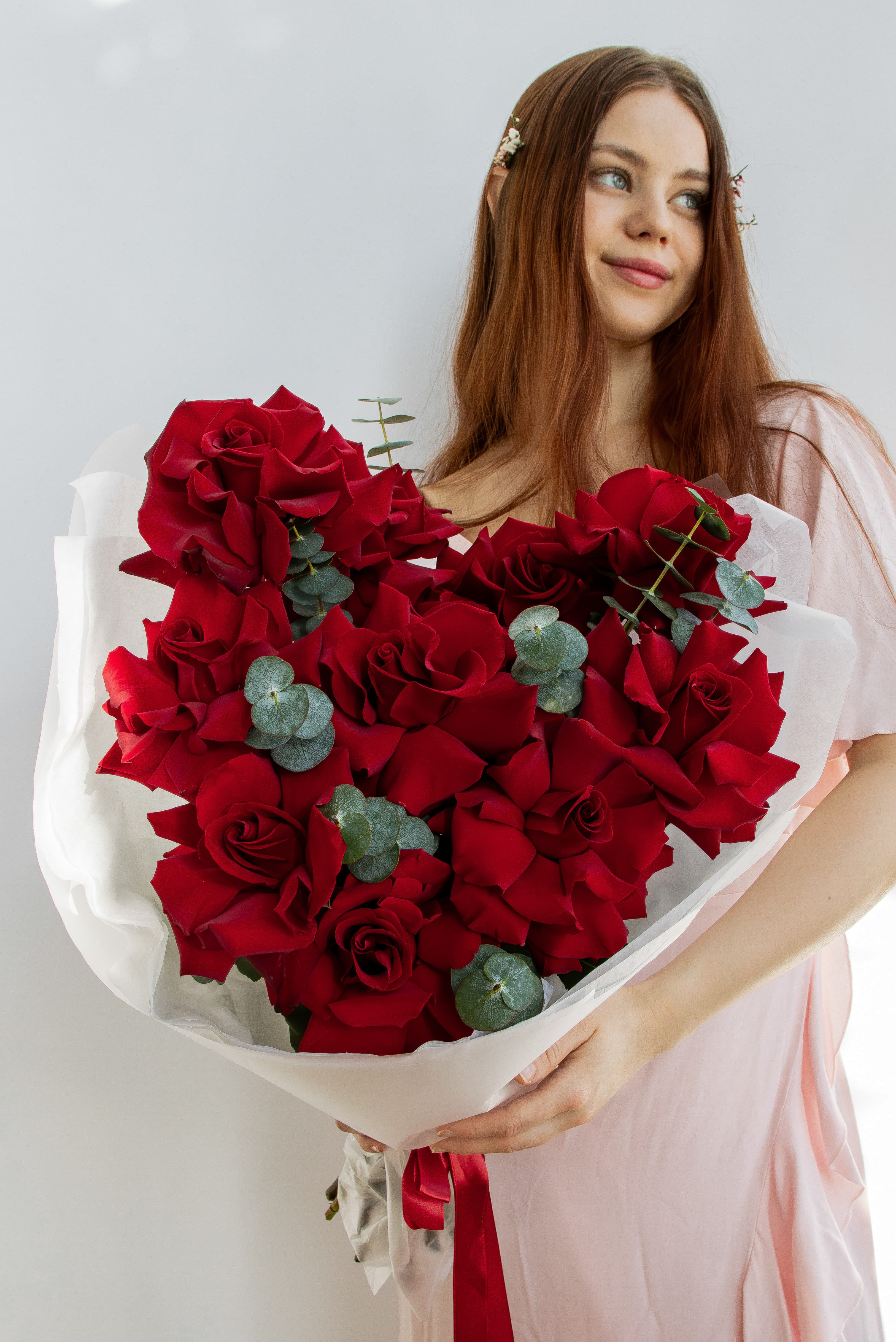 Классическое сочетание одноголовой розы Эквадор и высокого эвкалипта.