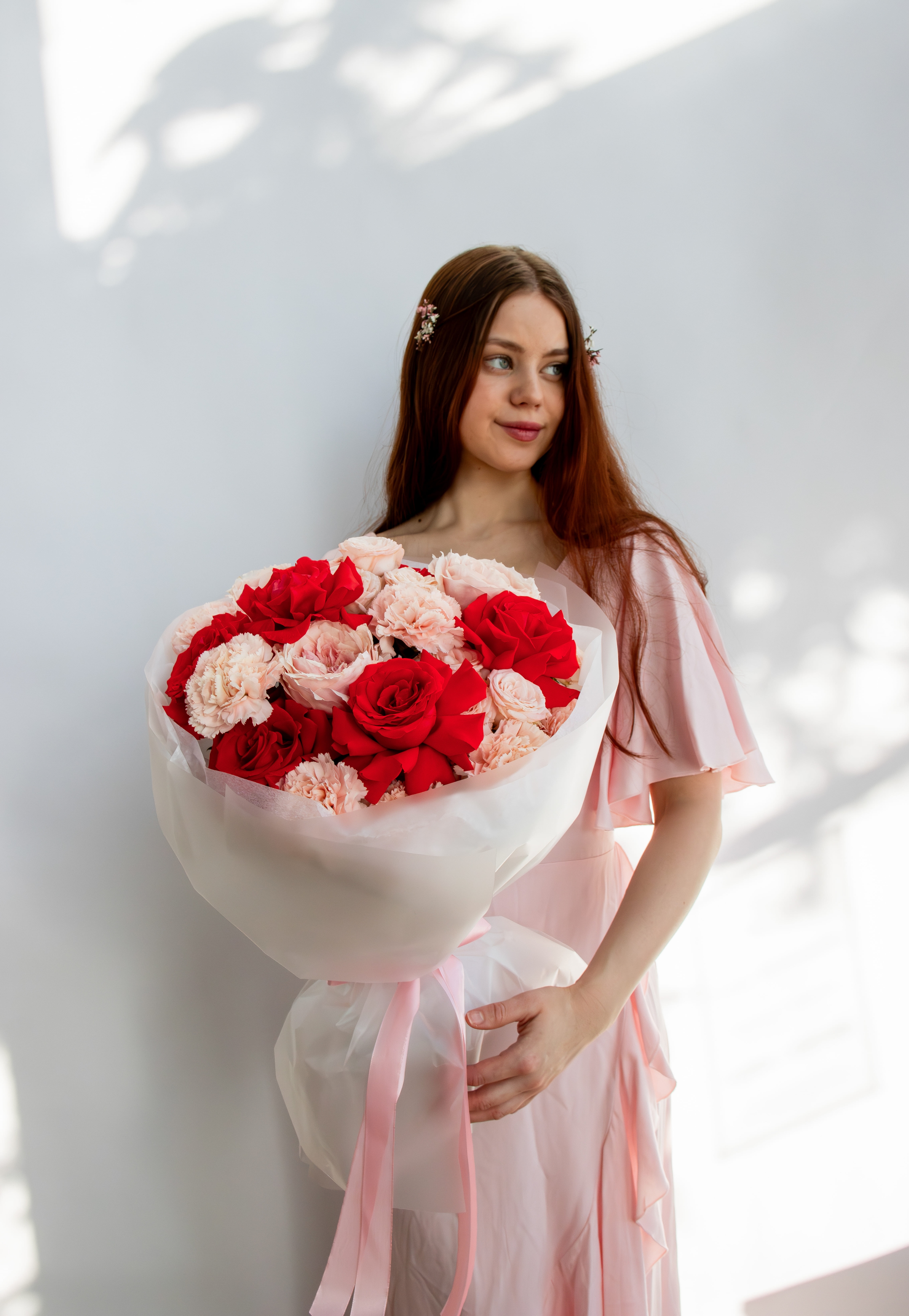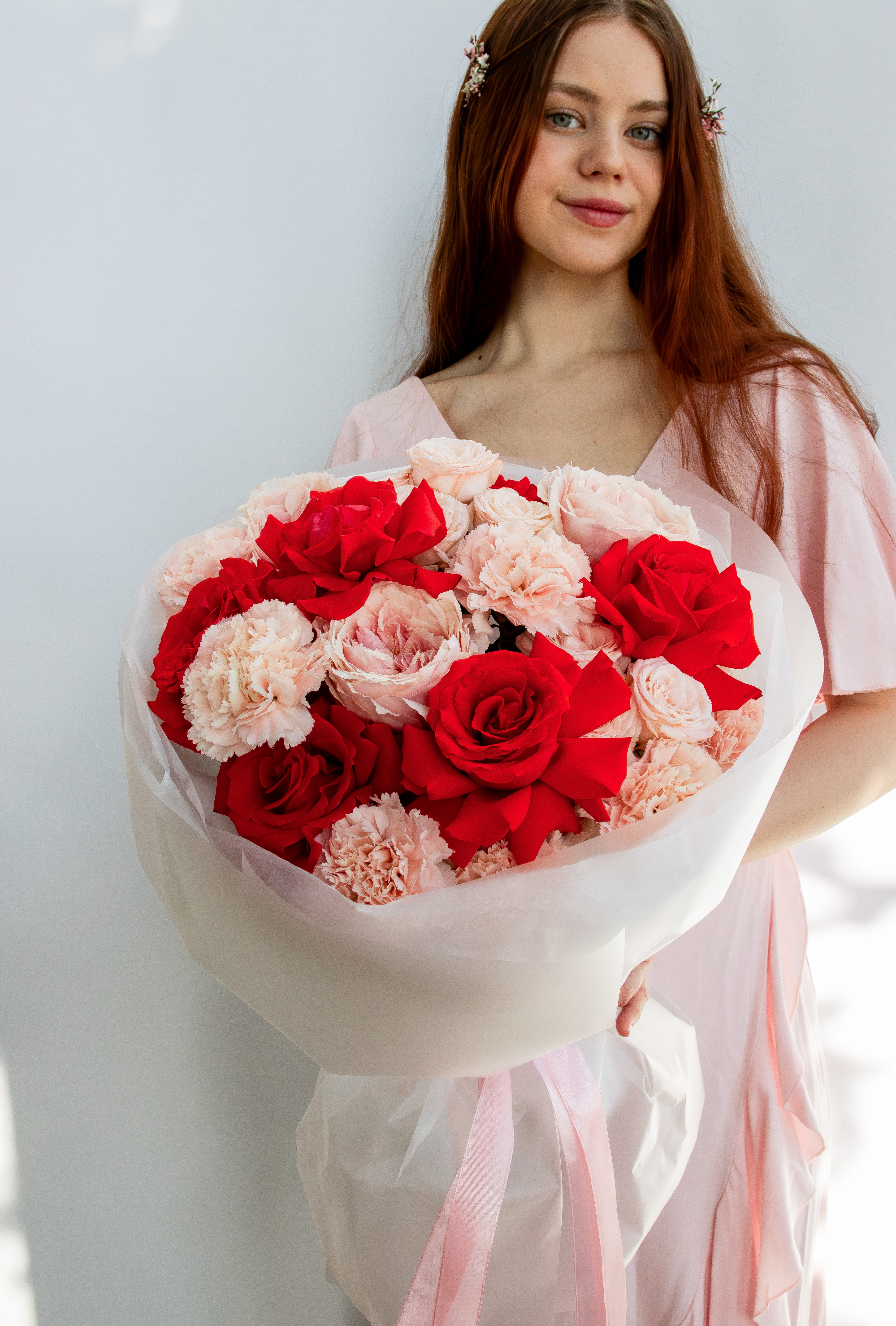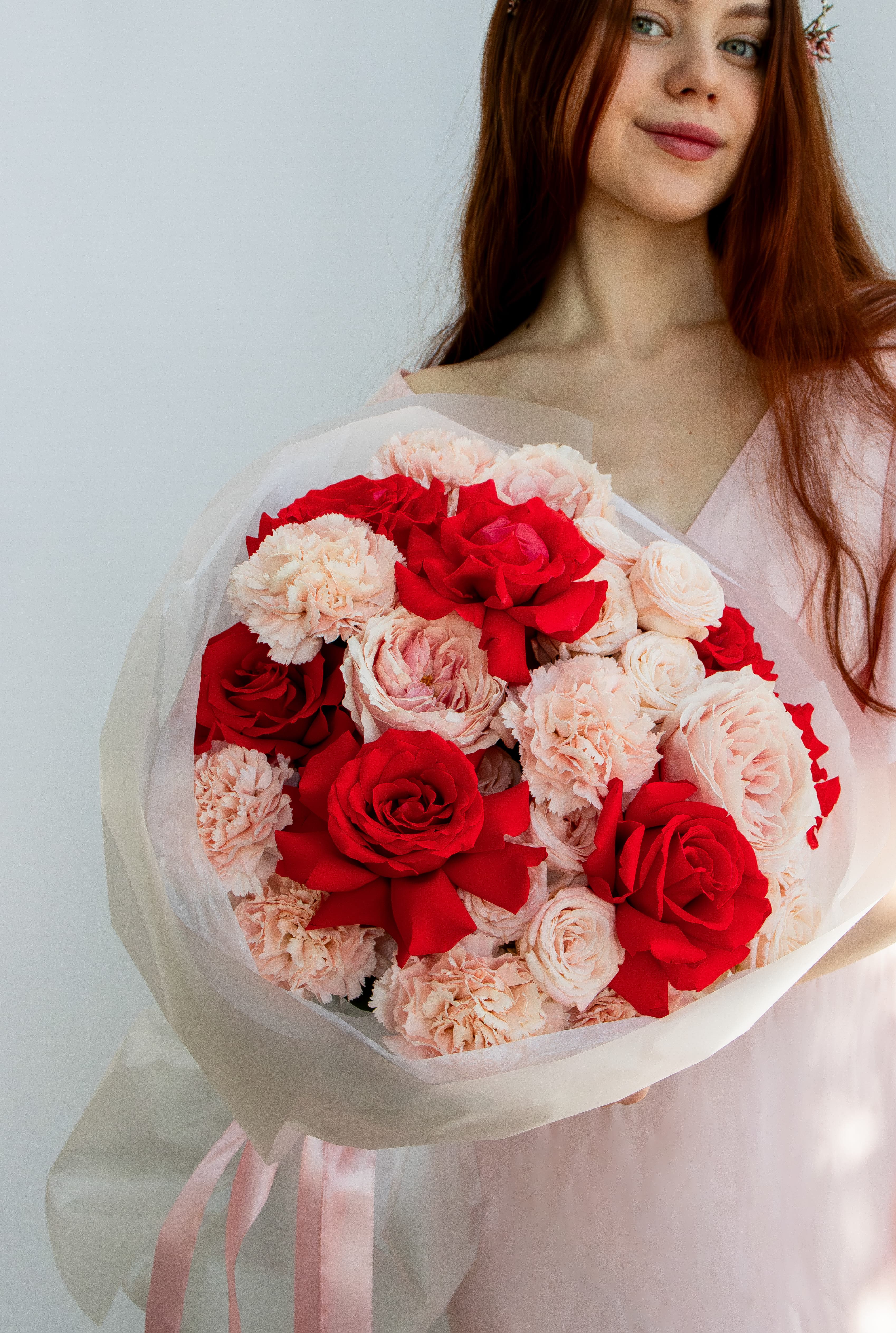 Композиция объединяет одноголовую розу Эквадор, пионовидную и кустовую розу с диантусами. Разные формы бутонов делают букет объёмным и многослойным.