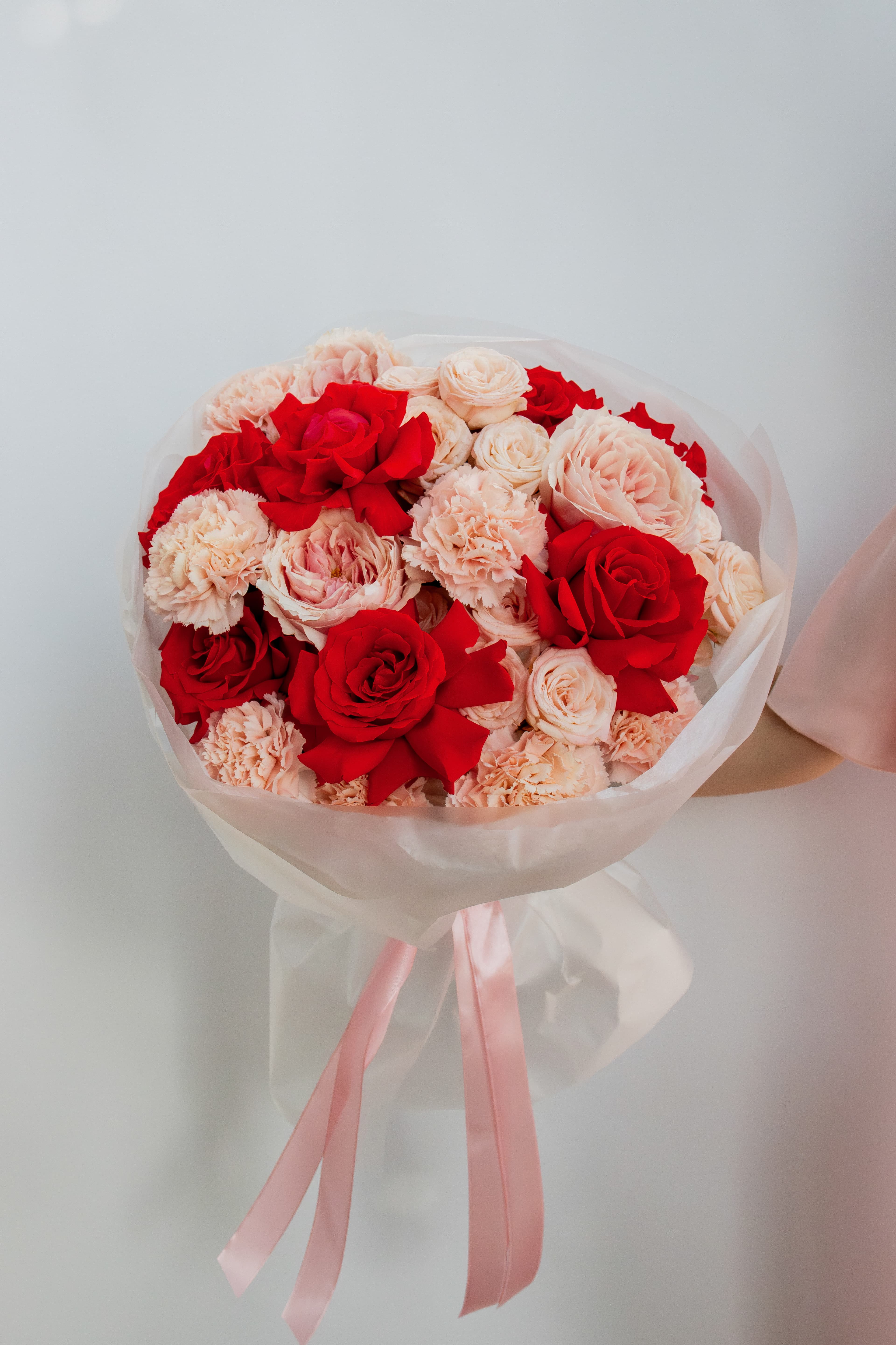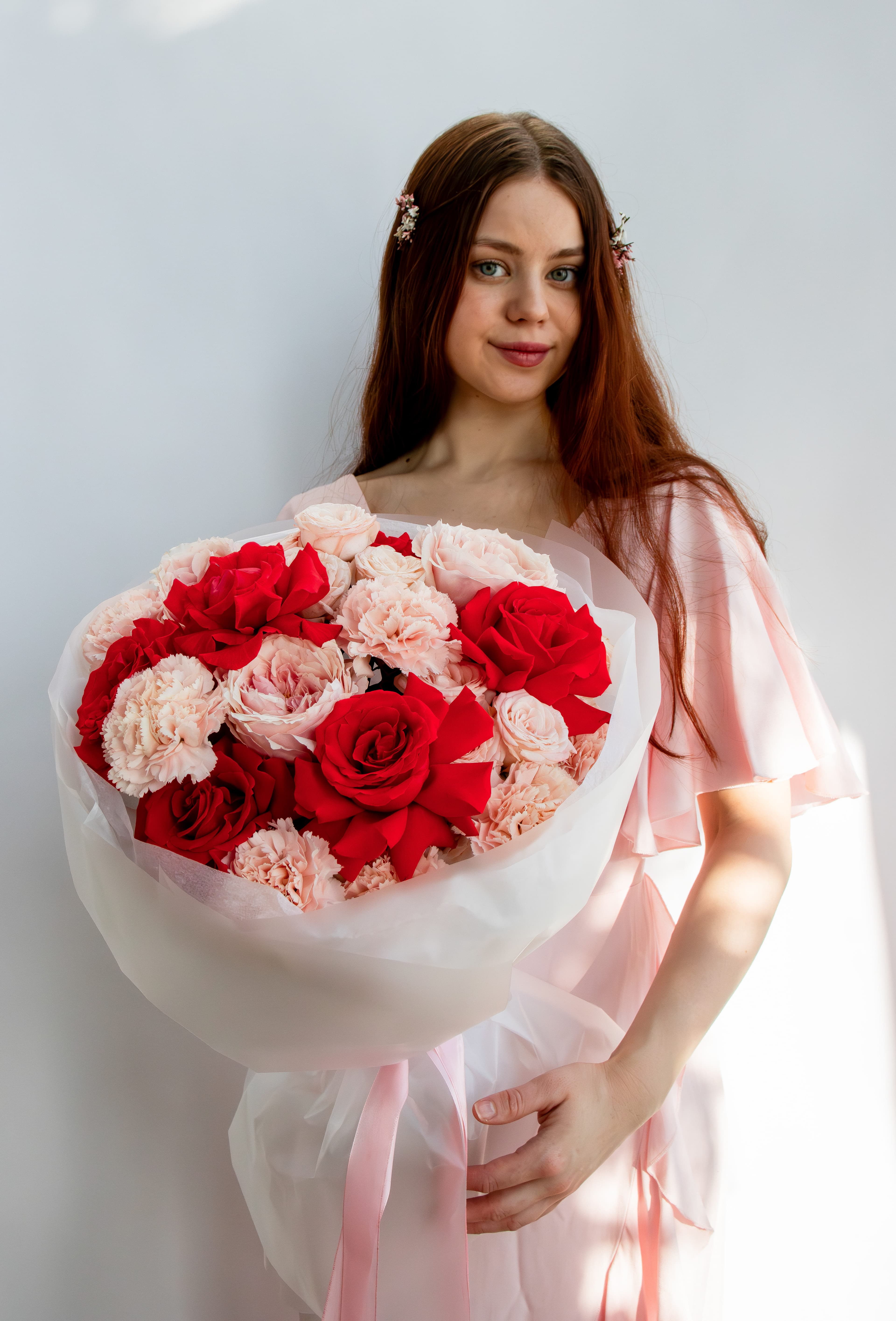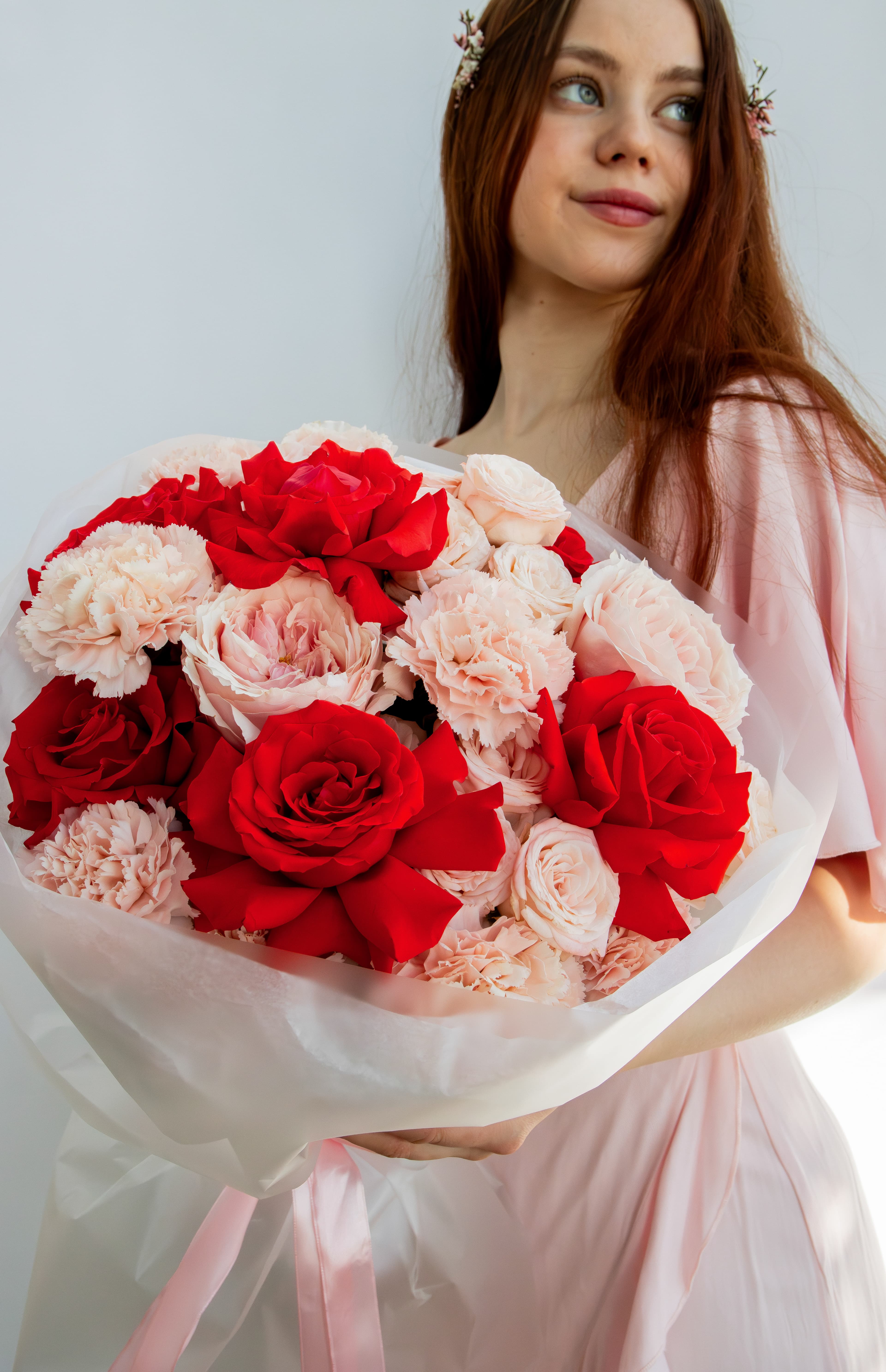 Композиция объединяет одноголовую розу Эквадор, пионовидную и кустовую розу с диантусами. Разные формы бутонов делают букет объёмным и многослойным.