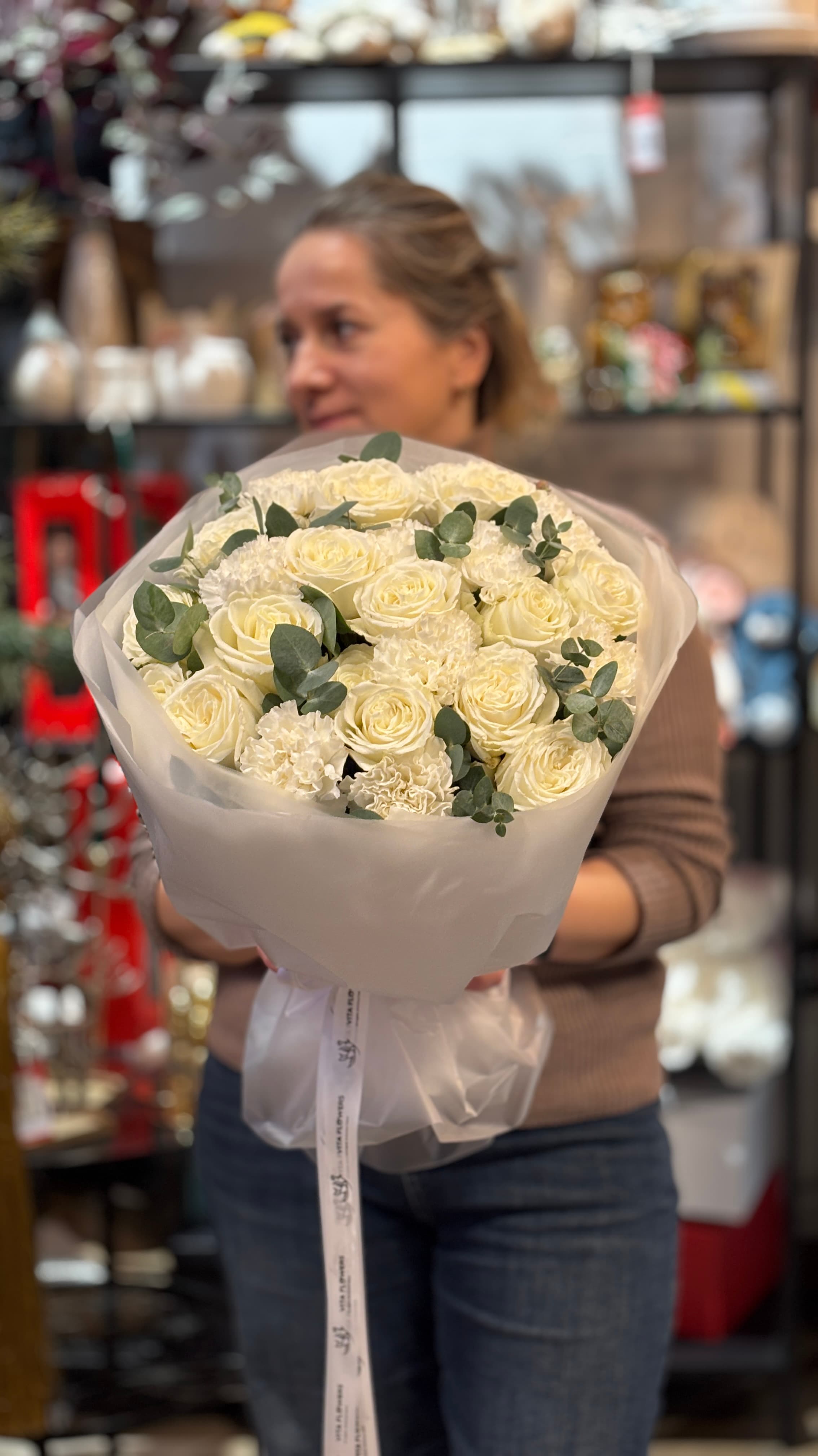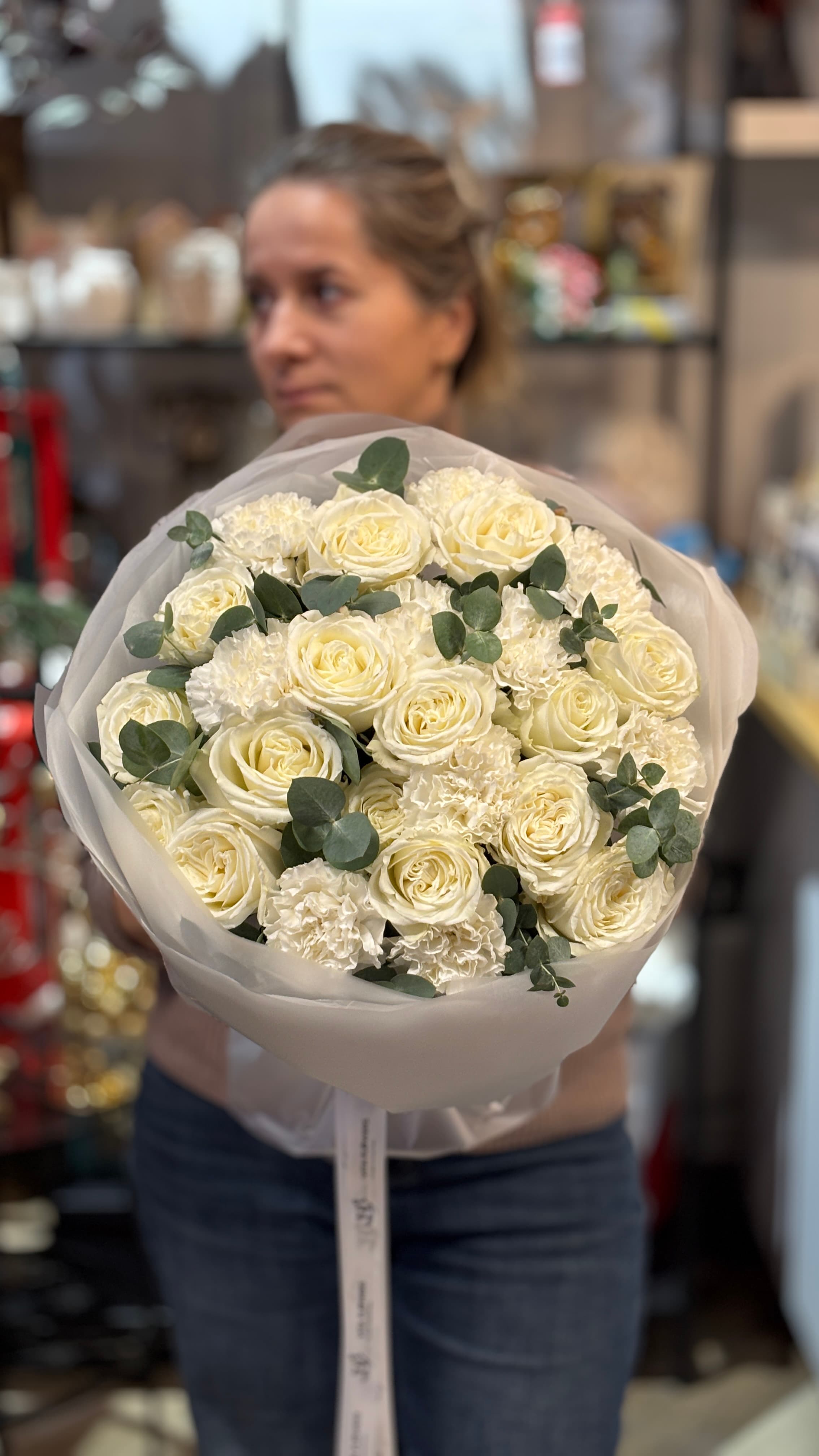 Нежный букет из белых Гвоздик, белых Роз и Эвкалипта символизирует чистоту и искренность. Элегантные цветы гармонично сочетаются друг с другом, а зелень эвкалипта добавляет свежести и выразительности. Этот букет станет прекрасным подарком для любого случая, придавая особый шарм и создавая атмосферу праздника.