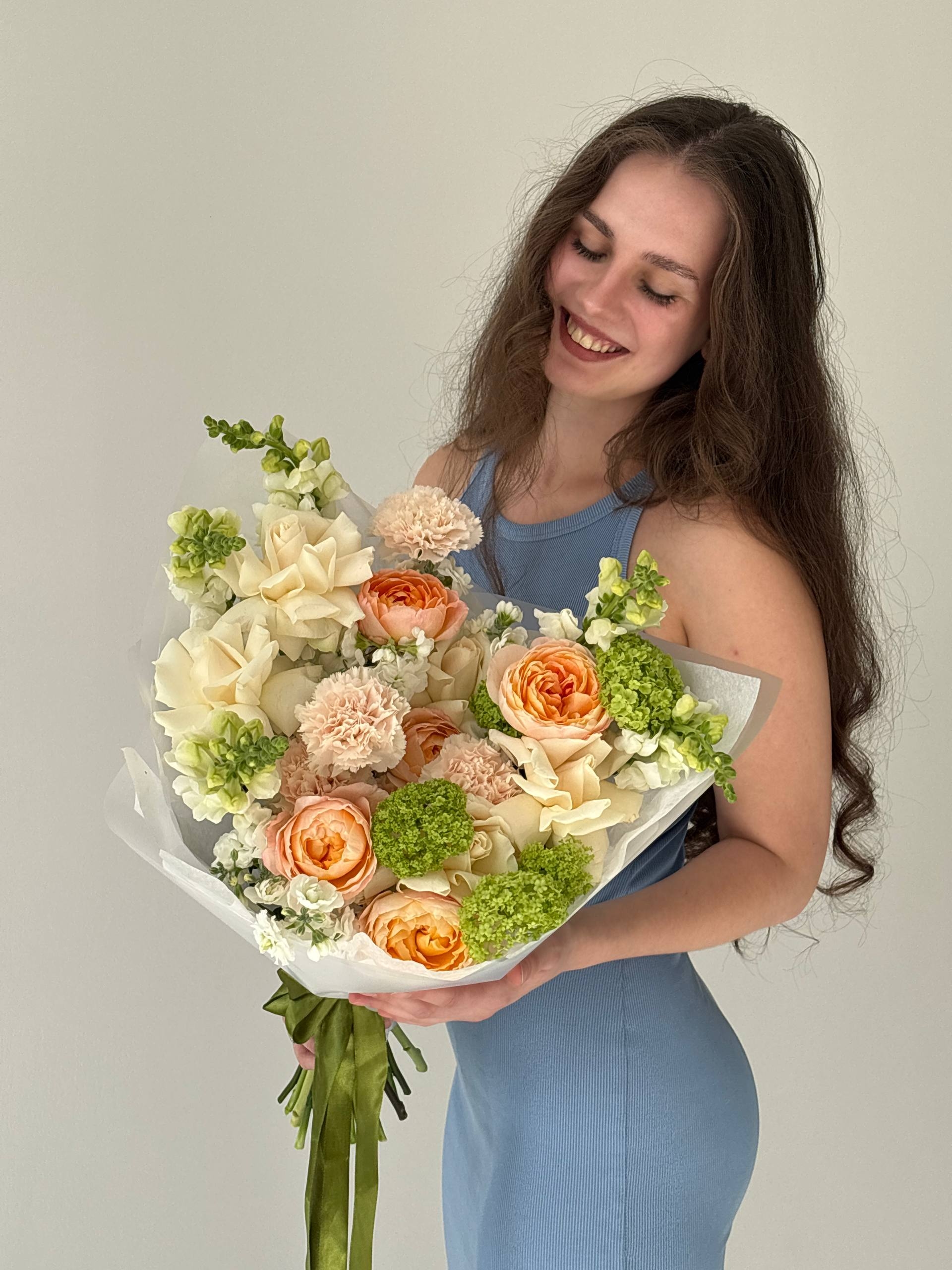 Композиция собрана из одноголовой розы Эквадор, пионовидной розы, диантуса (гвоздики), антирринума, кустовой маттиолы и вибурнума. Сочетание плотных бутонов роз и более лёгких садовых цветов создаёт многослойную структуру с выраженной фактурой.