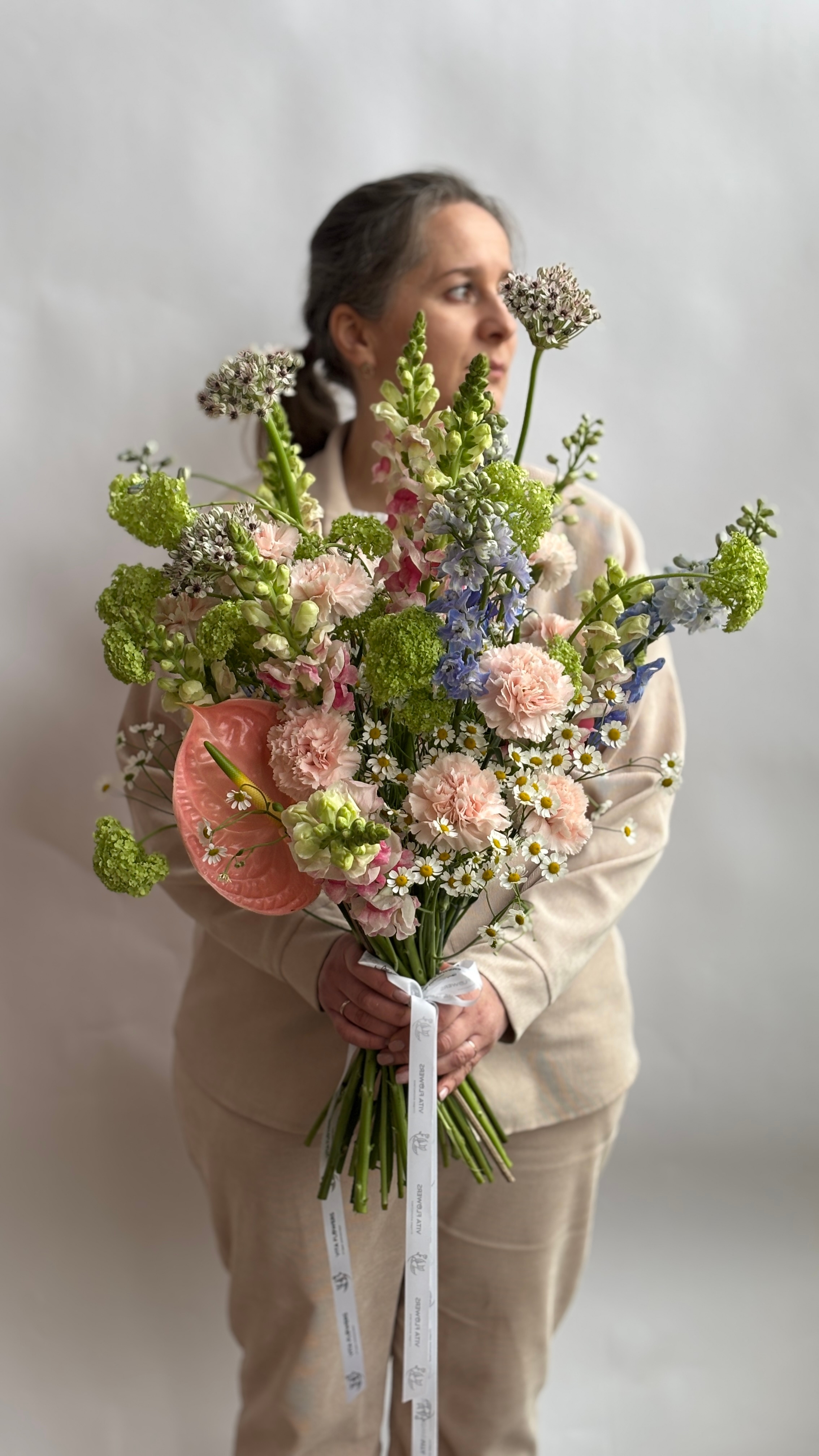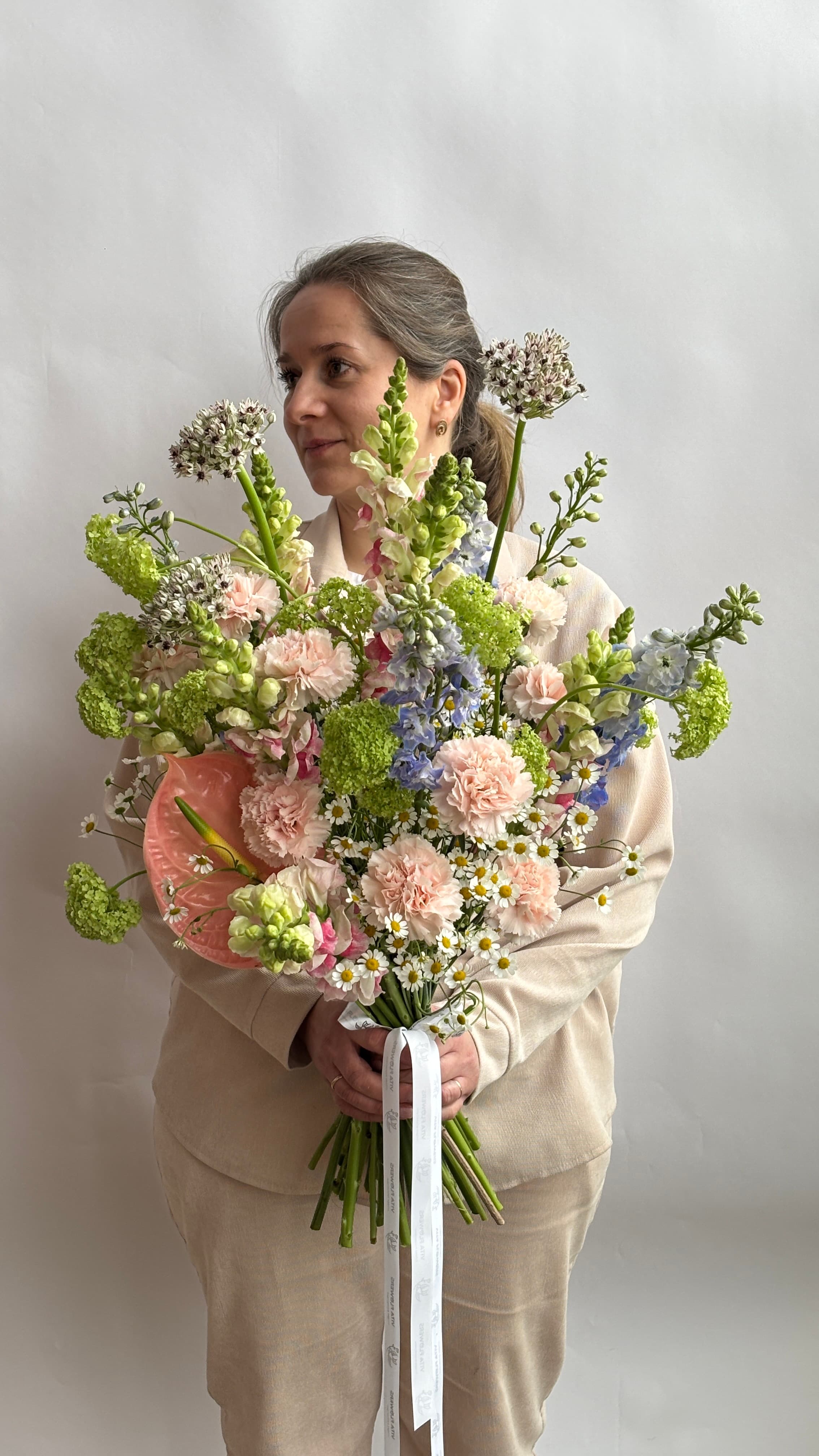 Вибурнум, дельфиниум, антирринум, диантусы, ромашка (танацетум), антуриум и аллиум создают выразительный контраст форм и высот.