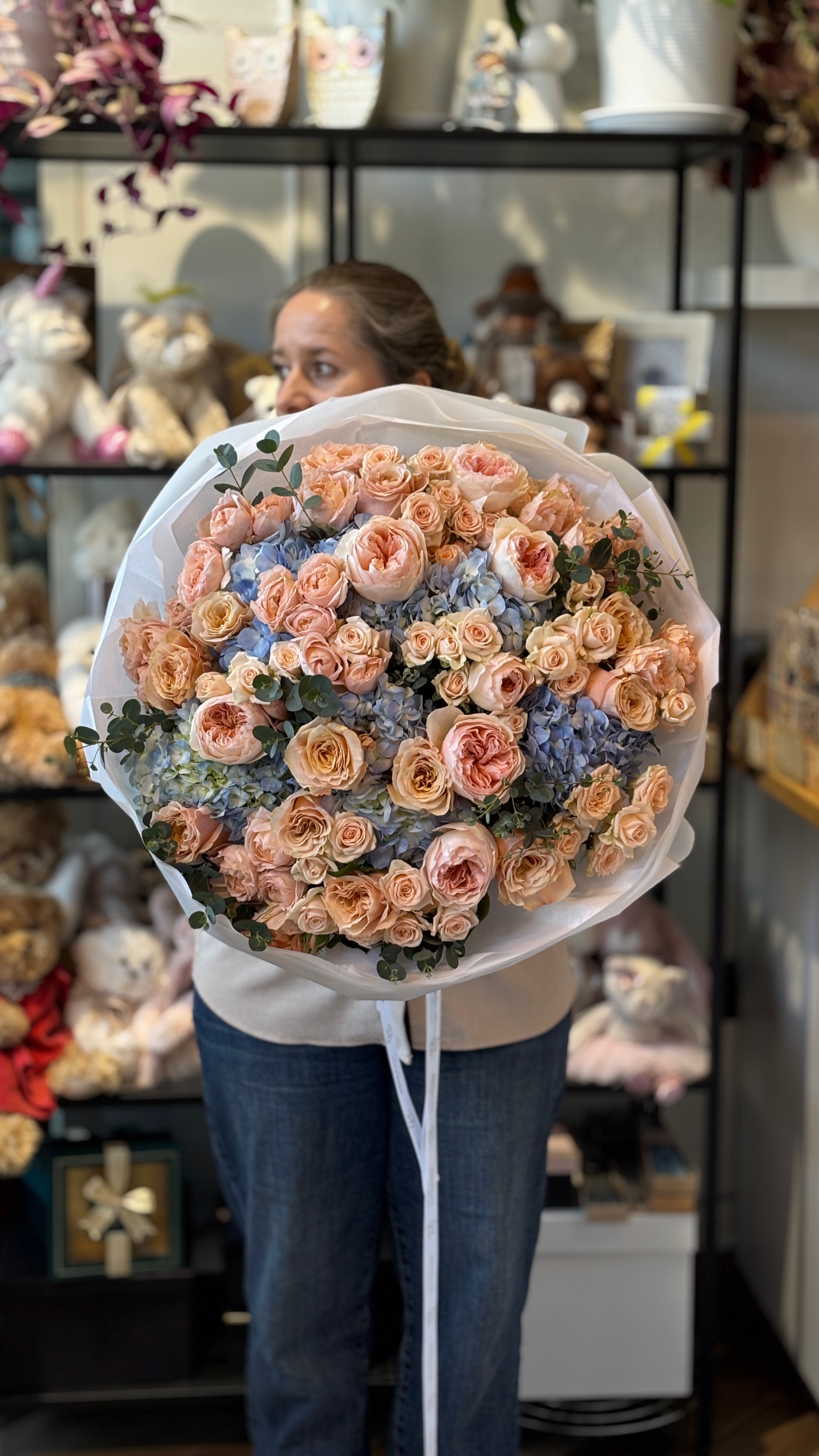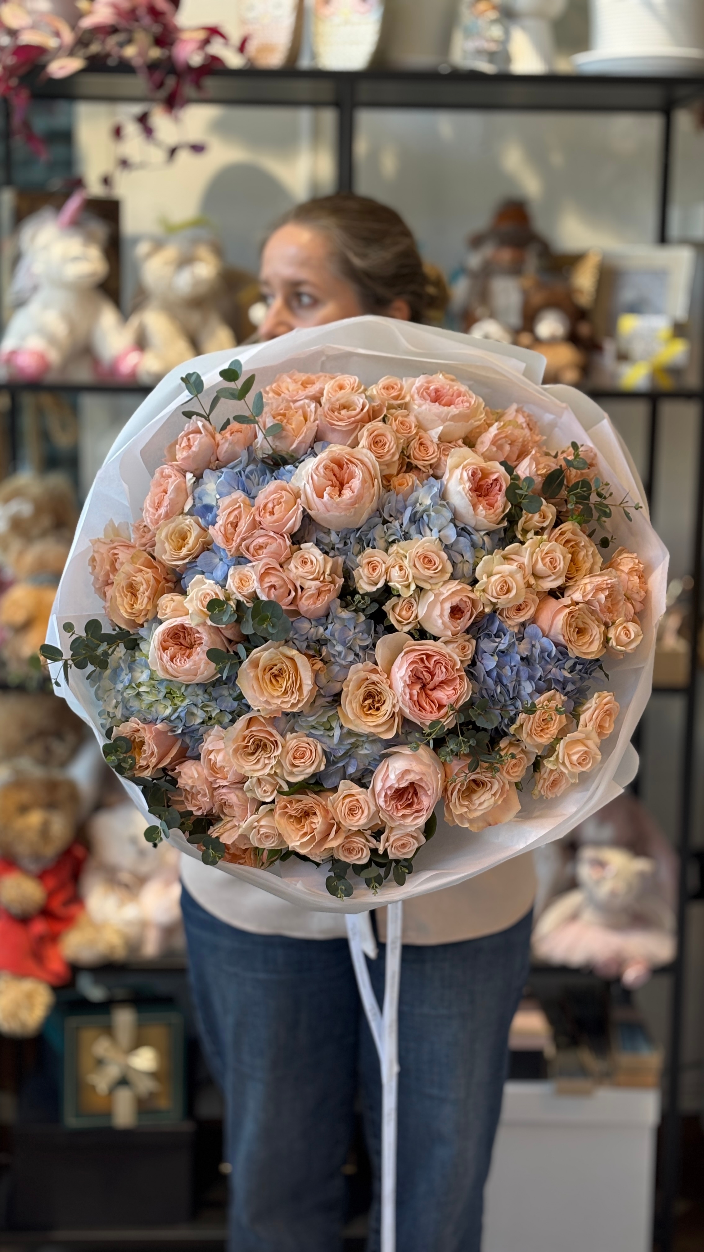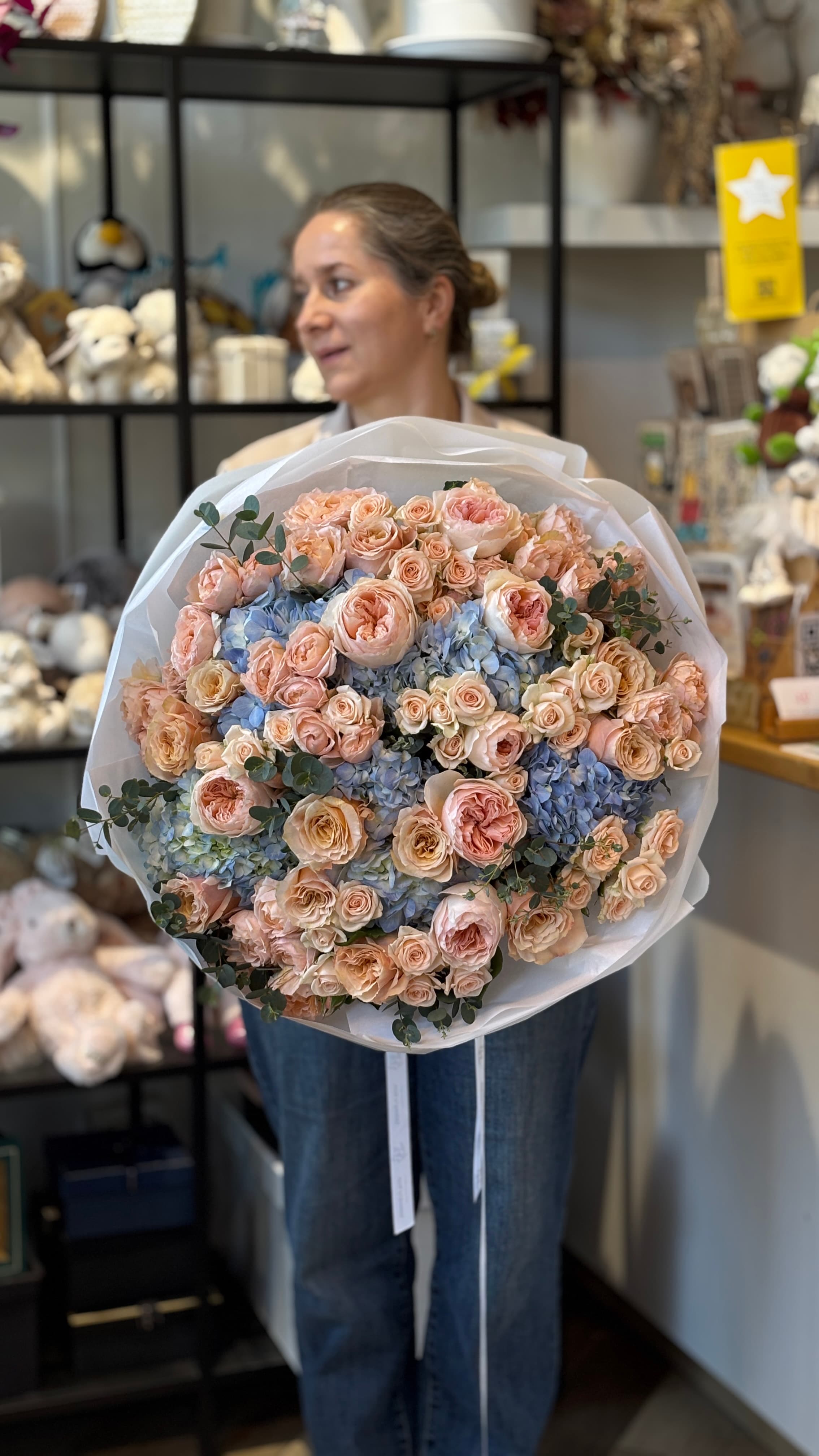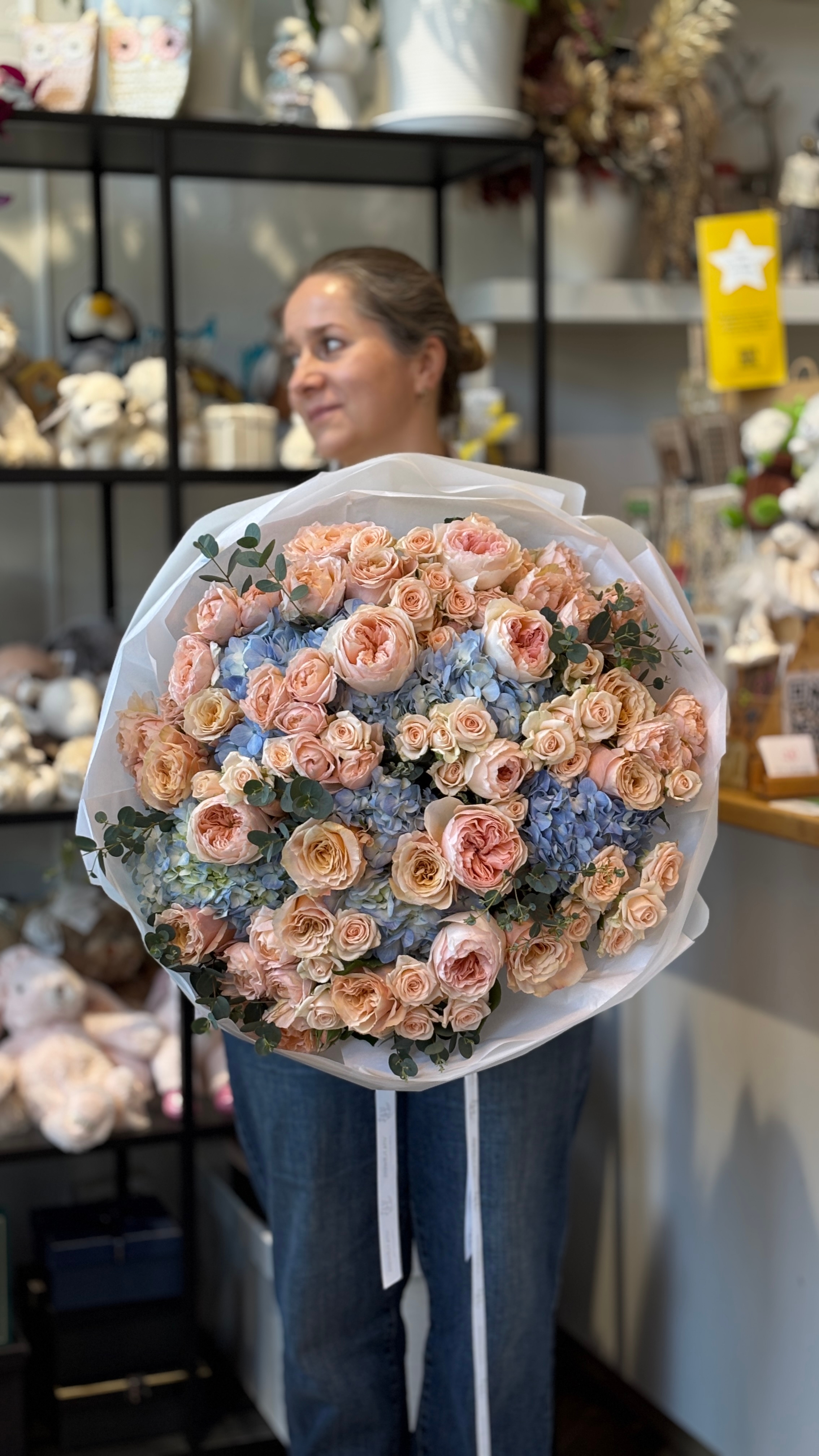 Роза Эквадор, гортензия, пионовидная роза, кустовая роза Джульетта, классическая кустовая роза и высокий эвкалипт создают плотный и многослойный образ.