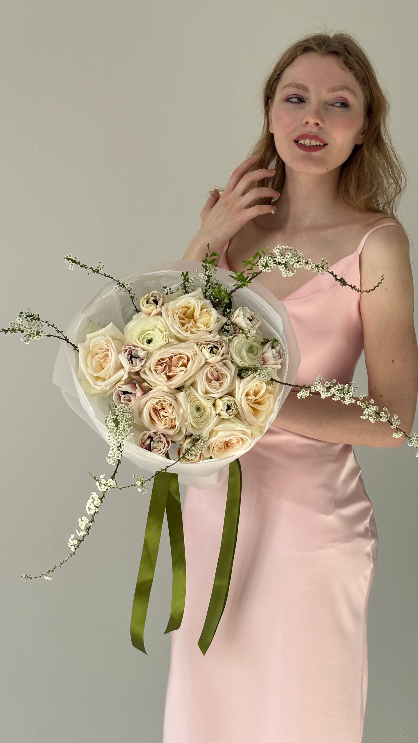 Композиция собрана из спиреи, пионовидной розы, пионовидного тюльпана и ранункулюса. Сочетание схожих по форме бутонов создаёт мягкий, цельный визуальный объём с плавными переходами.