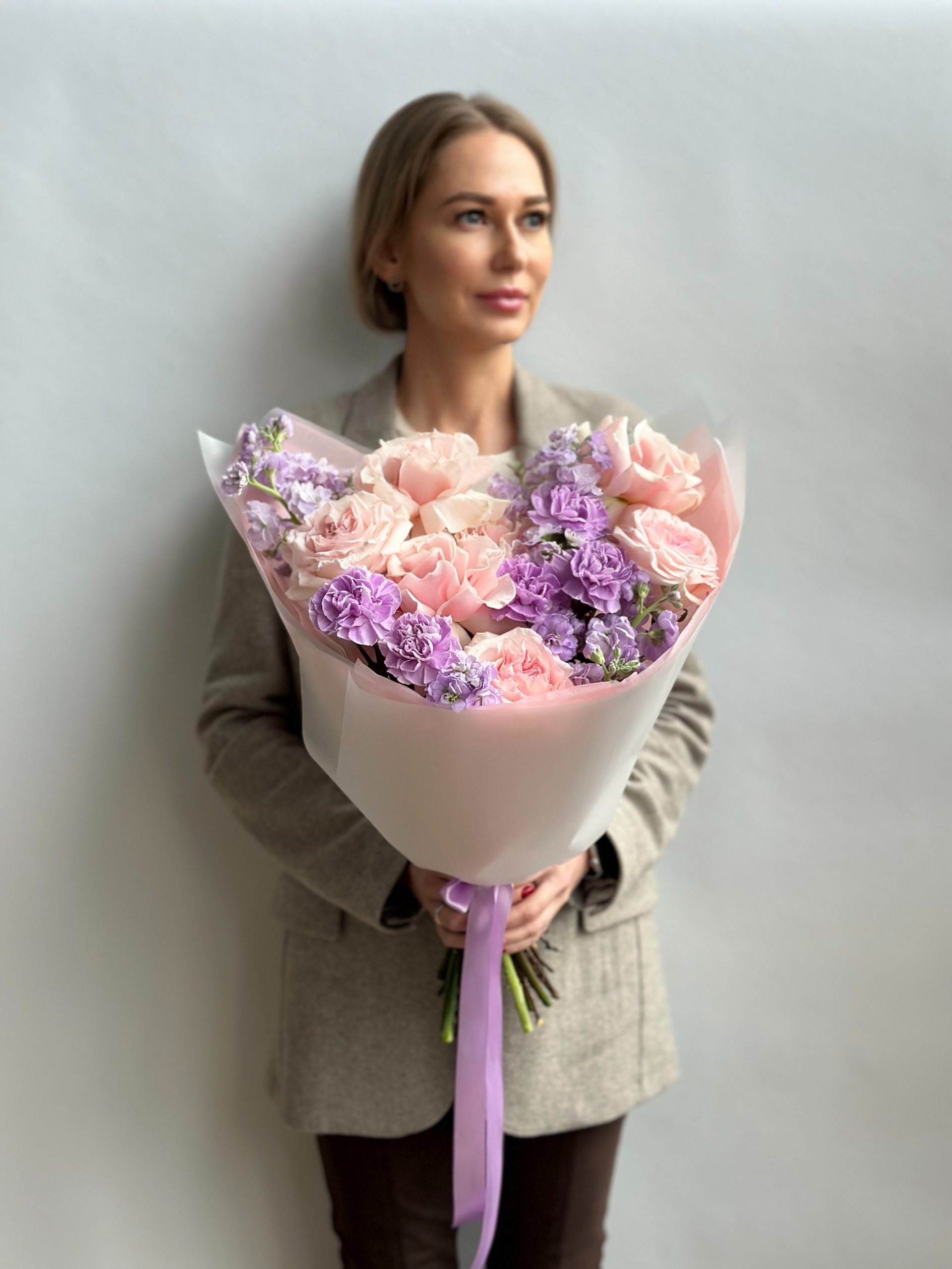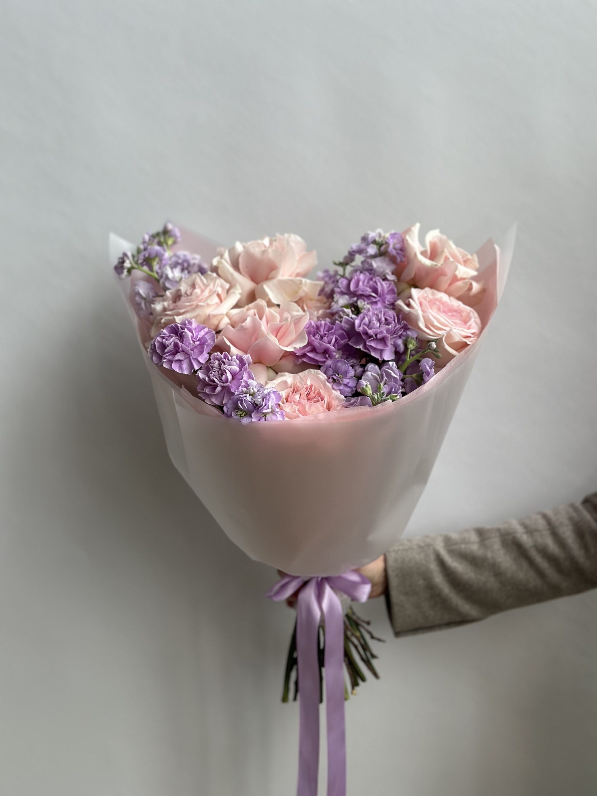 Букет с пионовидными розами, маттиолой и гвоздикой