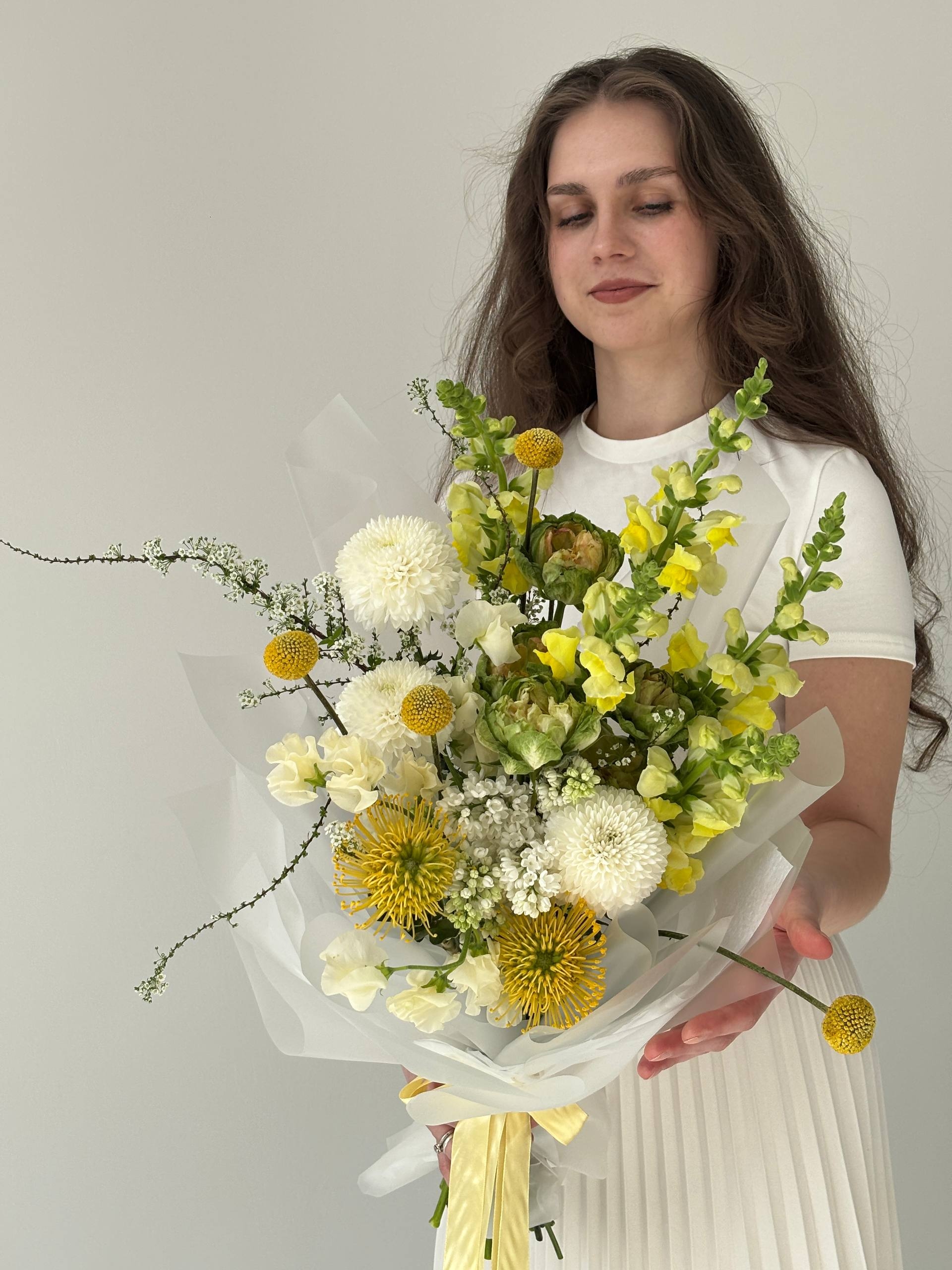 Композиция собрана из одноголовой розы Эквадор, хризантемы, краспедии, антирринума, сирени, спиреи, леукоспермума и латируса. Разные формы и текстуры создают сложный объём с акцентом на естественную садовую структуру.
