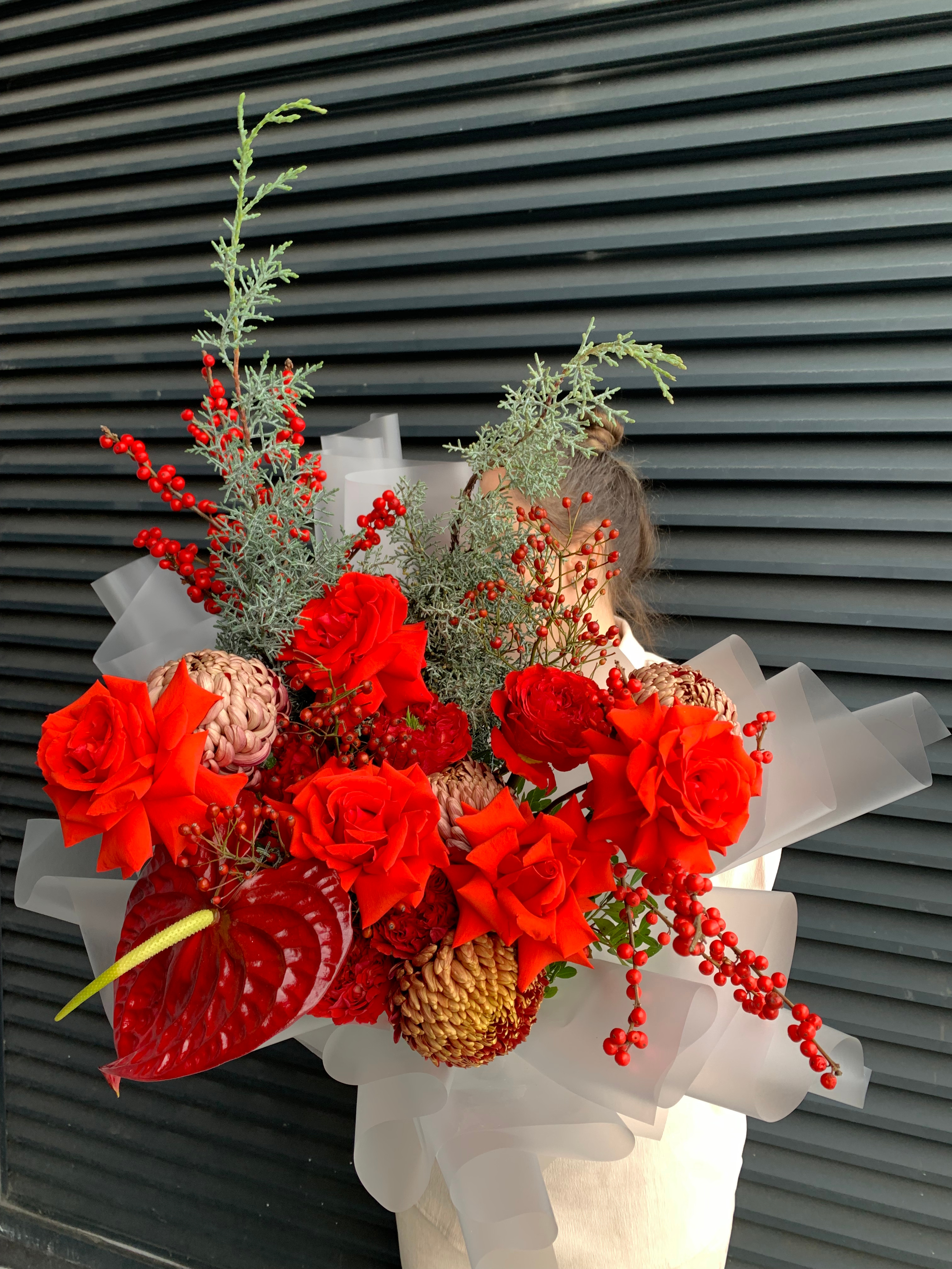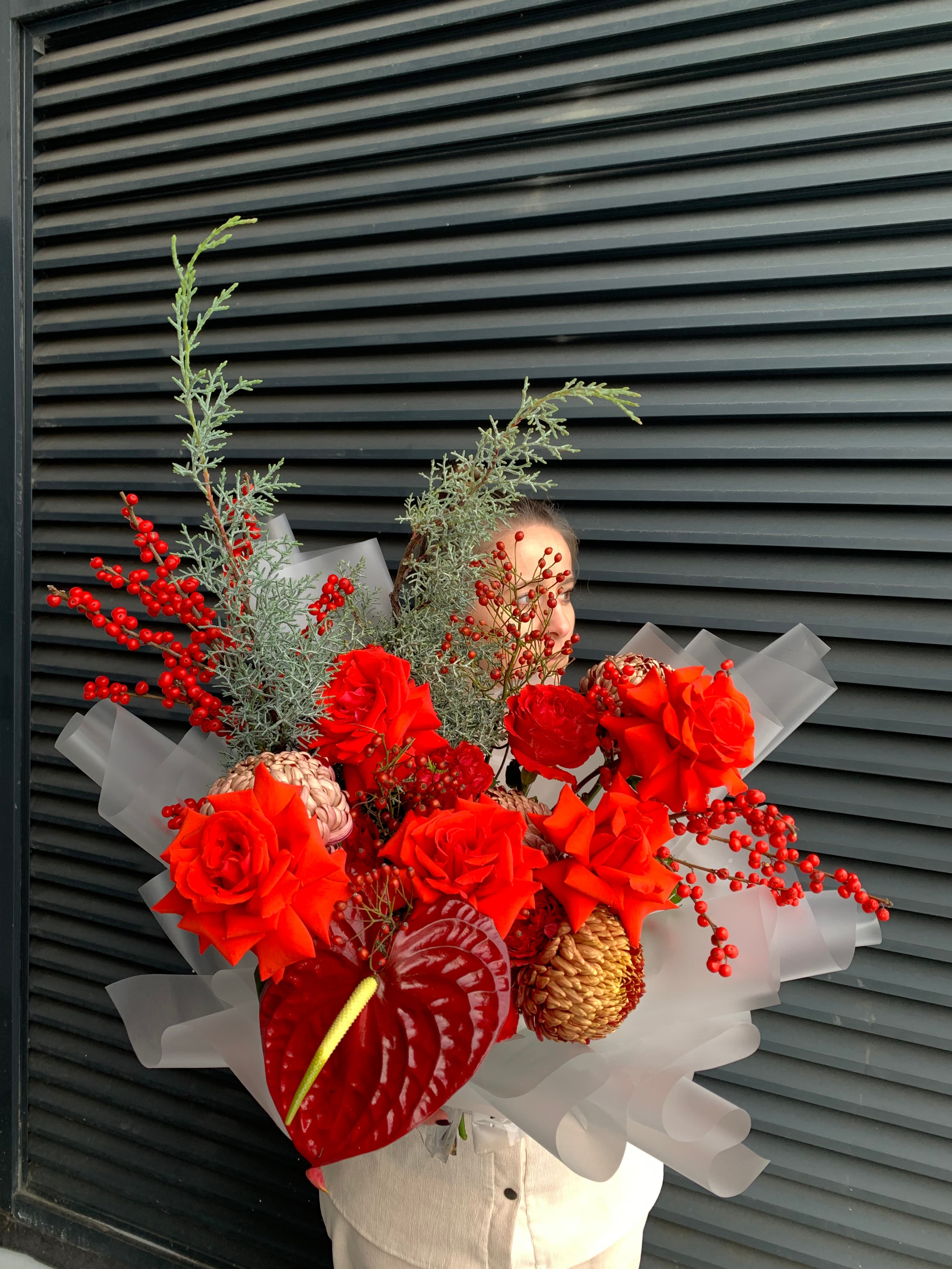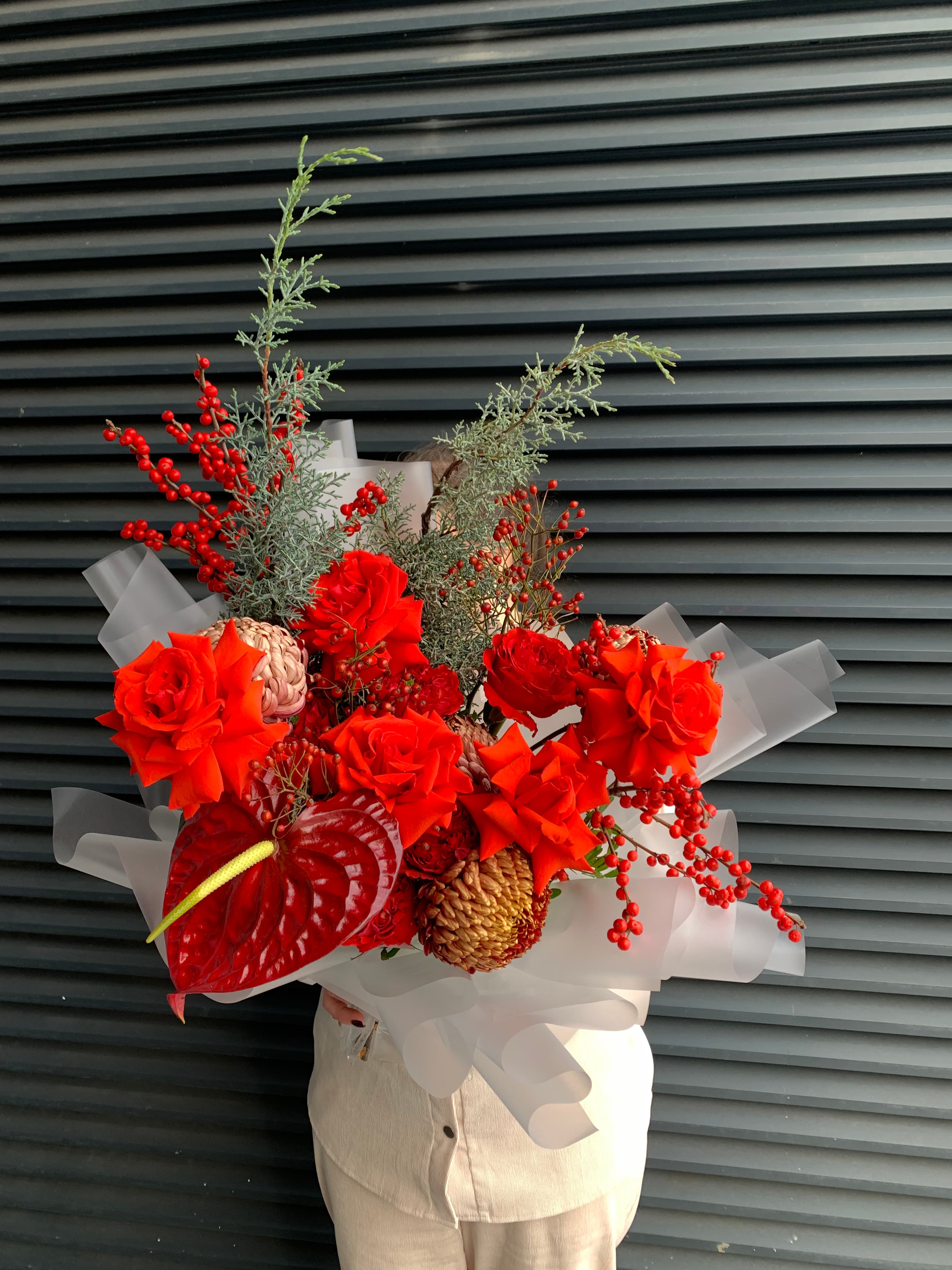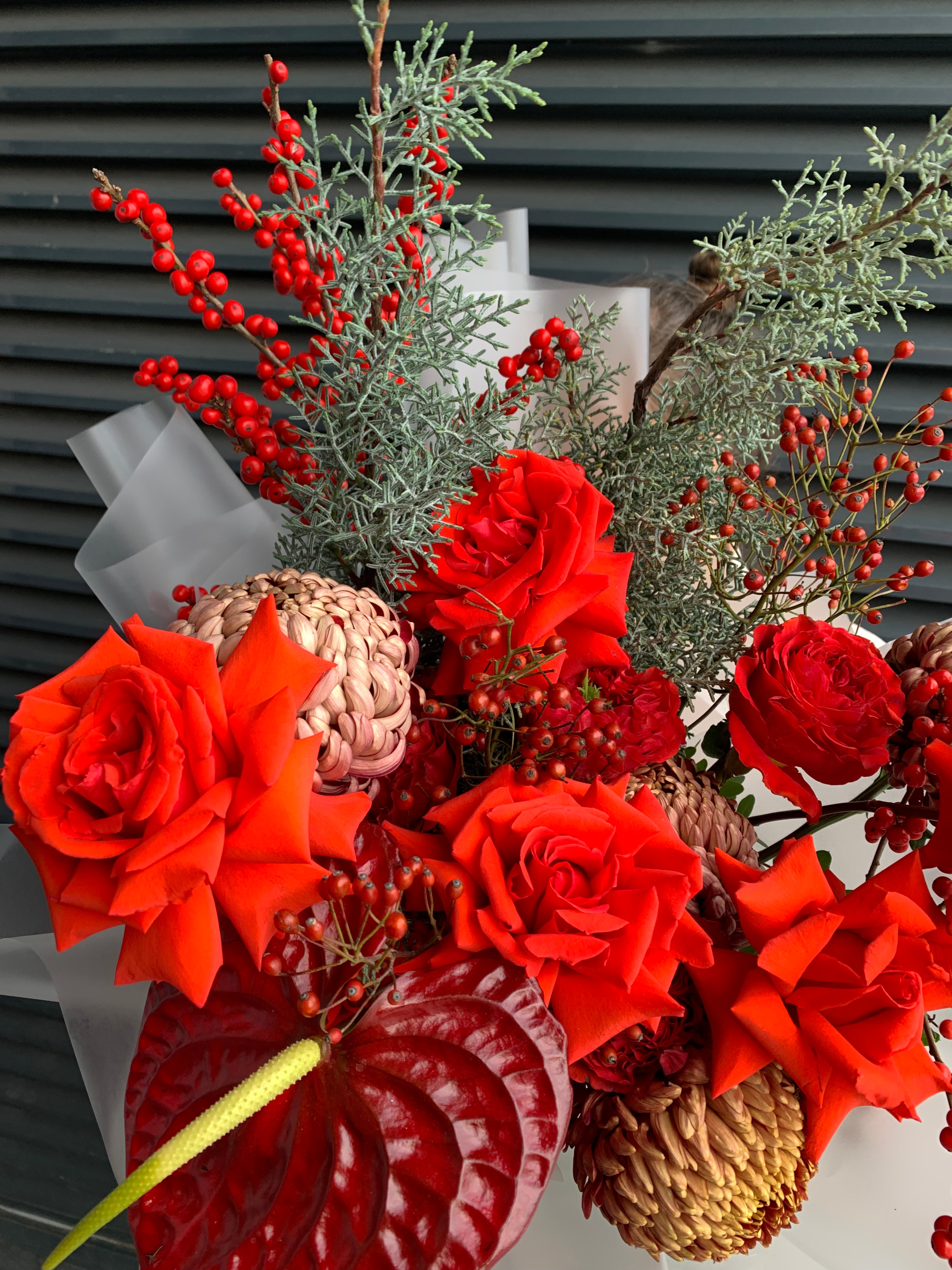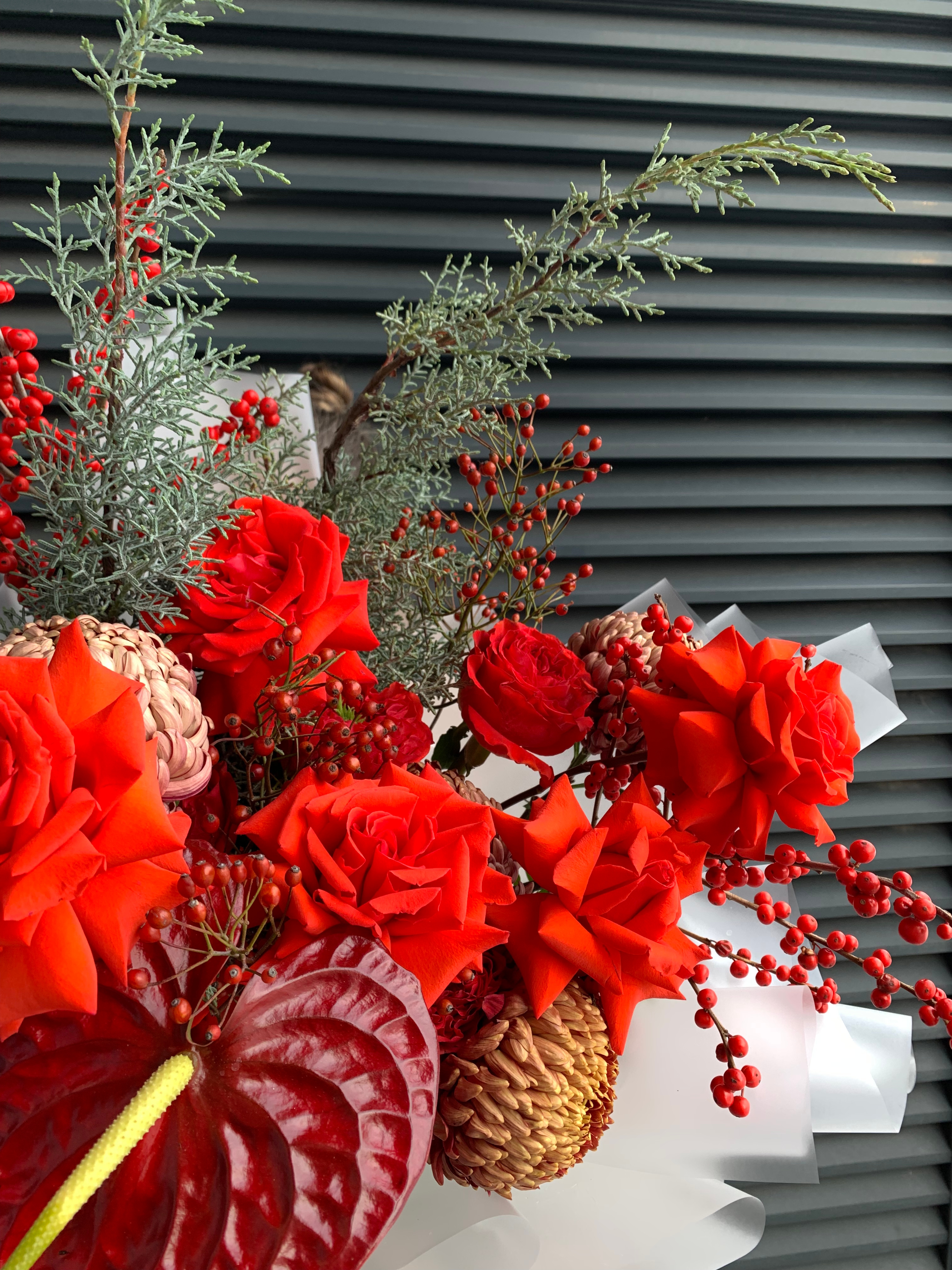 Композиция объединяет эквадорскую розу, антуриум, одноголовую хризантему и хвойный микс. Илекс и ягоды шиповника добавляют цветовой акцент и подчёркивают зимнее настроение.