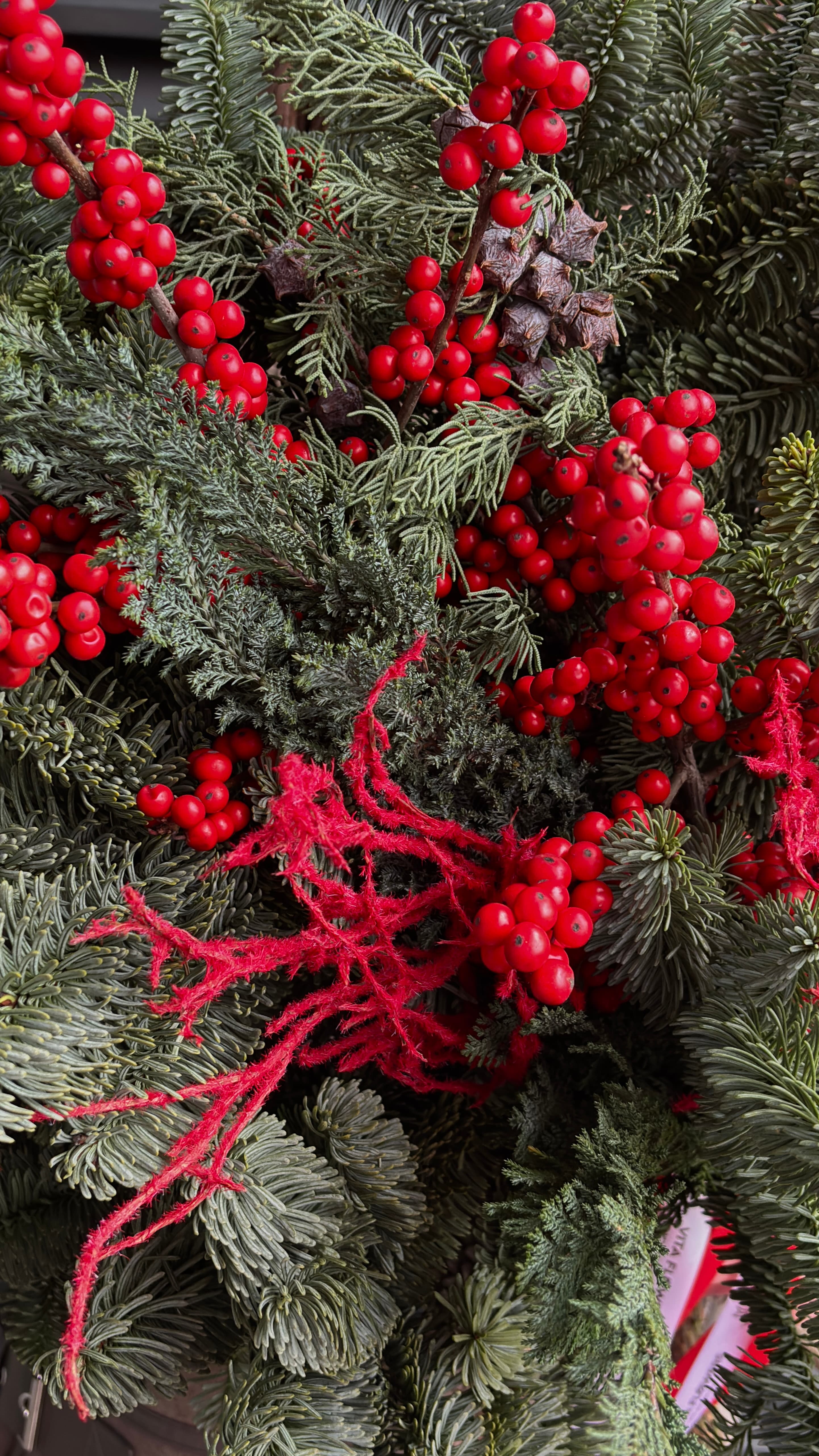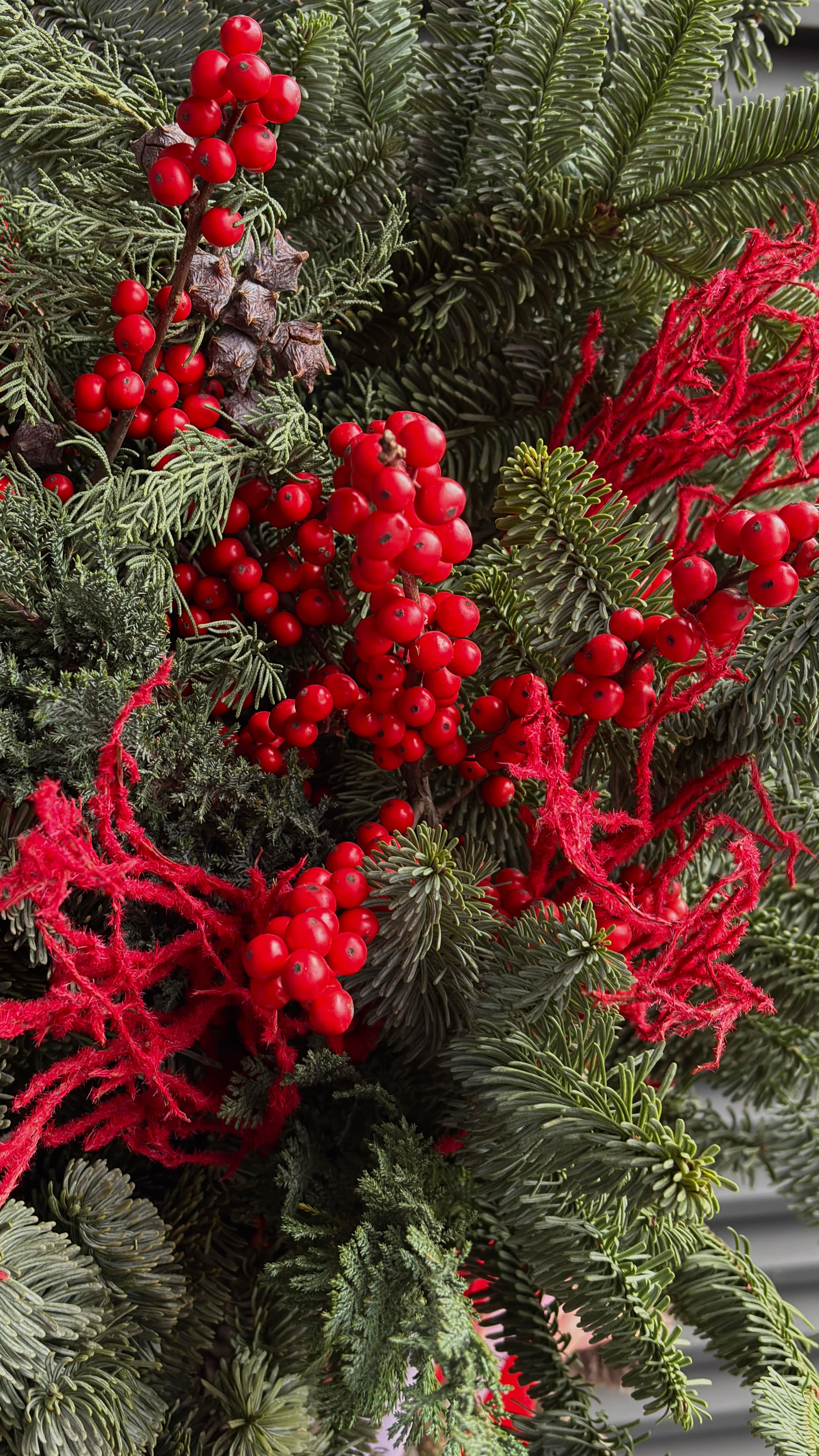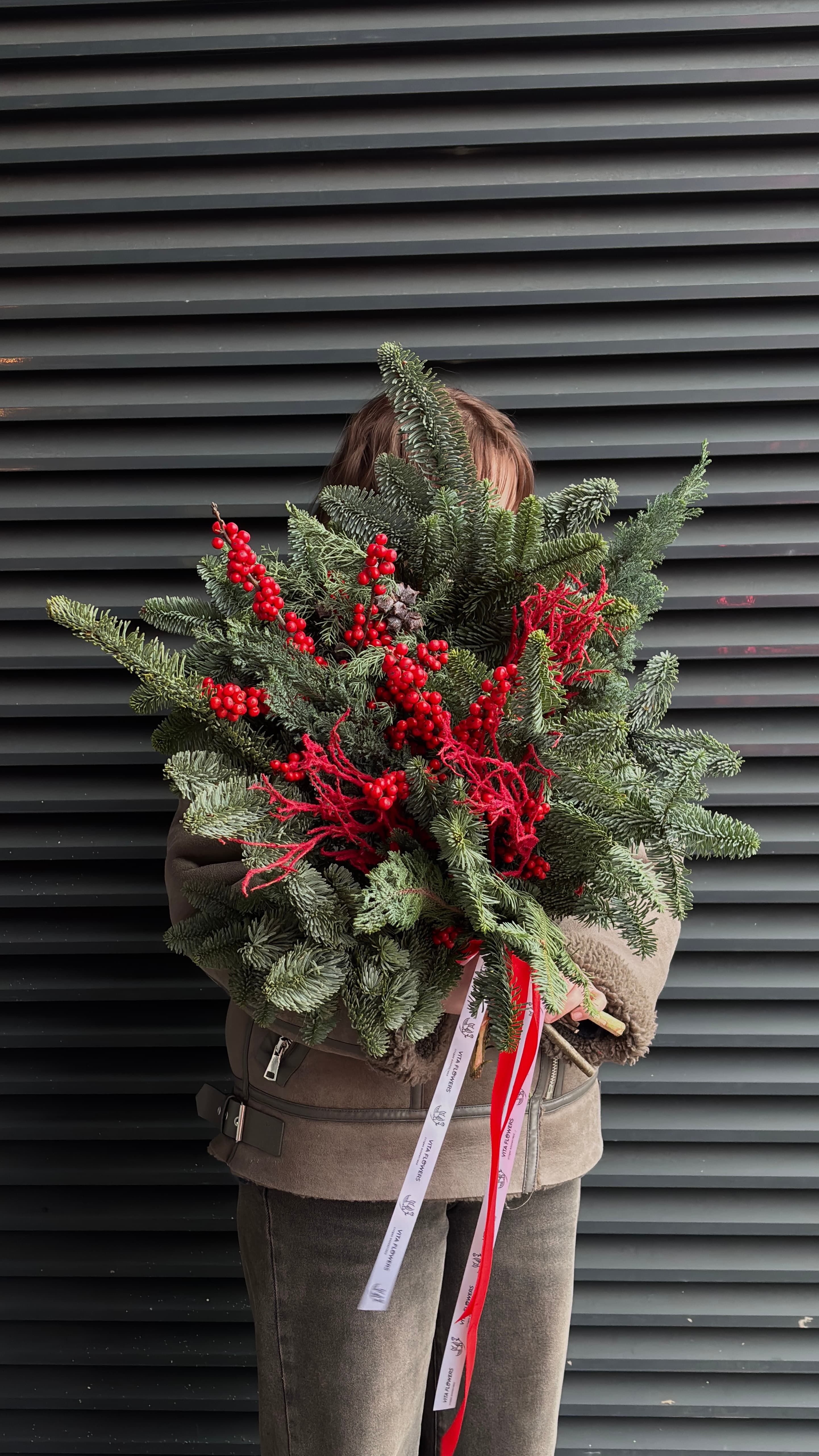 Зимняя композиция выполнена из нобилиса, хвойного микса, илекса и заснеженного рускуса. Контраст насыщенной зелени и светлых акцентов создаёт выразительный и атмосферный образ.