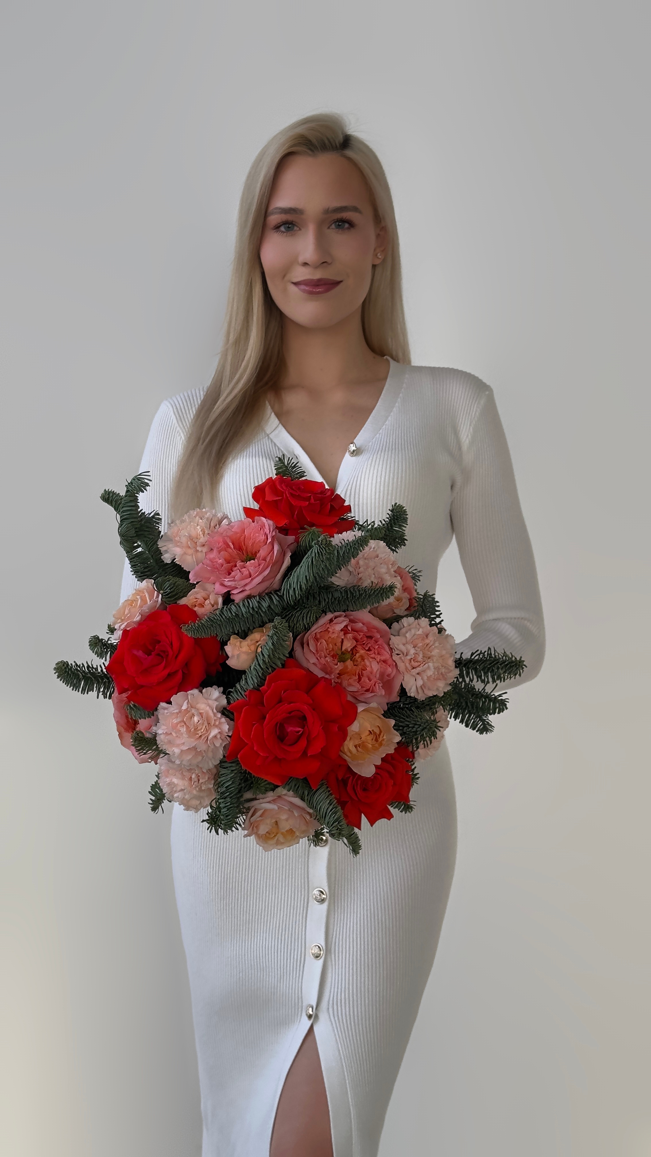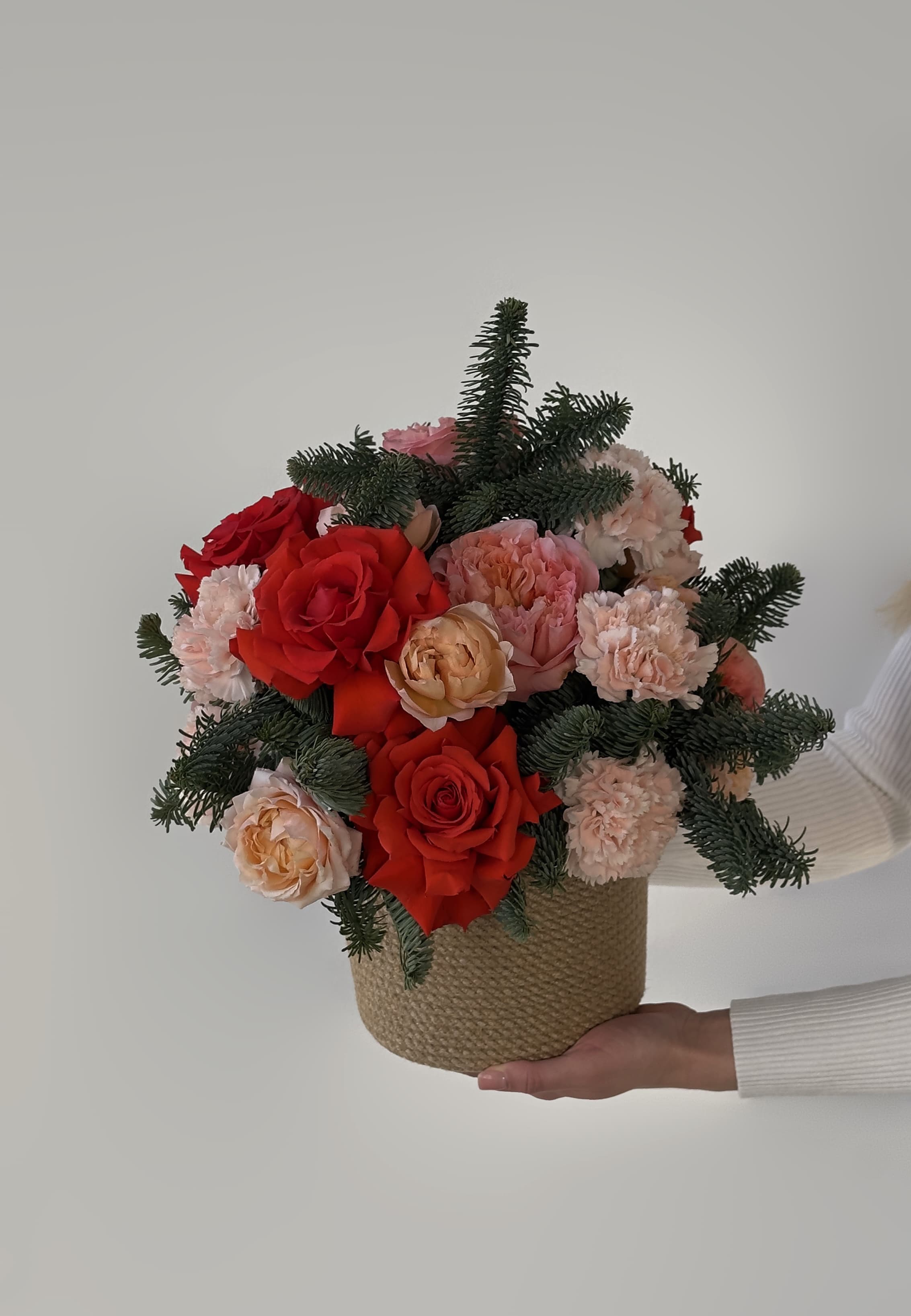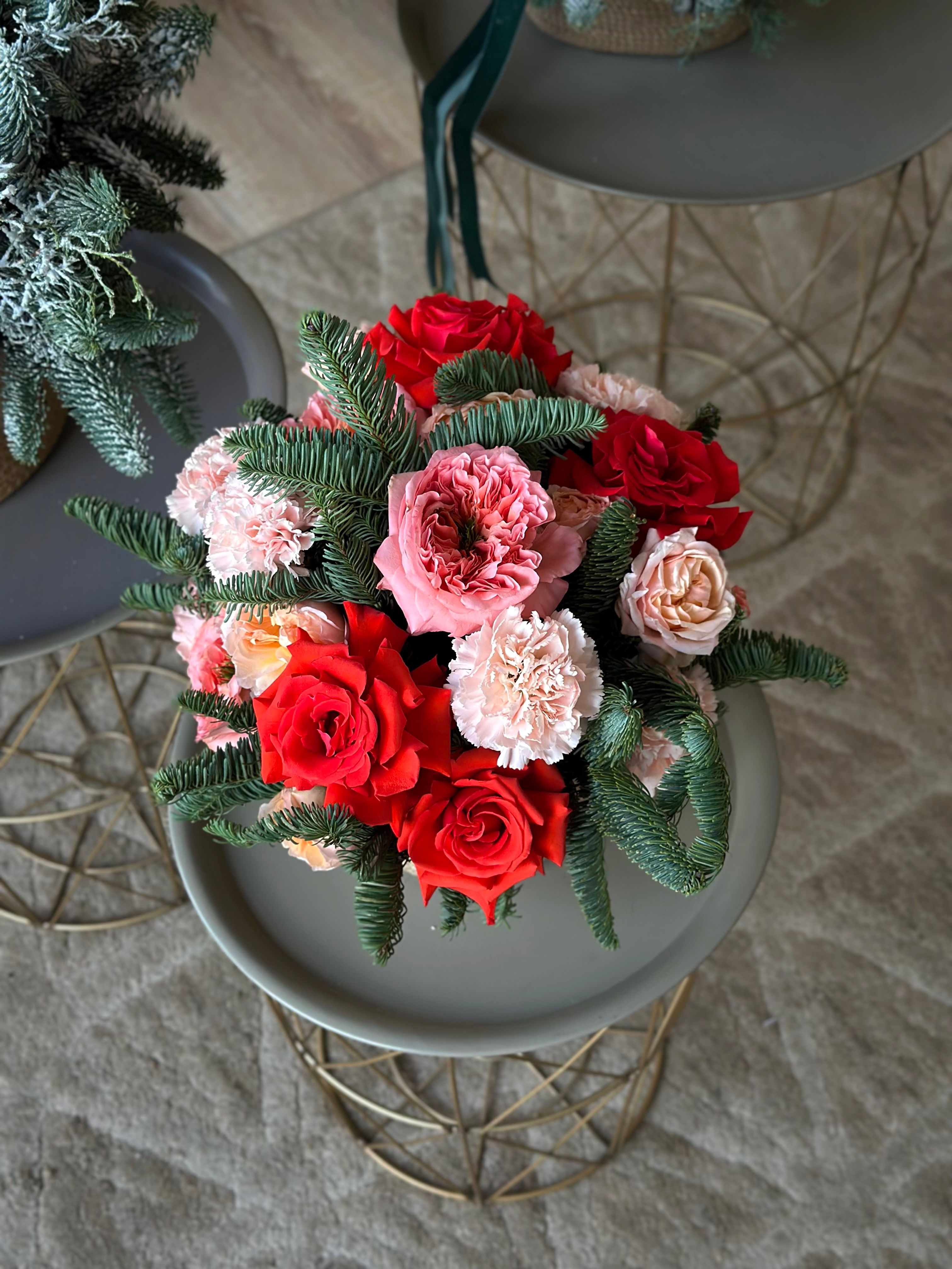 Композиция подойдёт для зимнего подарка, праздничного поздравления или украшения интерьера. Сочетание хвои и роз выглядит благородно и создаёт ощущение уюта и тепла.