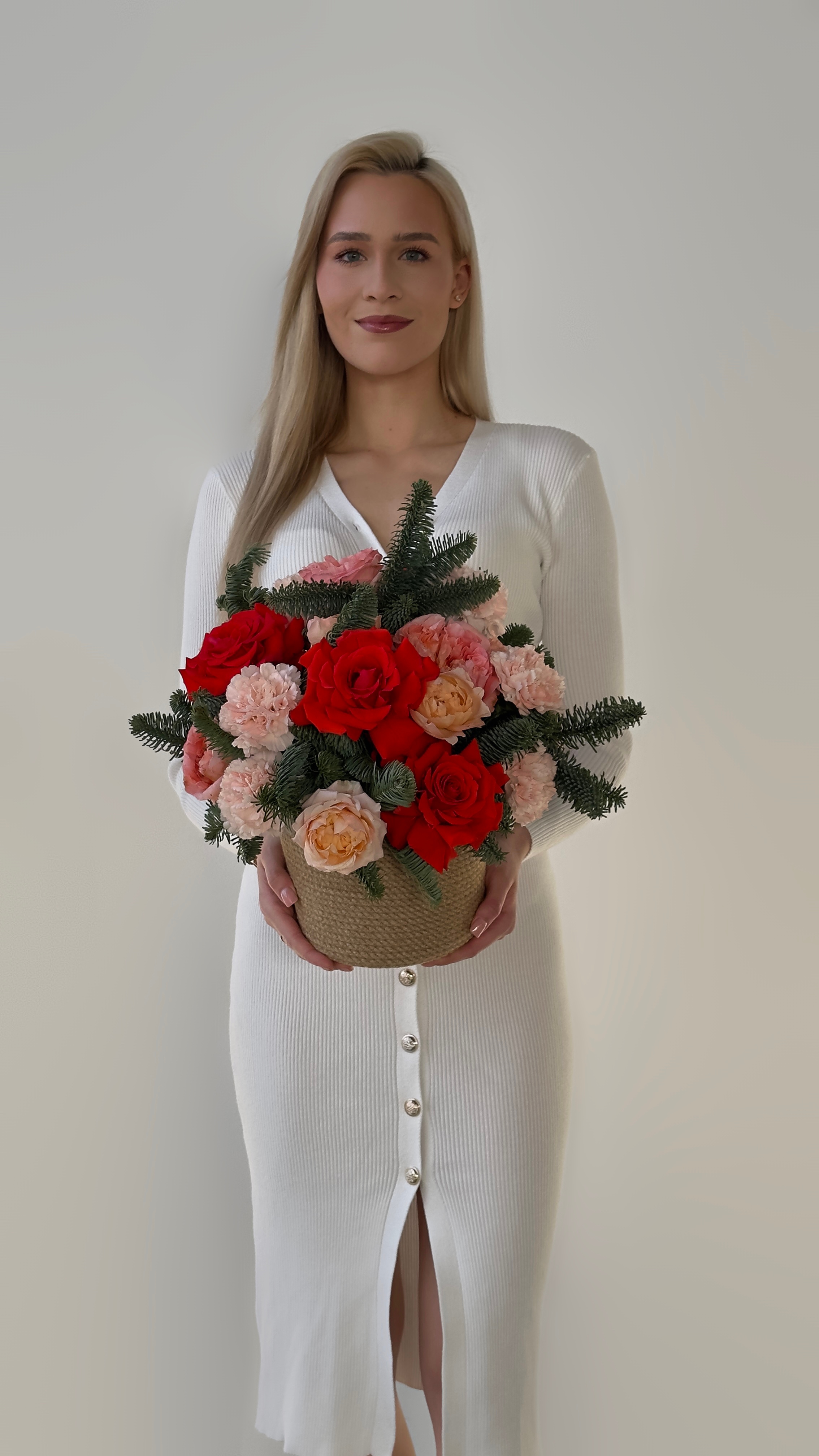 Элегантная композиция в плетёном кашпо сочетает эквадорские розы, кустовые розы сорта Джульетта, диантусы и свежий нобилис. Цветы размещены в живом оазисе, что позволяет сохранить аккуратную форму и сбалансированный объём.