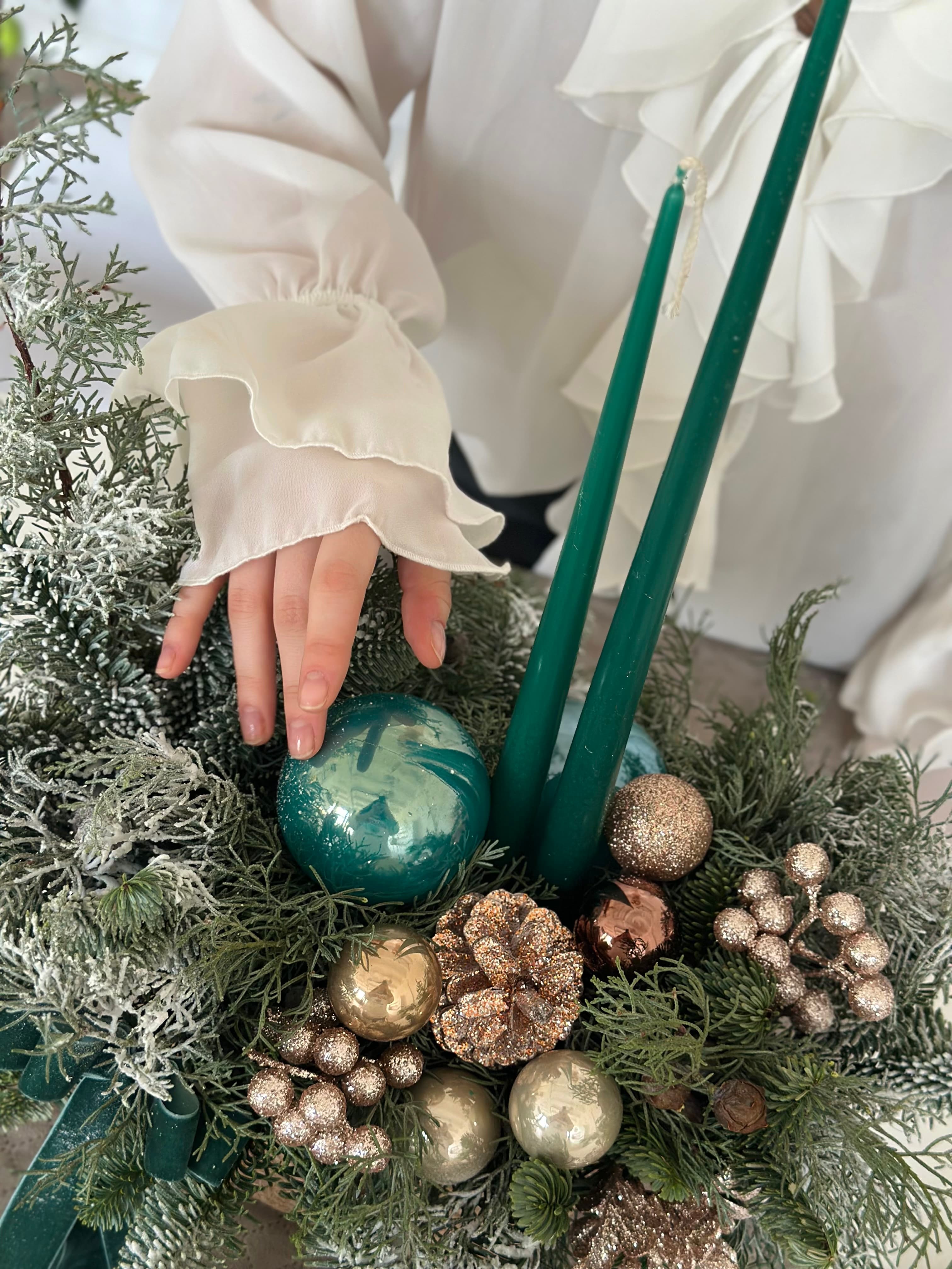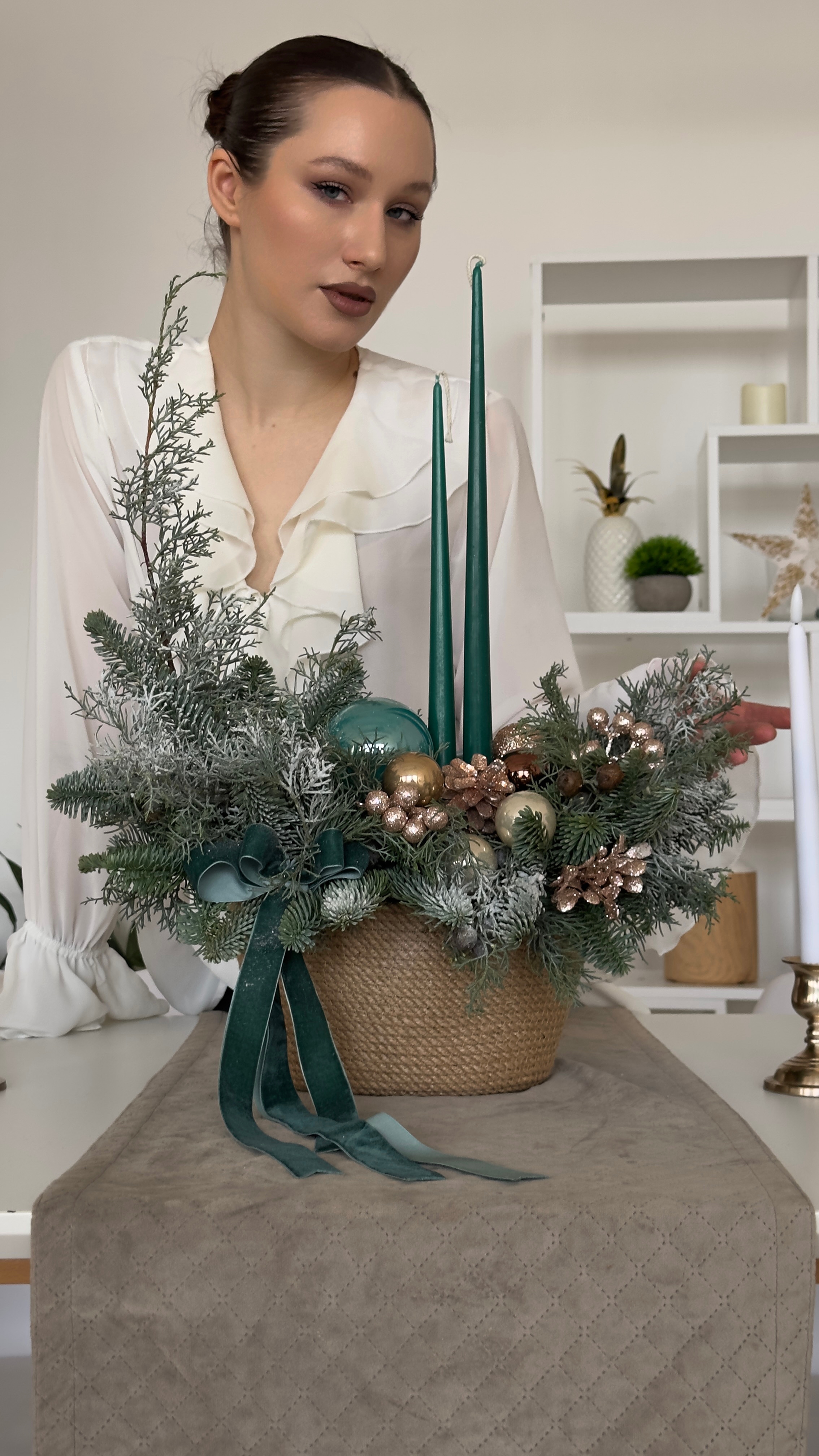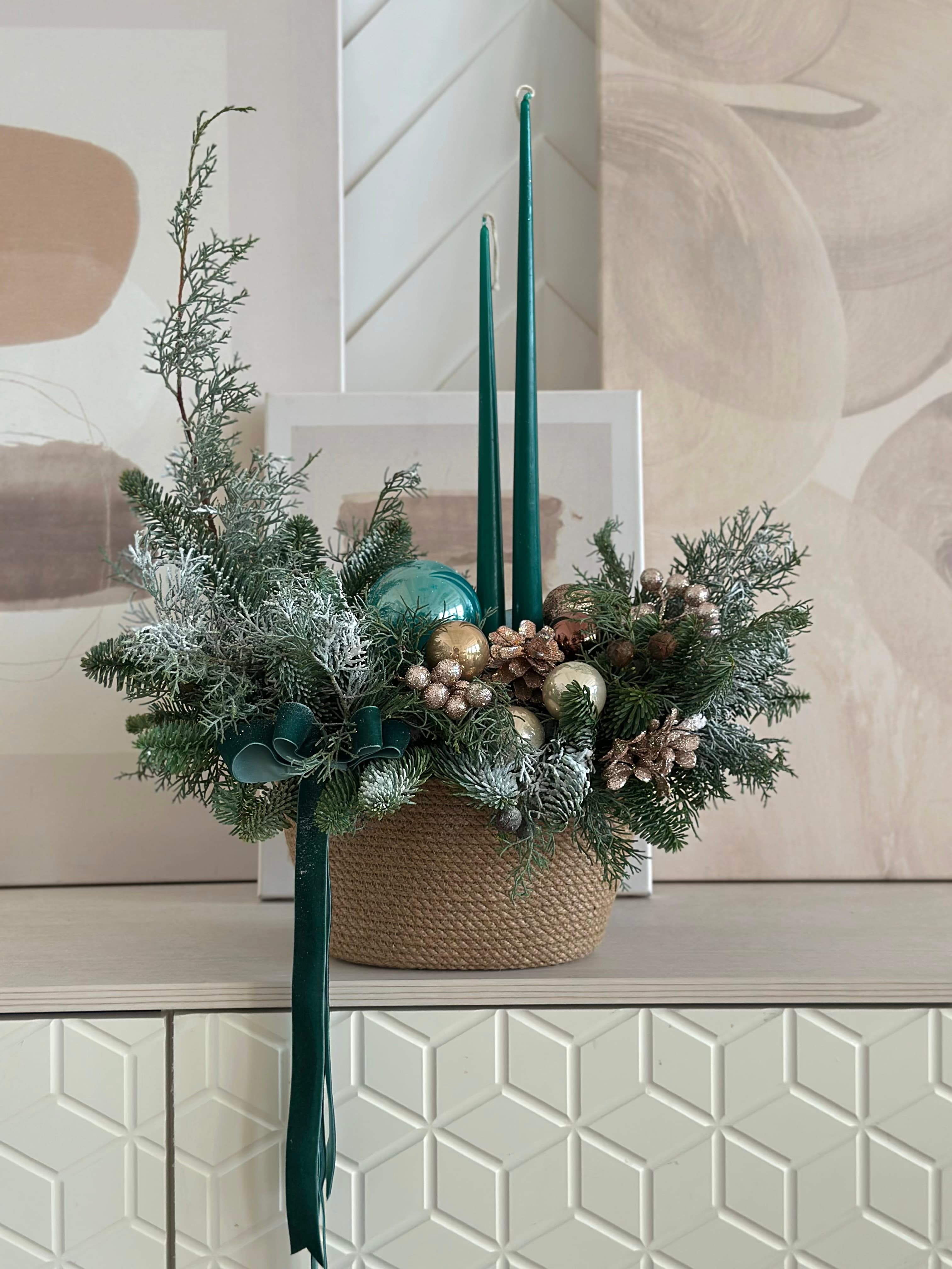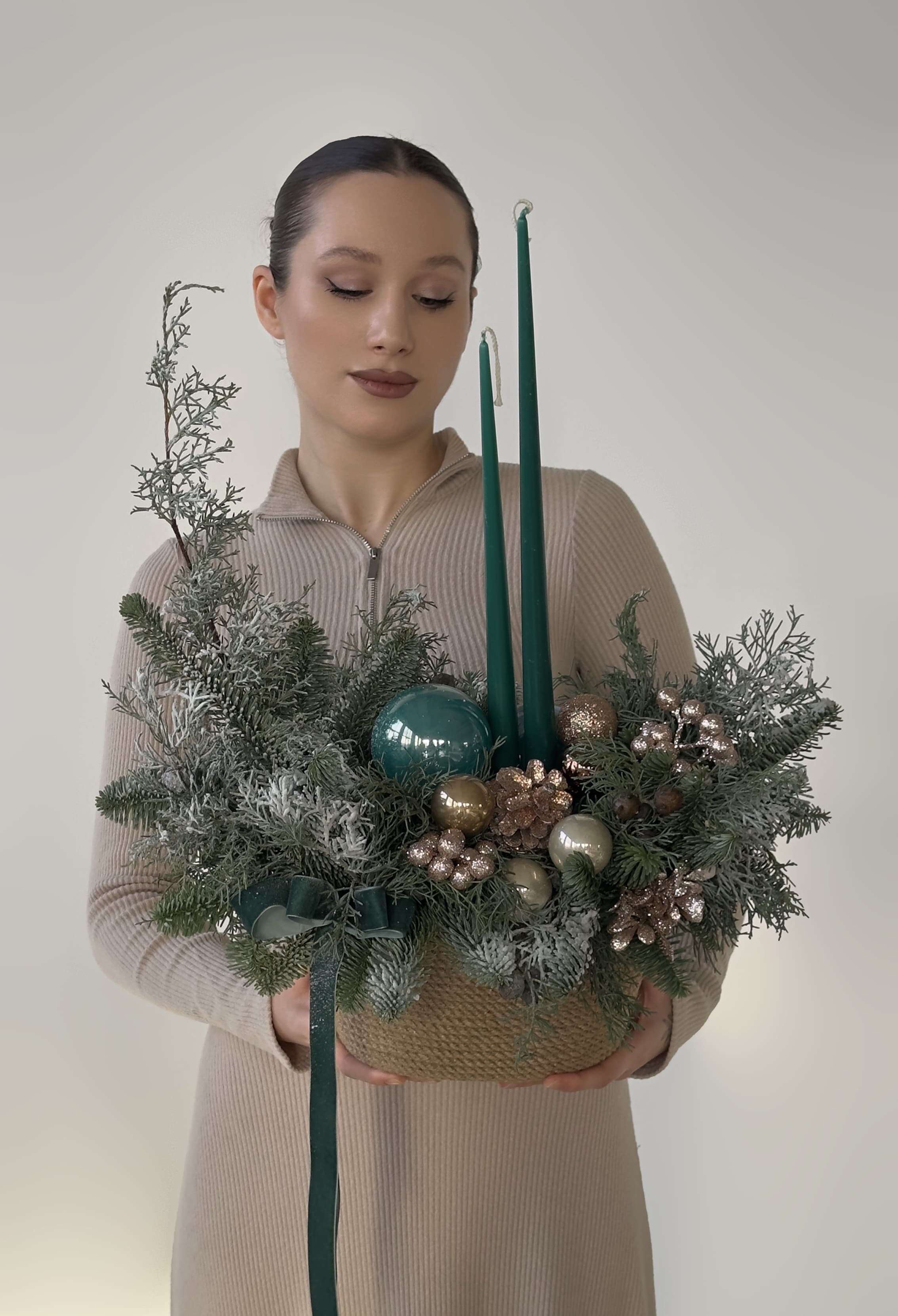 Эта новогодняя композиция объединяет нобилис, хвойный микс и декоративные элементы в плетёном кашпо с живым оазисом. Акцентом служат конические свечи, стеклянные и пластиковые шары, золотая декоративная шишка, бархатная лента и ветки с глиттером.