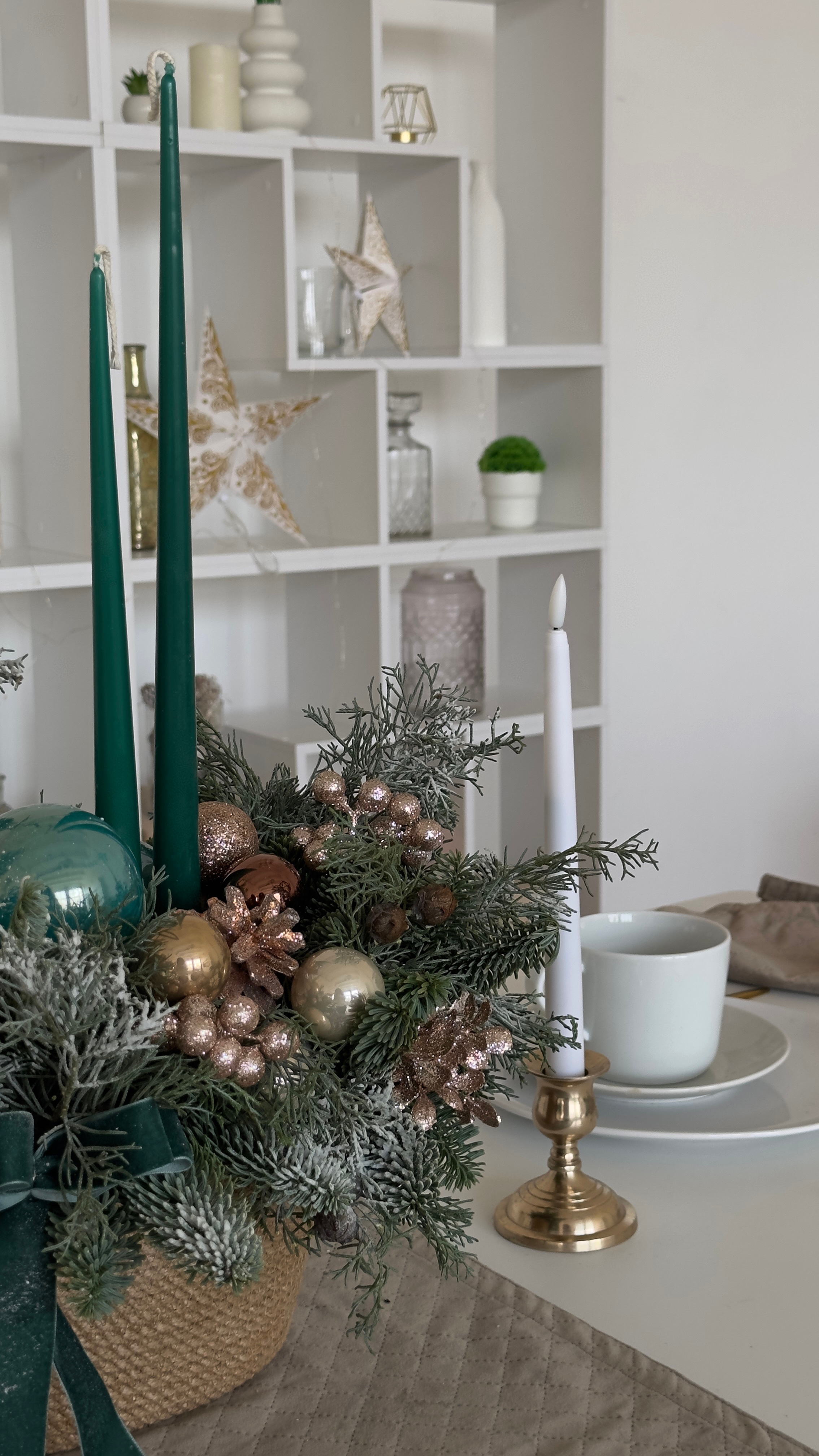 Композиция идеально подойдёт для оформления праздничного стола, гостиной или в качестве атмосферного новогоднего подарка. Она создаёт тёплое и уютное настроение, оставаясь при этом стильной и сдержанной.