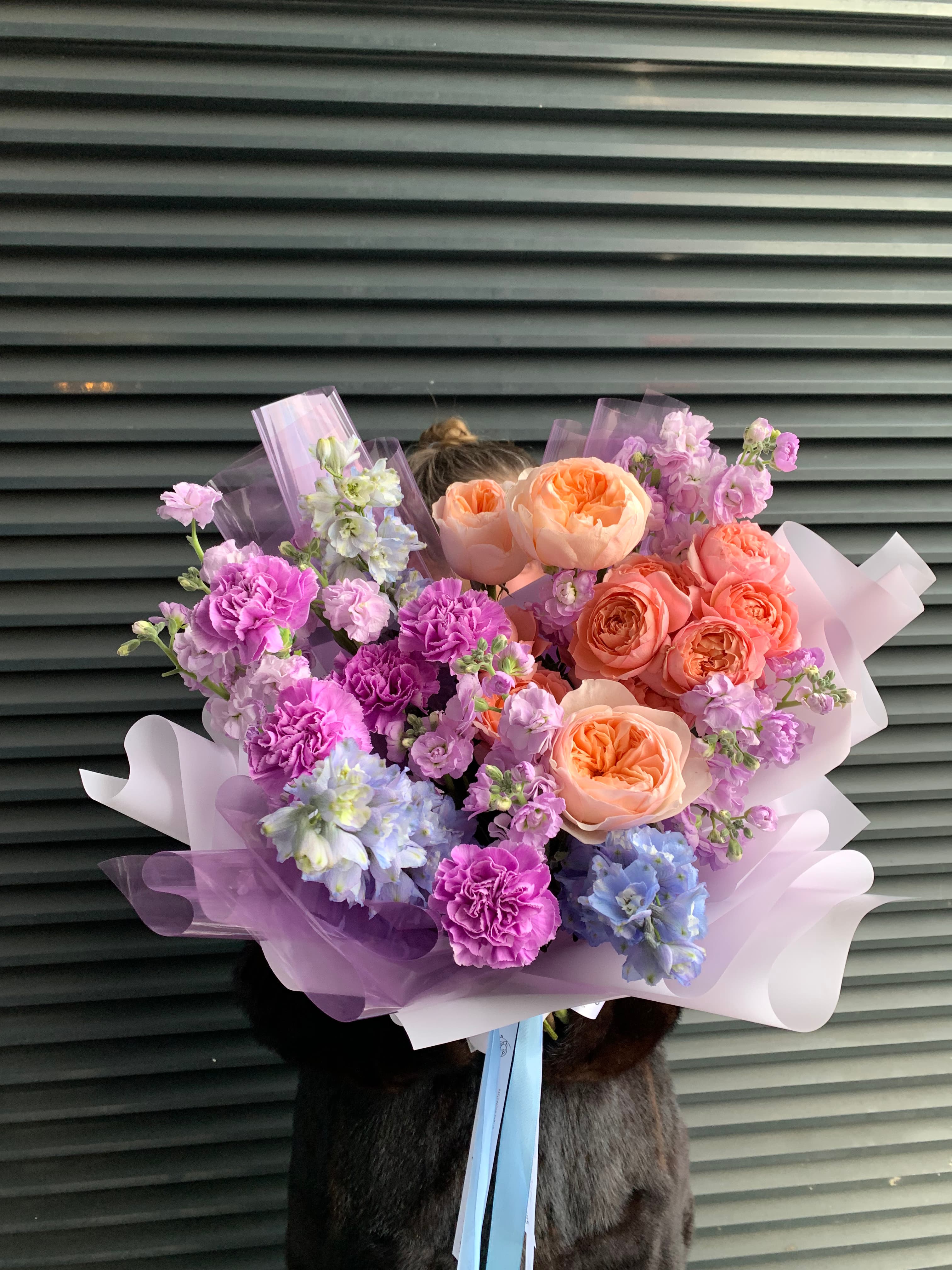 Очаровательный букет с Дельфиниумом, Гвоздикой, кустовой Маттиолой, кустовой и пионовидной Розой. Яркие оттенки и текстуры создают гармоничное сочетание, идеально подходящее для подарка или украшения праздника!